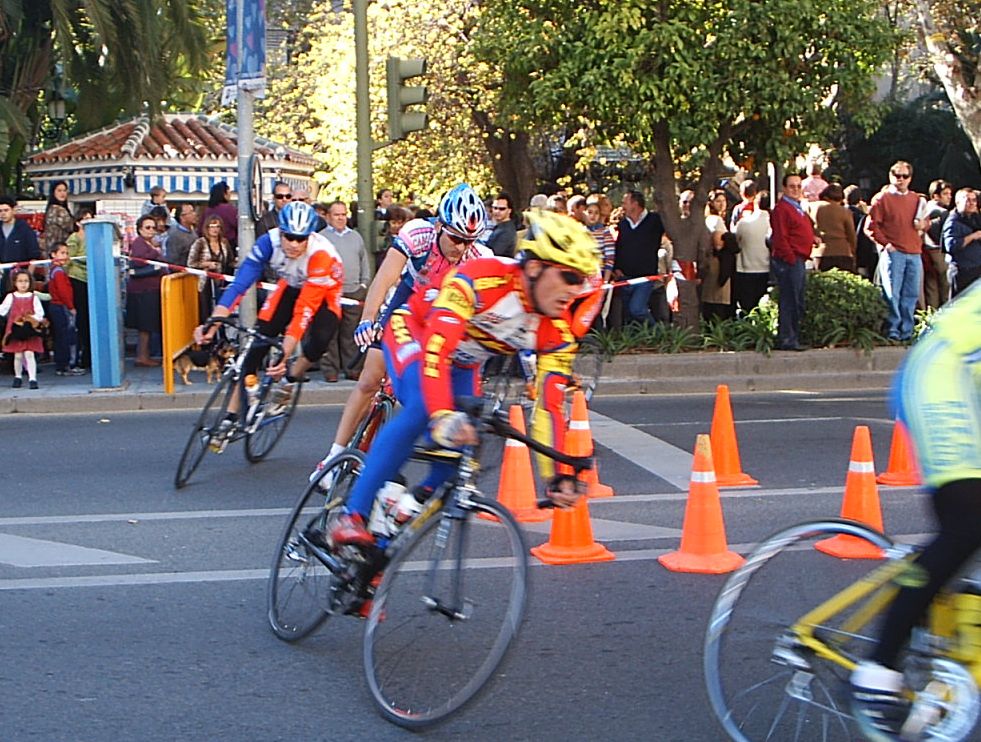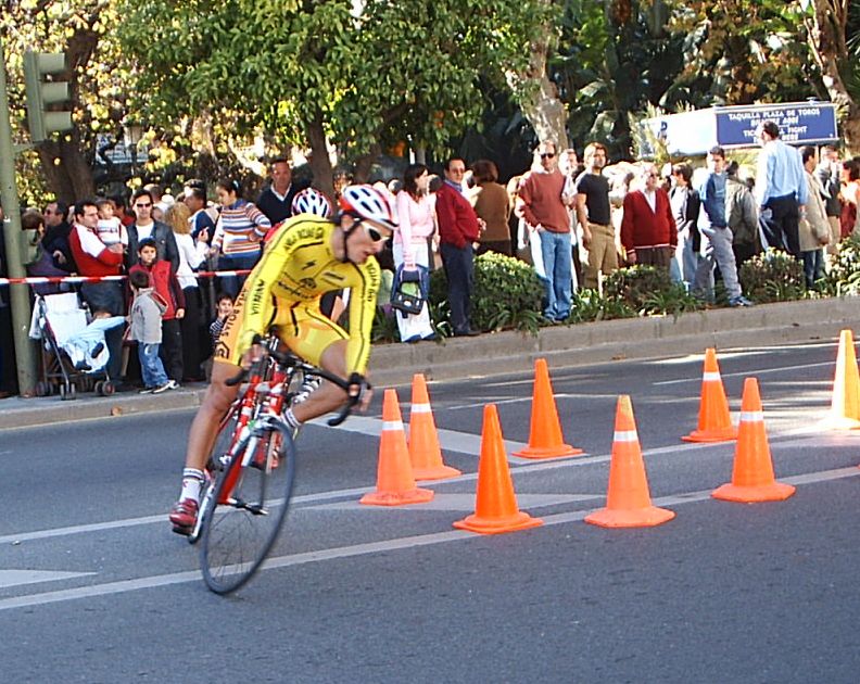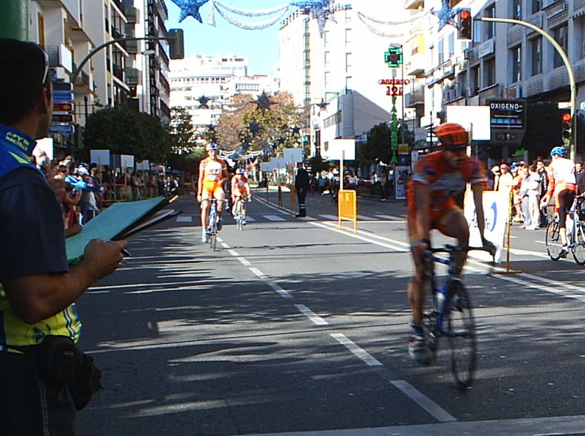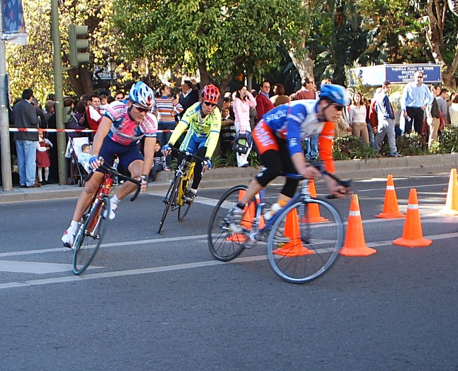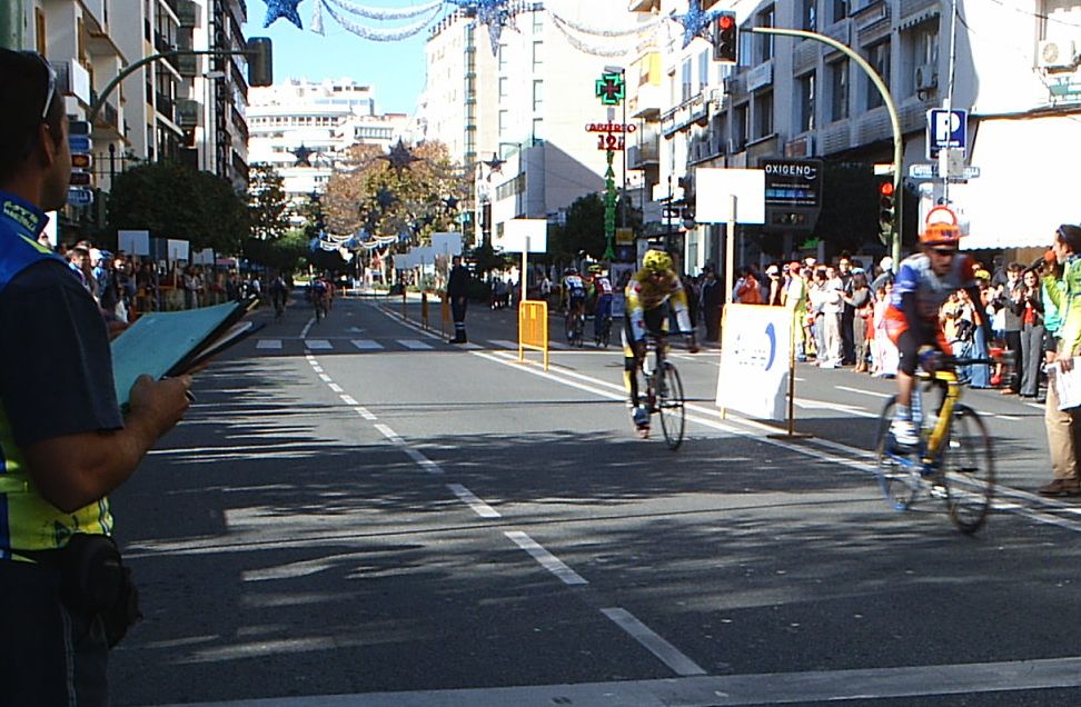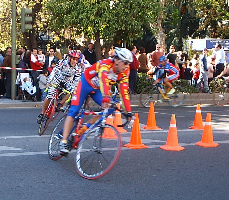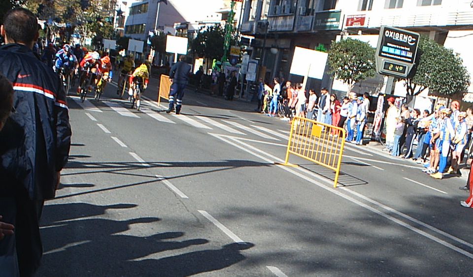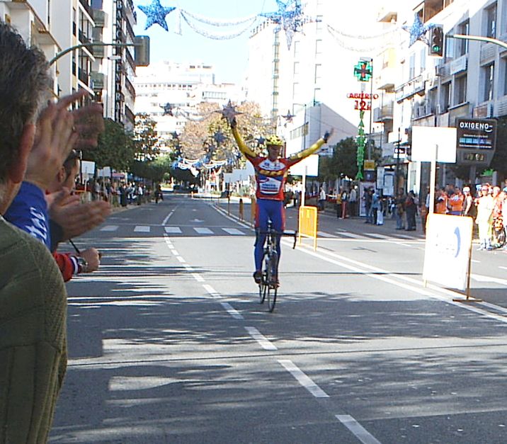 Seguiamos los siete con cierta tranquilidad y con pocas ganas de Gresca, ya tirabamos guardando porque el pelotón venia a mas de un minuto, llegamos al punto clave, la última curva. Iba yo segundo detrás de Antonio Ortiz antes de trazarla y el se la jugó trazando como me la jugue yo en el Criterium de Sevilla con mal final, ostiandome... El caso es que a el le salió bien y empezó a esprintar aprovechando el huequecillo que tenía de la curva.