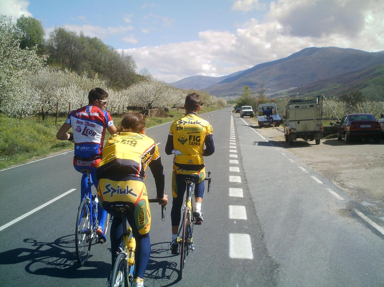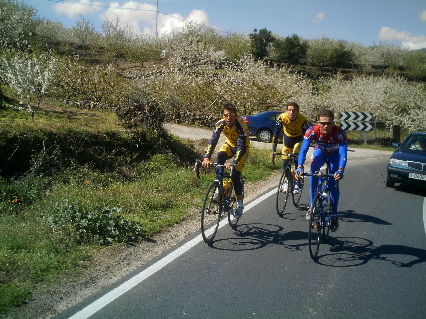 En la carretera del Valle del Jerte, con los cerezos floridos, momento de quitar ropa para Honduras.