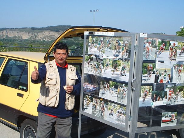 Campesino con Saez. De fondo la furgona rockera de los Ovarense.