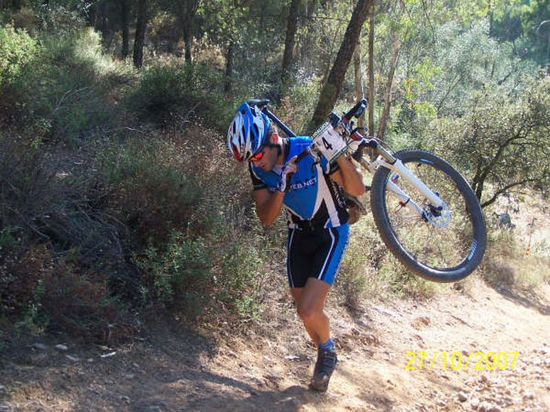 Pero llegamos a la rampa dura donde había que bajarse y ahí volví a entrar con la gente, todavía iba ahí jeje, menuda agonía lo de llevar la bici a cuestas, esoo?? eso es horrible, en el ciclismo normal tu vas en bici, en Montan bike la bici va en ti, tu eres la herramienta de transporte, iba ademas to sofocao, con las mismas sensaciones que cuando me meto en una fuga de salida en carretera.. solo que aquí iba fugado por detrás, eso si, también llevo 3 semanas de descanso desde Puertollano y eso también contrasta con salir aqui a tope de repente.