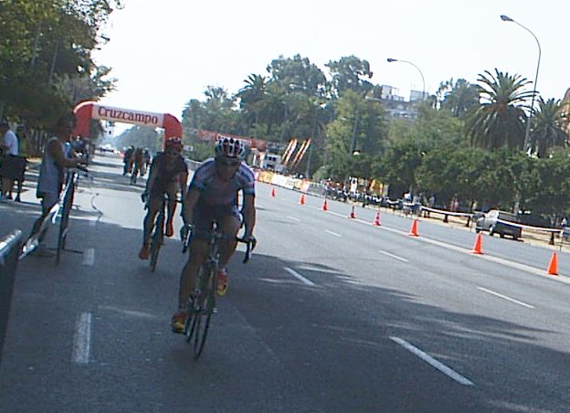Iban 3 escapados, Javi Moreno, Israel Perez y Pastor, aguantaron muchas vueltas en cabeza pero con poco tiempo, me recordaban a Padilla y al Cropusa en la carrera de Tetuán. Manolo al final se pegó un calentón tirando a por los tres , Manolo en el plano , cuando se pone, es la maquina, a 2 vueltas del final se puso Pablo Soler, yo también me puse un pokito... hasta que llegamos a la zona decisiva, la última vuelta, donde se pusieron a tirar los Spiuk para lanzar el sprint.