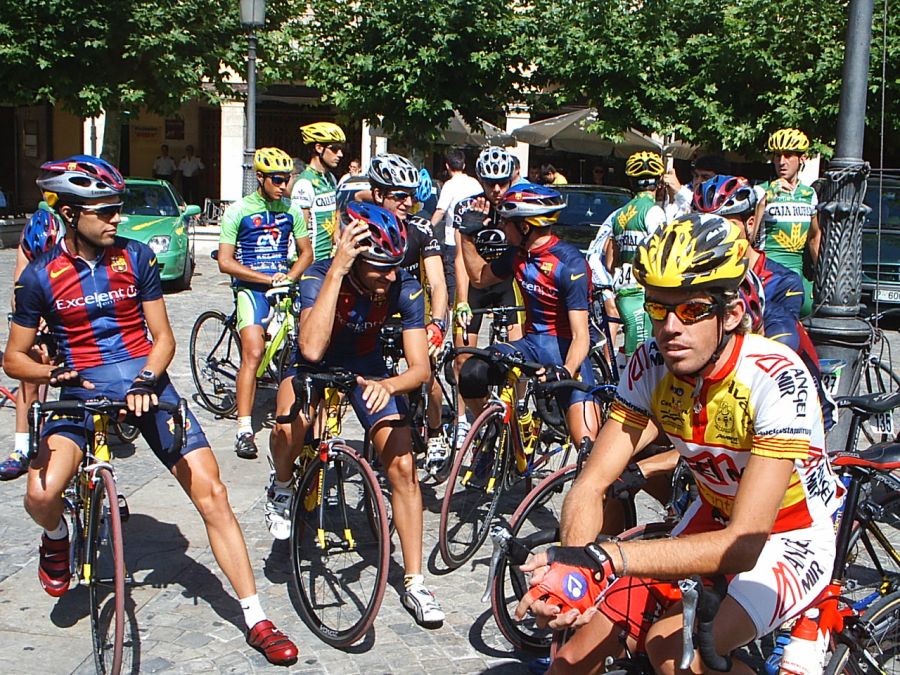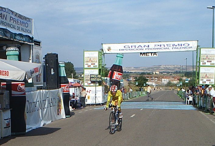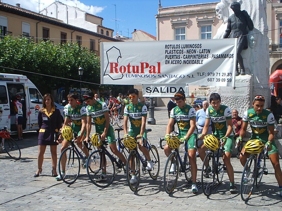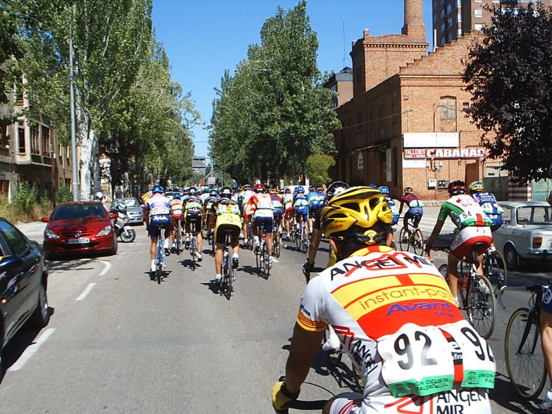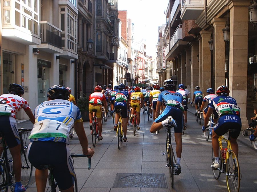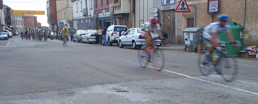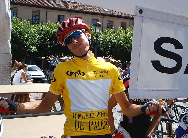 Saliendo de la plaza Mayor de Palencia en la última etapa. Ahi tenemos a David Peri, con el mallot de lider.