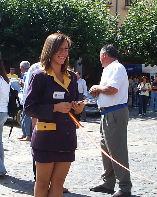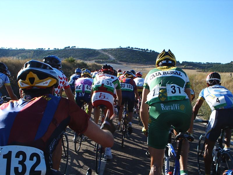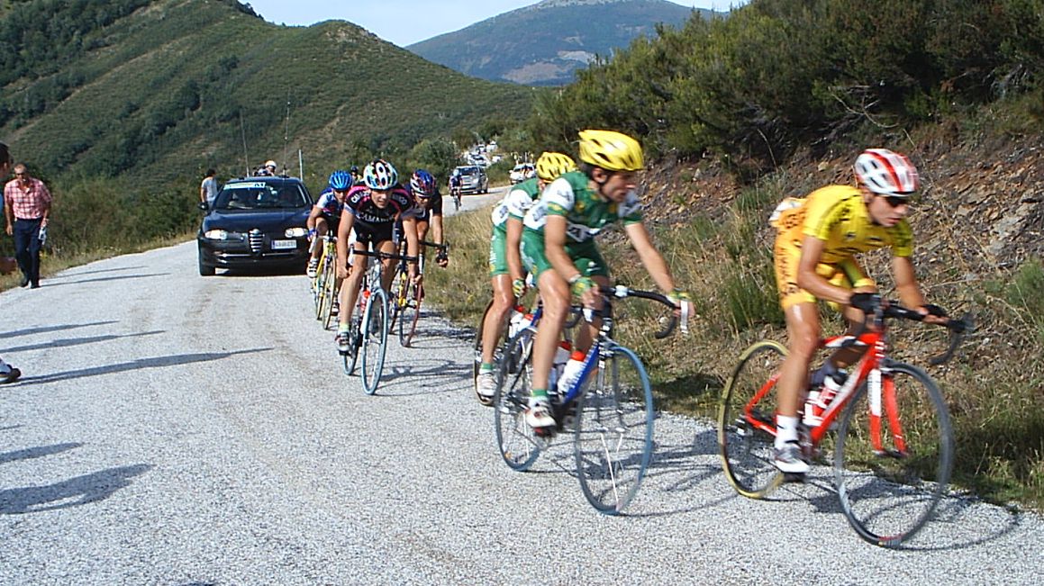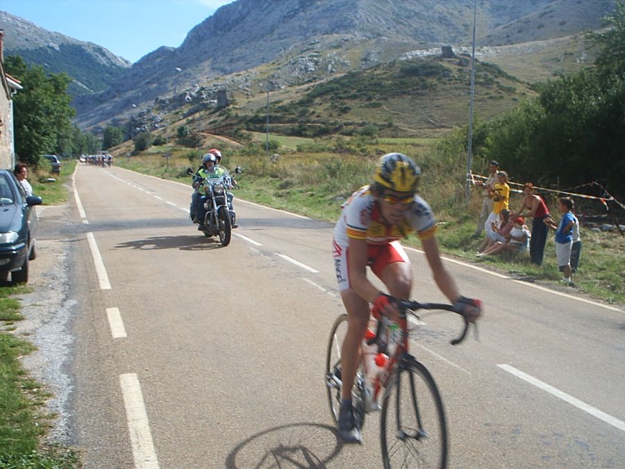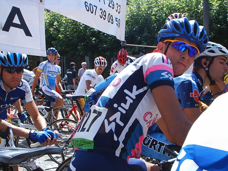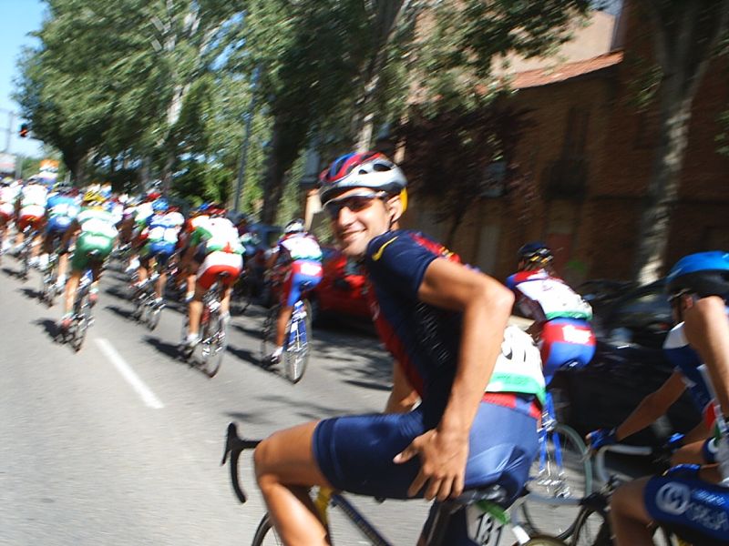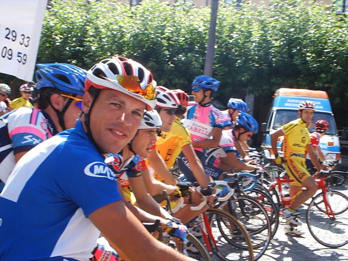 Saliendo de la plaza Mayor de Palencia en la última etapa. Ahi tenemos a David Peri, con el mallot de lider.