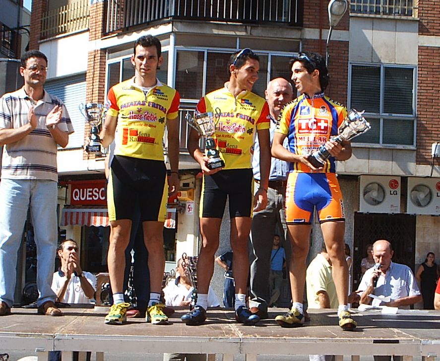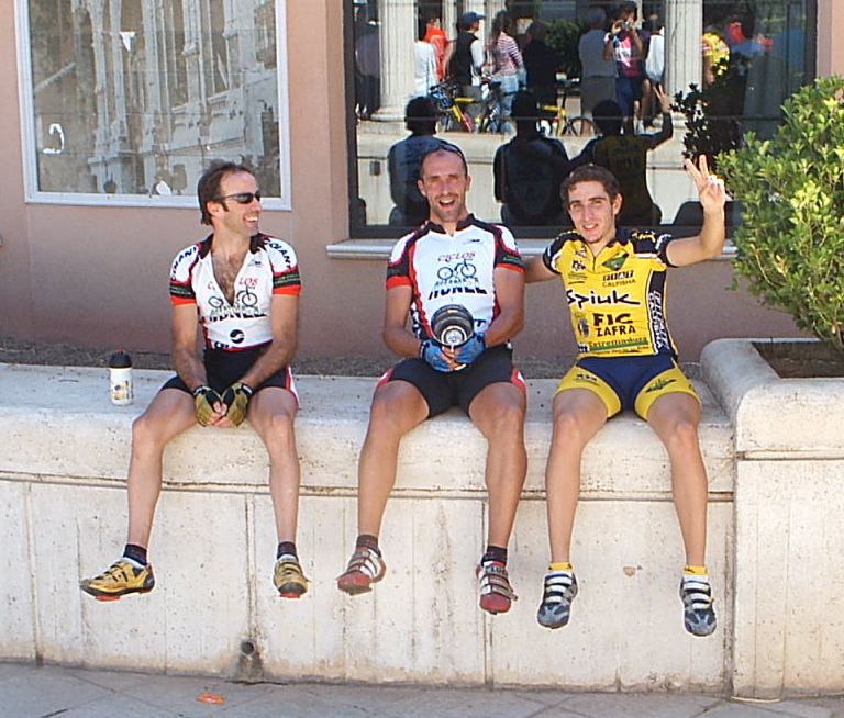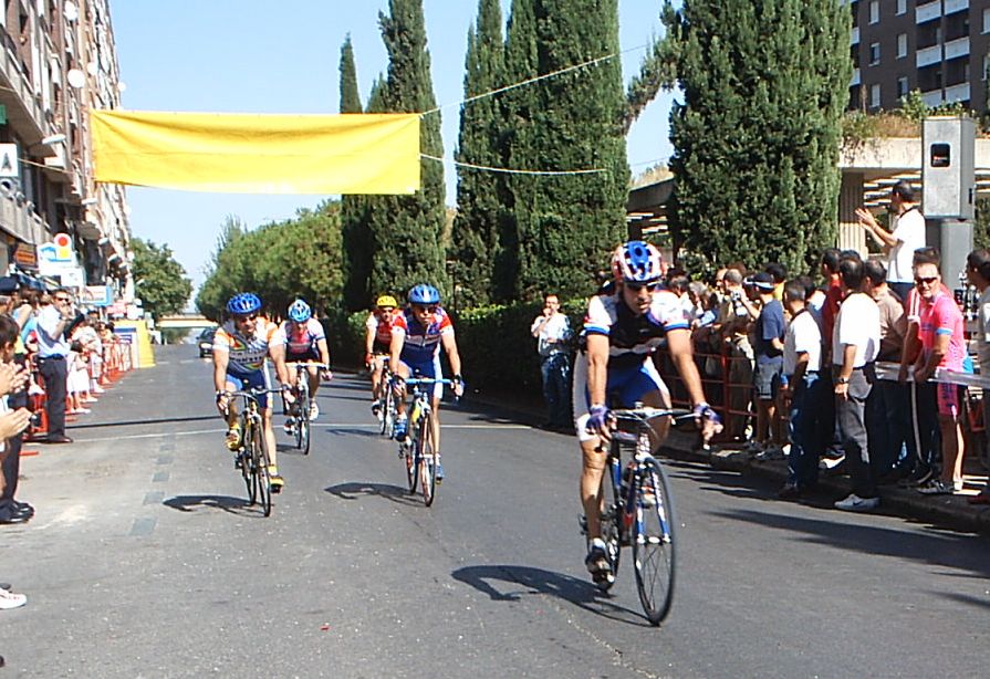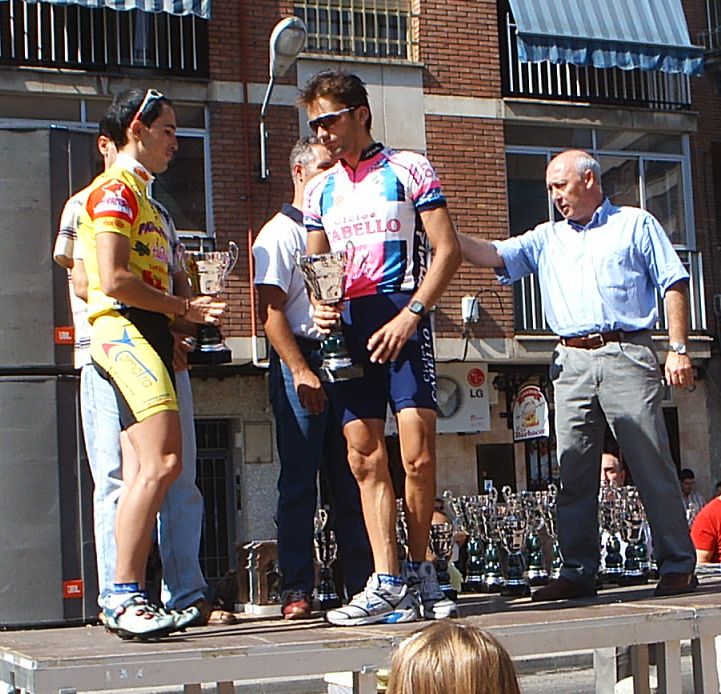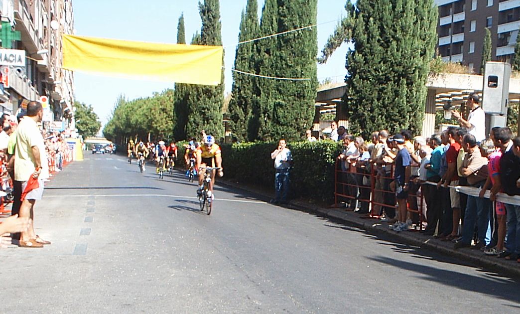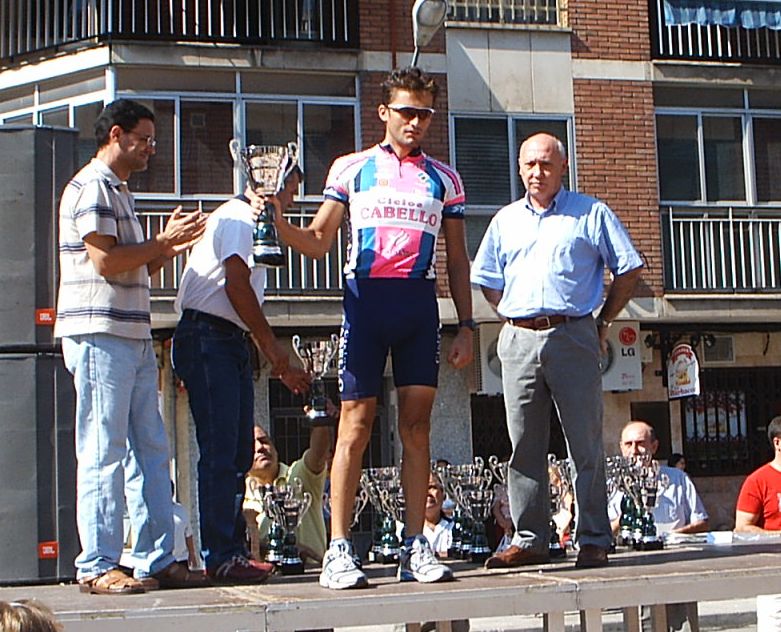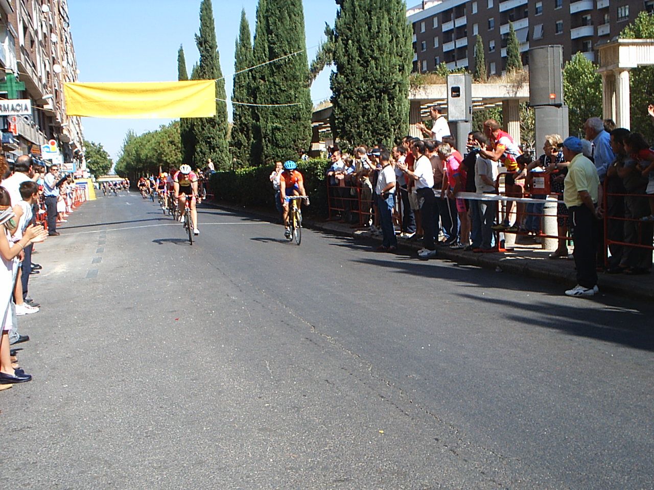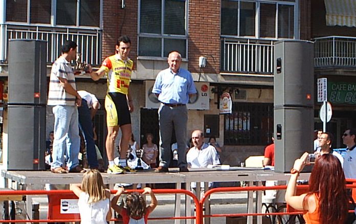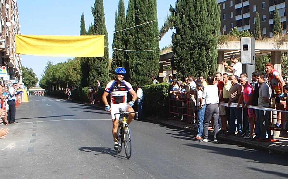 Después de recuperarme segui tirando a tope para abrir el hueco definitivo con el que llegaramos a meta, pero yo no queria jugarme la carrera en un sprint, asi que en un repecho le ataqué al chabal, pero no pude soltarle y encima nuestro ritmo bajo. Llego Fernando Fernandez ( Beppi) que iba en la moto diciendo, trankilo Diego , que ya llegais, no te desfondes. Nos plantamos los dos en la Recta de Meta, ibamos los dos mirandonos como Pascual y Parra en la etapa de Avila hasta que a 200 metros lanzé el sprint, mire para atras y vi que el chabal no podia seguirme, iria fundido... Asi que tuve hasta mi tiempo para celebrar la victoria. Llevaba tiempo intentando ganar esta carrera, el año pasado, que gano Fernando, hace 2, que gano Zarate... Costo ganar por que esta gente iba deprisa y se sacó una media de 43 km/hora.