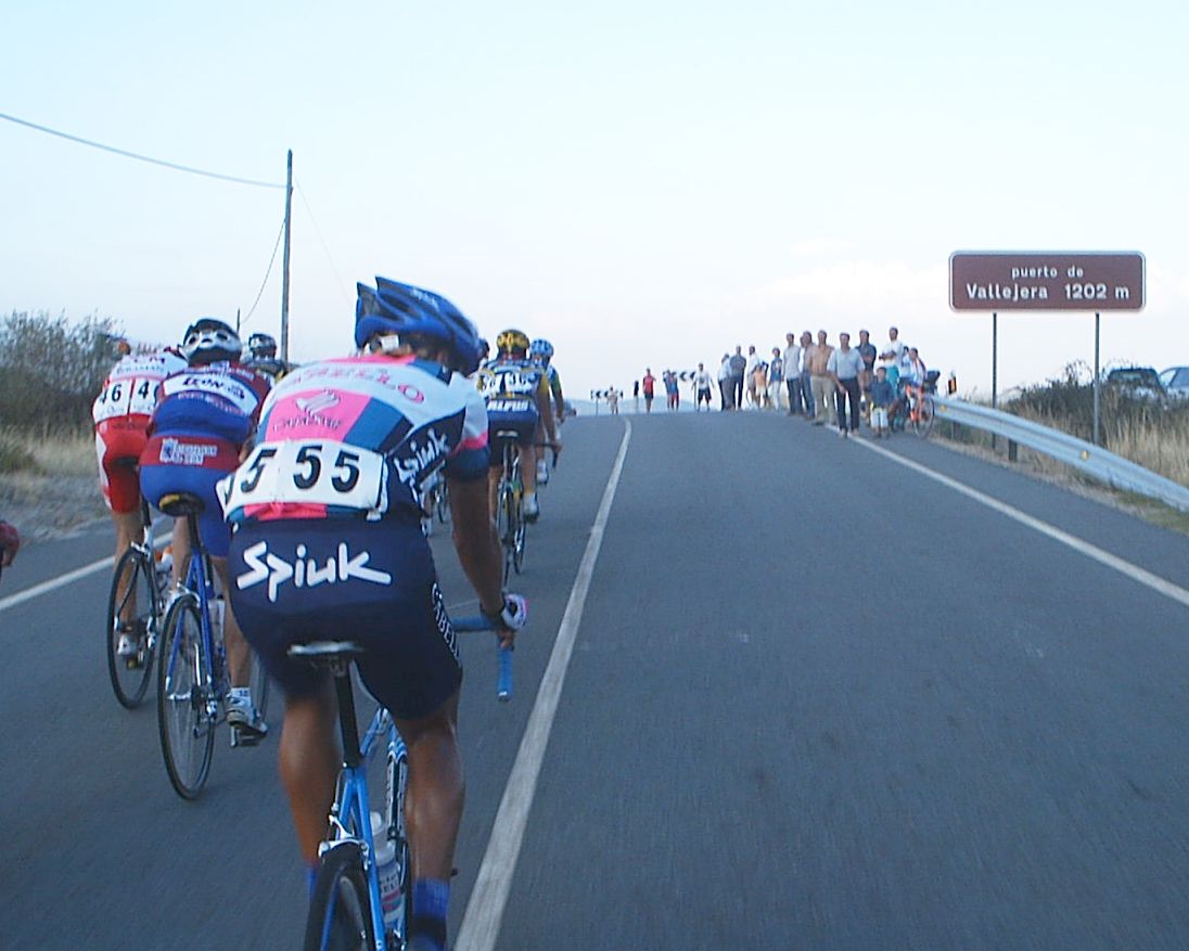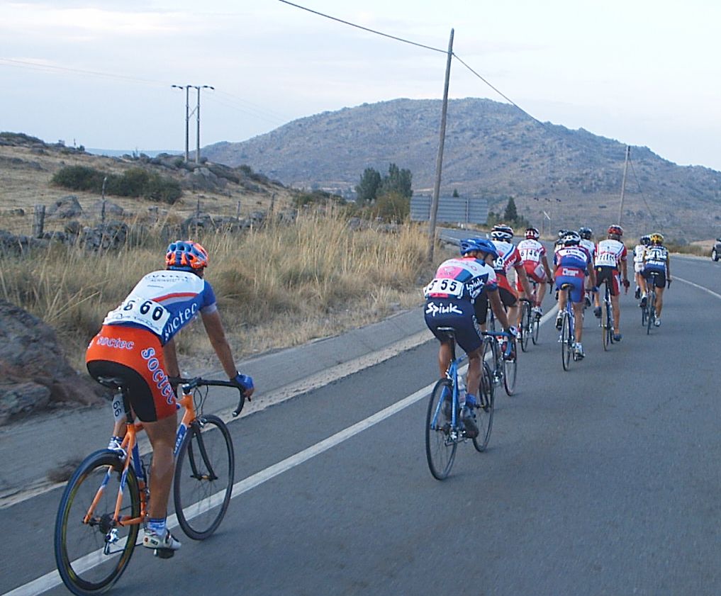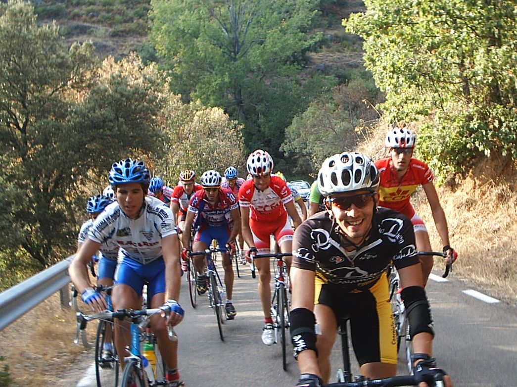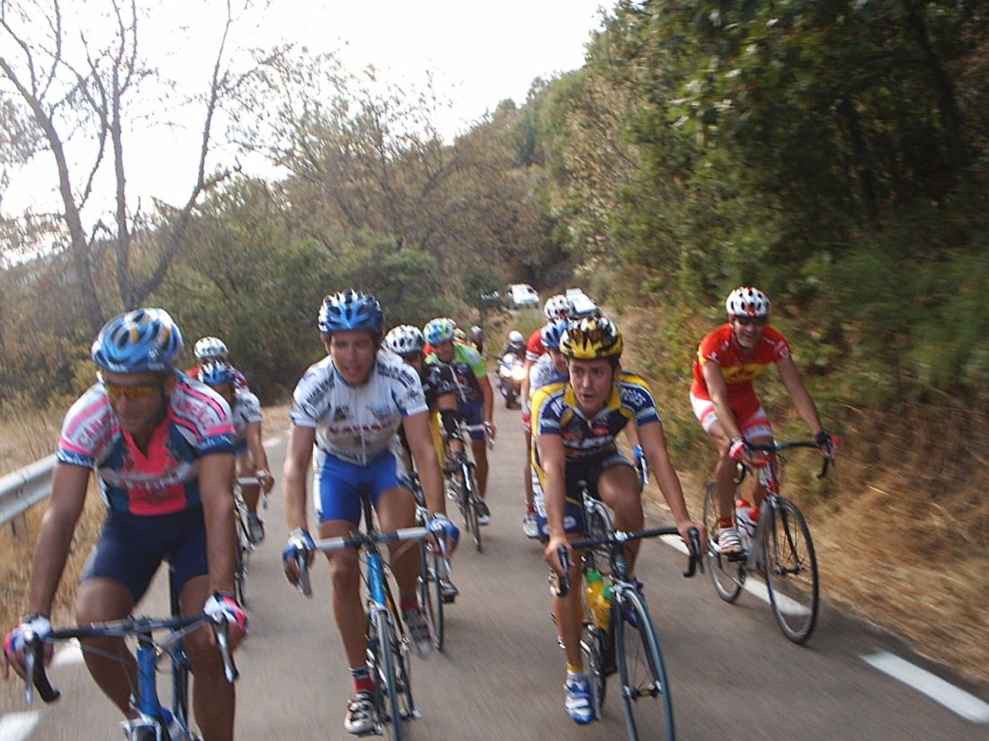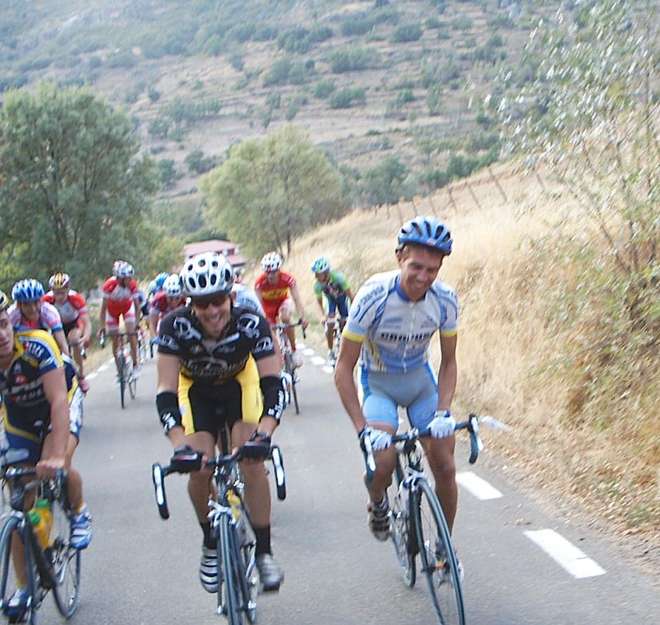 Yo estuve a punto de pillar a David de Macario, que se paro de la escapada por que se la bajaba la tija del sillón, pero logicamente se enganchó al coche como le dijeron los jueces y volvio a la escapada. Yo no tuve cojones de pillarla y me amargué alli entre dos aguas, cuando me pilló el pelotón ya sabia que la habia cagado, que ya no podria aguantar ni un puerto, que mi destino era la grupeta. Tambien me dolia mucho la espalda de tanto cambiar sujetando la maneta y en el siguiente puerto ya ingresé en la disciplina de la grupeta. Llegó Valentín con la Picasso y me dio la camara asi que la grupeta ya tenia cobertura Diegoweb. Realmente era una grupeta de Míticos, con Arenas, Saez, Morci, Guti el Campeón de España, Fausto, Rubio del Macario, Tintín, Pacheco campeon de Copa España Sub23, Ahedo, El Sapo, Rafa Rodriguez,Fliki,hermanos Nabben... Vamos, vivir el ambiente de esa grupeta era mucho mejor que apretar el culo para entrar en el medio, o alante o de buen rollo en la grupeta de los miticos.
