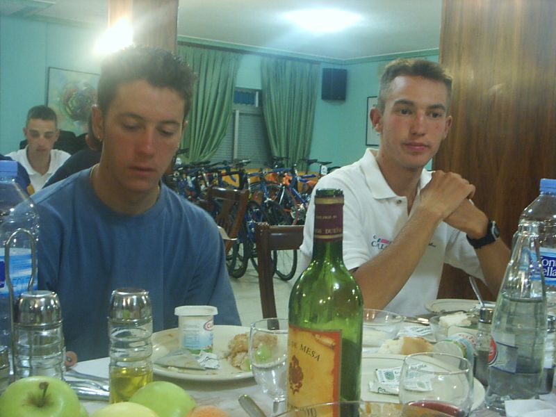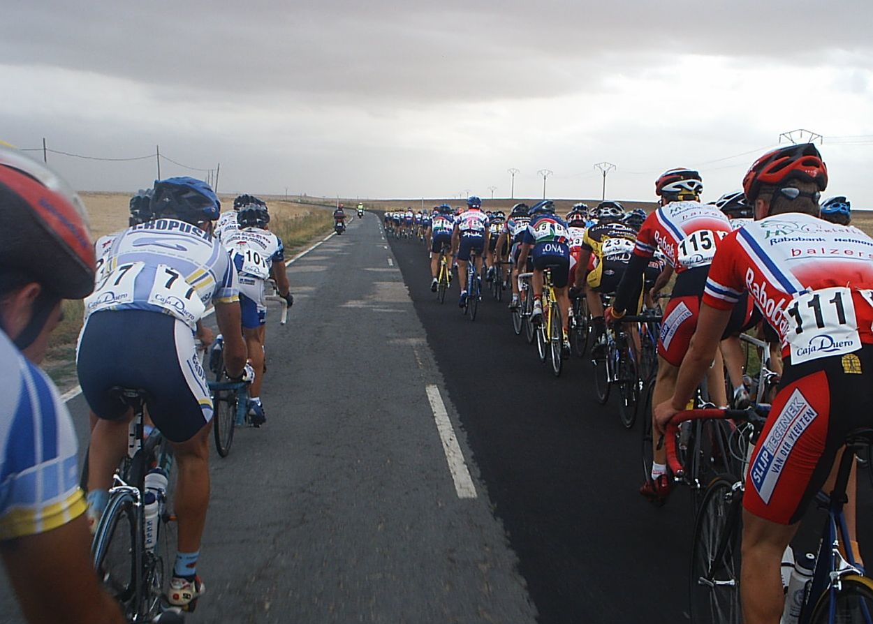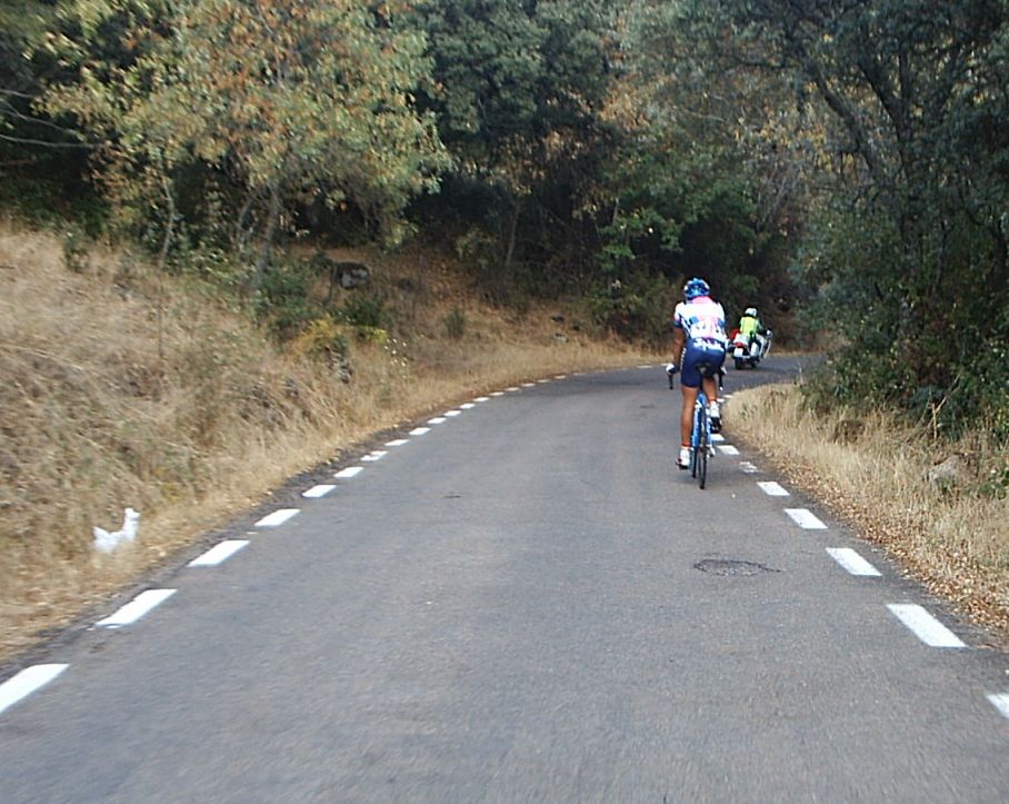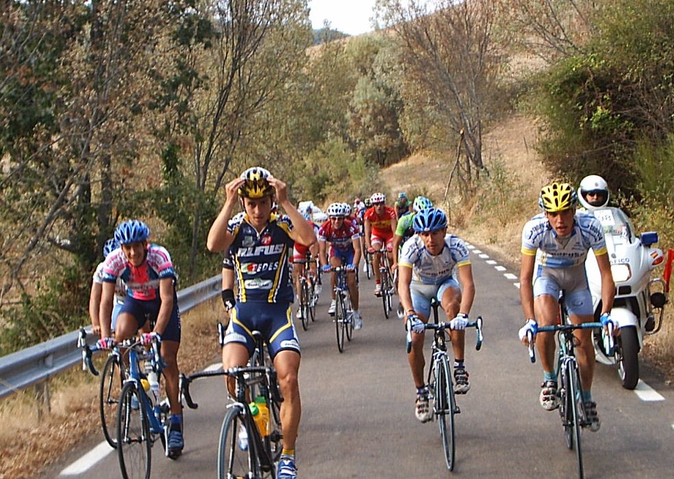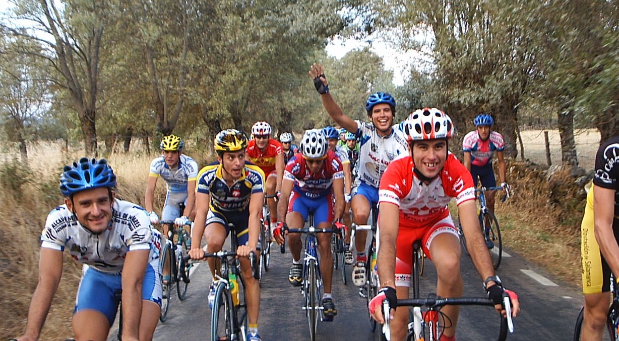 Yo estuve a punto de pillar a David de Macario, que se paro de la escapada por que se la bajaba la tija del sillón, pero logicamente se enganchó al coche como le dijeron los jueces y volvio a la escapada. Yo no tuve cojones de pillarla y me amargué alli entre dos aguas, cuando me pilló el pelotón ya sabia que la habia cagado, que ya no podria aguantar ni un puerto, que mi destino era la grupeta. Tambien me dolia mucho la espalda de tanto cambiar sujetando la maneta y en el siguiente puerto ya ingresé en la disciplina de la grupeta. Llegó Valentín con la Picasso y me dio la camara asi que la grupeta ya tenia cobertura Diegoweb. Realmente era una grupeta de Míticos, con Arenas, Saez, Morci, Guti el Campeón de España, Fausto, Rubio del Macario, Tintín, Pacheco campeon de Copa España Sub23, Ahedo, El Sapo, Rafa Rodriguez,Fliki,hermanos Nabben... Vamos, vivir el ambiente de esa grupeta era mucho mejor que apretar el culo para entrar en el medio, o alante o de buen rollo en la grupeta de los miticos.