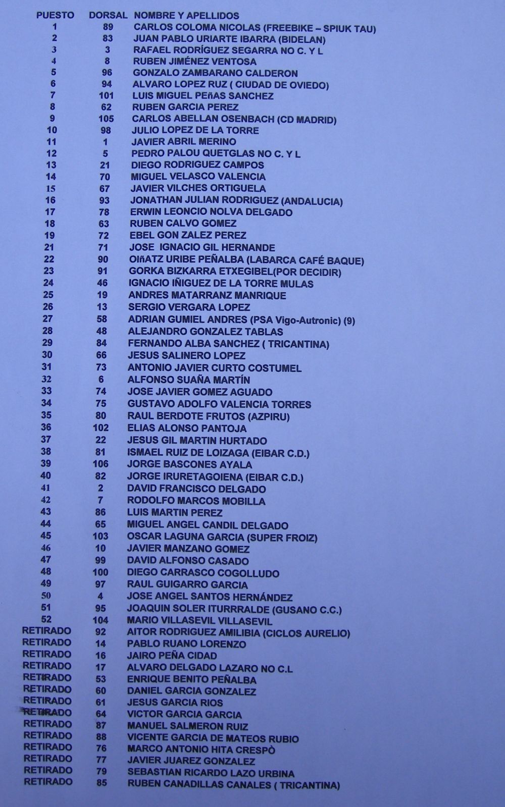 Se nos habían ido 15 tios por delante y el Kim Soler y yo remando hasta que el pinchó y me dejo solo, segui solo, cogi a un grupo con Villasevil y Taffi que venían paraos, segui solo, y que desesperación, yo remando solo, hasta que por fin llegó alguien, quien sino, Dimitri, que venía persiguiendo el solo extra- Diesel, me vino bien su llegada, llegué mas comodo a meta, en el puesto 13º. Ganó Carlos Coloma.