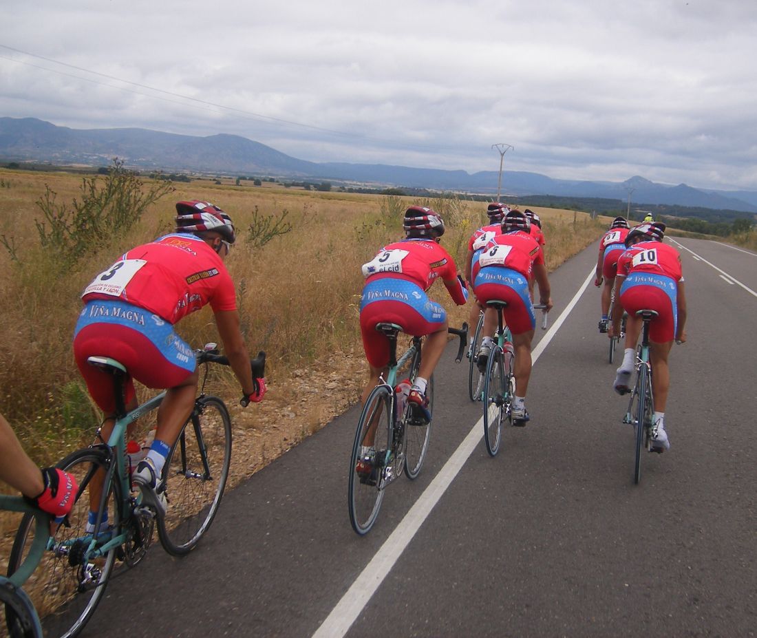 Ya me harté de escaparme y me quedé a rueda, me vino bien por que se hizo un corte con pocos Cropusa, y atras tiró todo el Cropusa, Viña Magna, mandaron parar a Kim Soler de alante para que tirara con ellos, hasta que cogieron a los escapados, justo a pie de puerto, el temido puerto de Poza de la Sal, el pueblo de Felix Rodriguez de la Fuente.