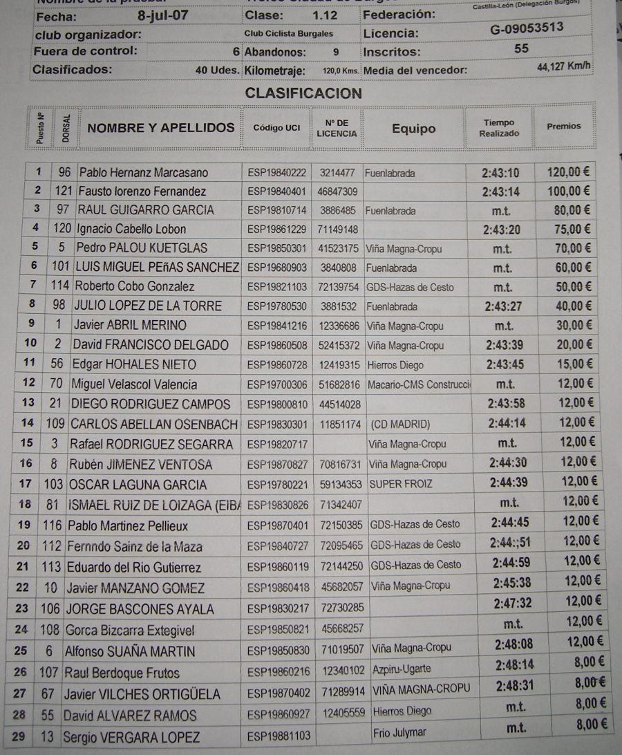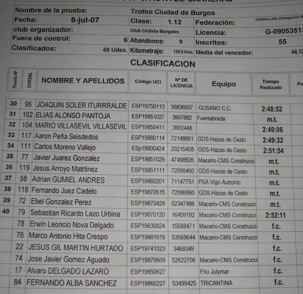 Llegamos a Burgos capital y quedaba la última emboscada, giro izquierdas y una subida muy dura hasta la Meta, allí se rompio todo, yo que llevaba poquito gas solo pude hacer el 13º, el mismo puesto que el dia anterior, pero lo malo que en Arevalo también hice el 13º al dia siguiente.. puesto pestoso de mierda.