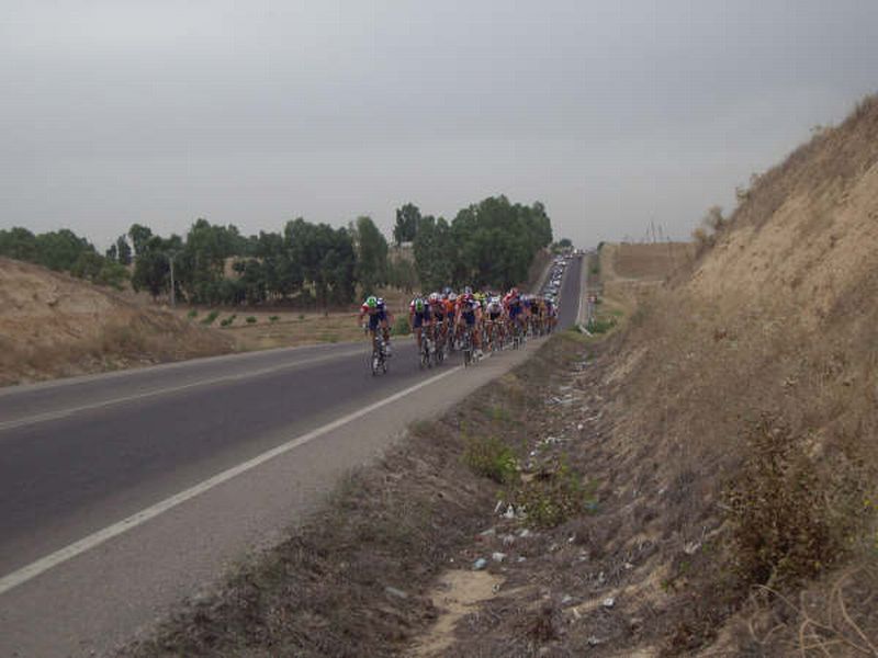 Pelotón entrando en la segunda etapa, que se debió hacer muy dura con los abanicos.