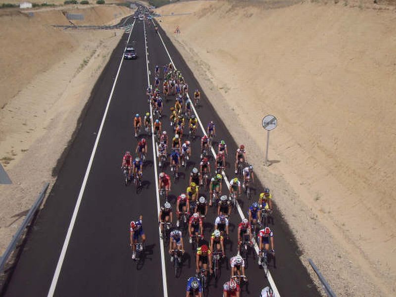 Parece de Videojuego pero es una foto del pelotón de la Vuelta Toledo desde un puente.