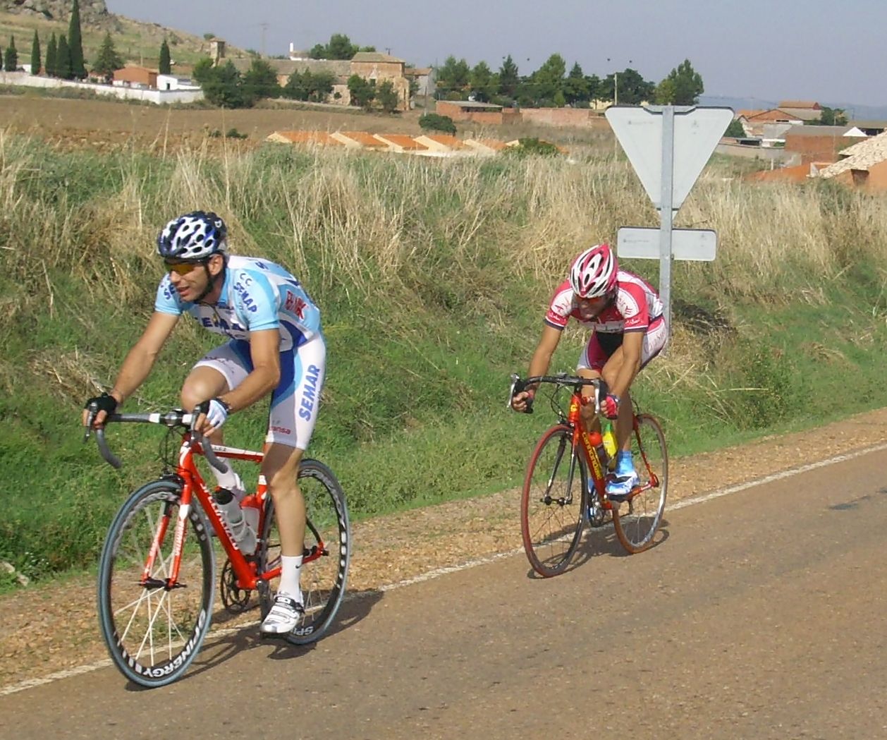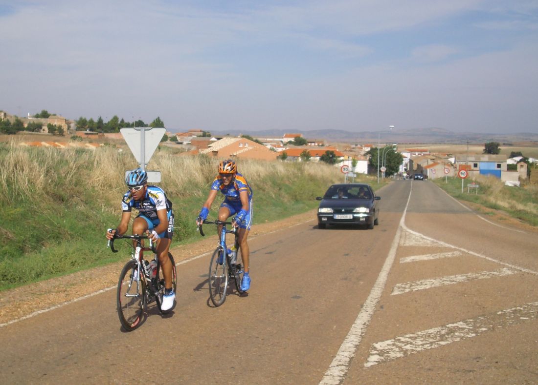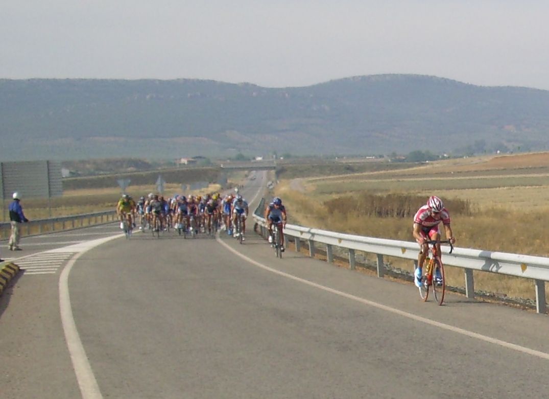 En esas rectas camino de Caracuel hubo mil ataques, yo hice un montón de ataques pero siempre había un chivato que decia -Va -vaaaaaaaaa!!. Me tenía ya asqueado y yo iba diciendo, -que se caye ya el puto chivato de vaaaaaaaaaa vaaa, joder con los chivatos, que salgan ellos y se cayen la boca. En otra vez arranqué yo de cachondeo ya diciendo -vaaaa -vaaaaaa, cuando veía que traia todo el pelotón a rueda me abría de golpe, estaba hasta la polla ya, era imposible irse, pero ademas es que llevabamos aire de cara y marchabamos a cuarenta y picos 50 por hora.. se iba rápisimo. Cuando no arrancaba yo arrancaba Torralbo, ibamos repartiendonos un poco la faena.
