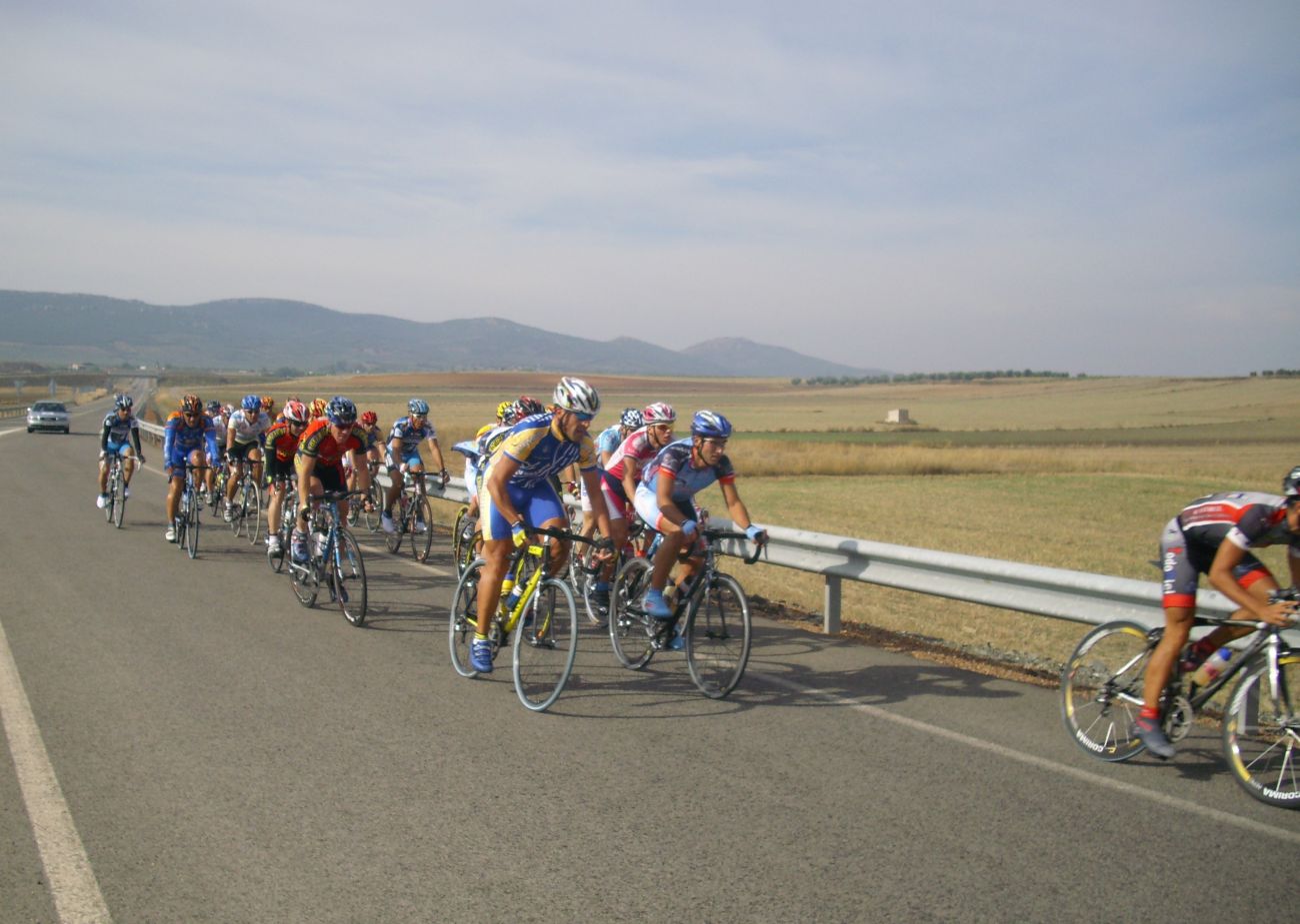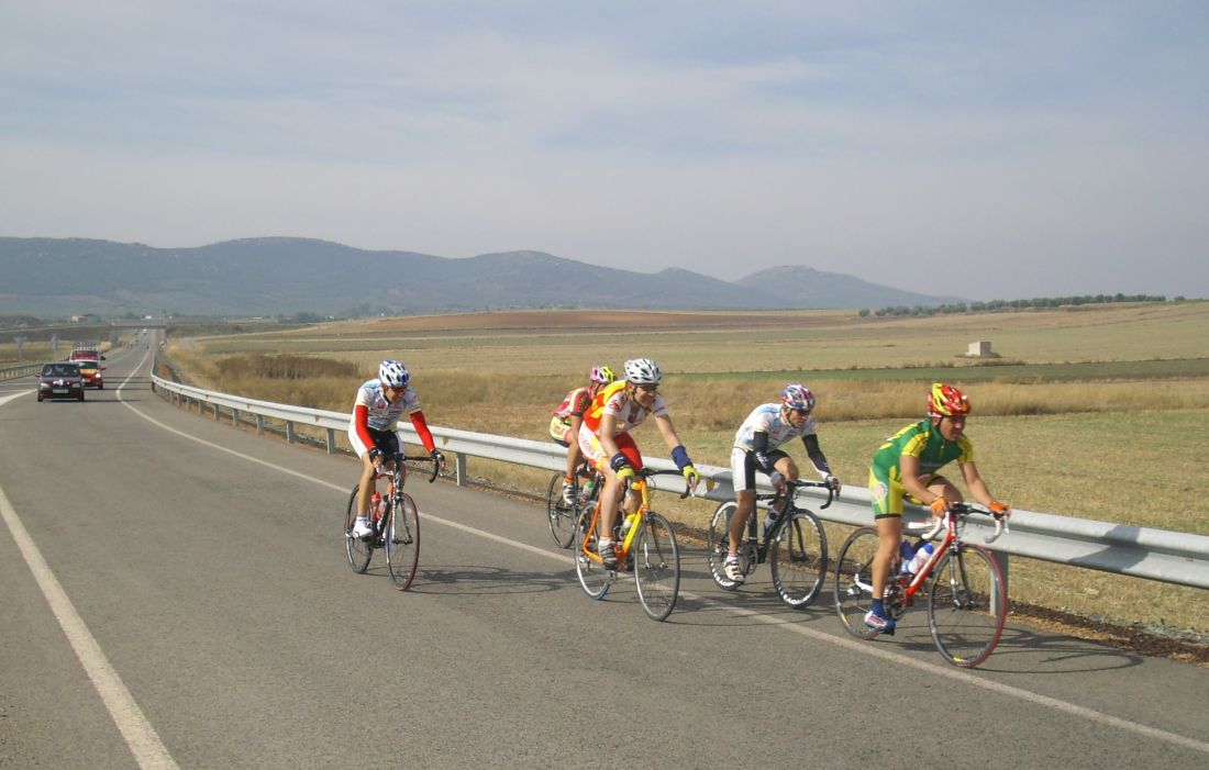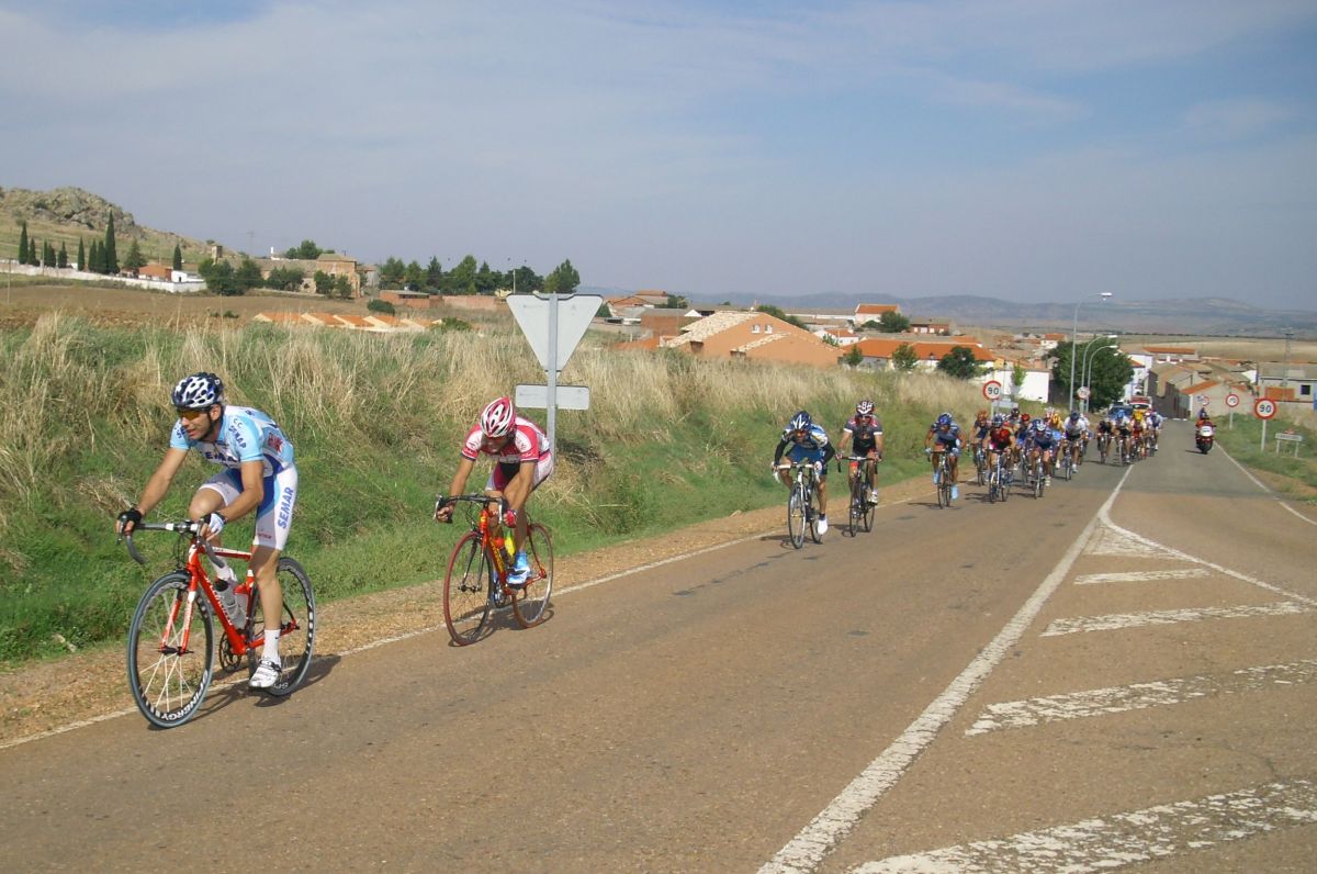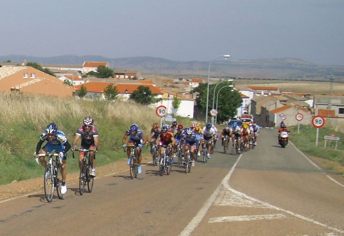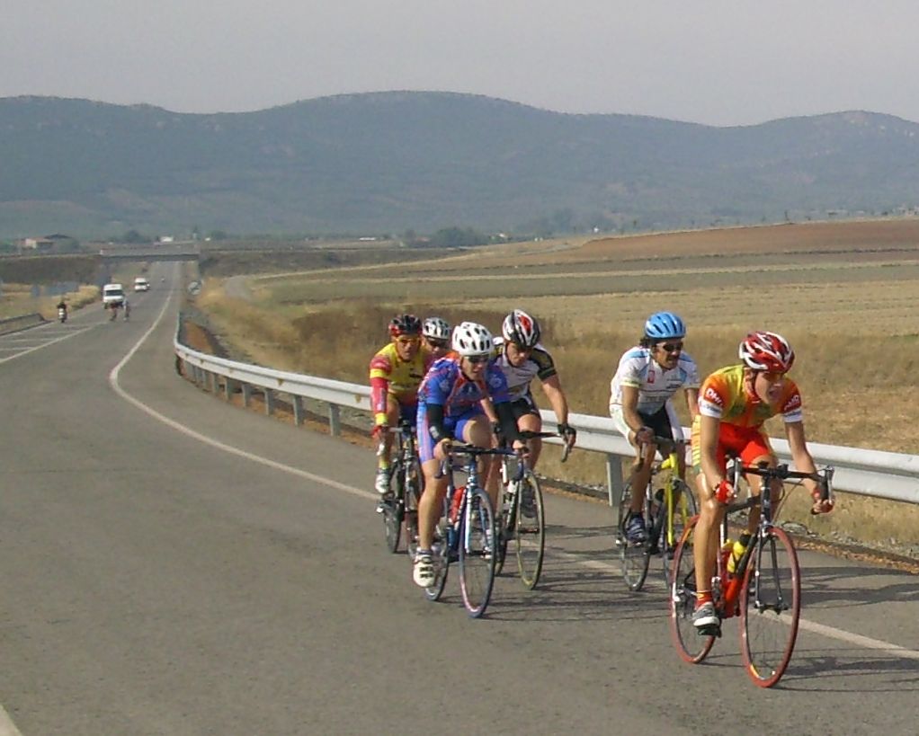 Ya mas cerca de Caracuel se hizo otro corte que se fue para alante un poco, asi que atrás en el pelotón se organizaron varios equipos y se pusieron a tirar. Yo de puta madre, a rueda, me hacían el trabajo, tiraban para Patas de Toro, que era el corredor local de Puertollano y quería ganar la carrera, tiraba hasta su padre del Merkamueble, aunque tuviera otro Merkamueble en la fuga, con los Merkamueble se corre bien, aunque vayan escapados los compañeros tiran por detrás.