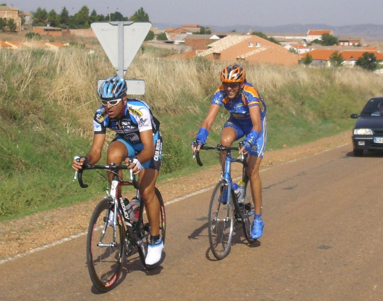 Atras en el pelotón seguiamos a ostias y poco a poco nos ibamos acercando a la mítica Meta Volante de Cabezarados, que veiamos que ya no la ibamos a poder disputar, iba a ser disputada entre los dos de delante, los 70 Euros de esa Meta Volante fueron para Baena el del Caja Rural. Yo arranqué al paso por la Meta Volante entrando en el pueblo de Cabezarados enfilando la pelotón que se cortó un poquillo pero saliendo del pueblo fue neutralizado el ataque aunque acto seguido volví a arrancar a ver si el doble ataque hacía daño pero tampoco, ataques y contrataques se sucedían en el pelotón, los mios y los del Patas de Toro eran continuos, con estrecha vigilancia entre nosotros.