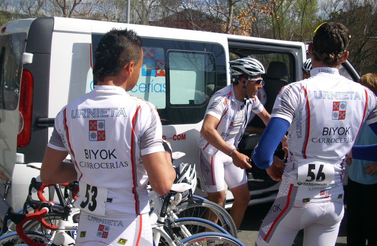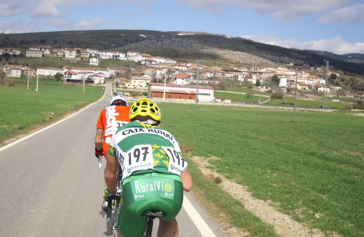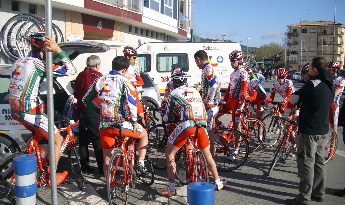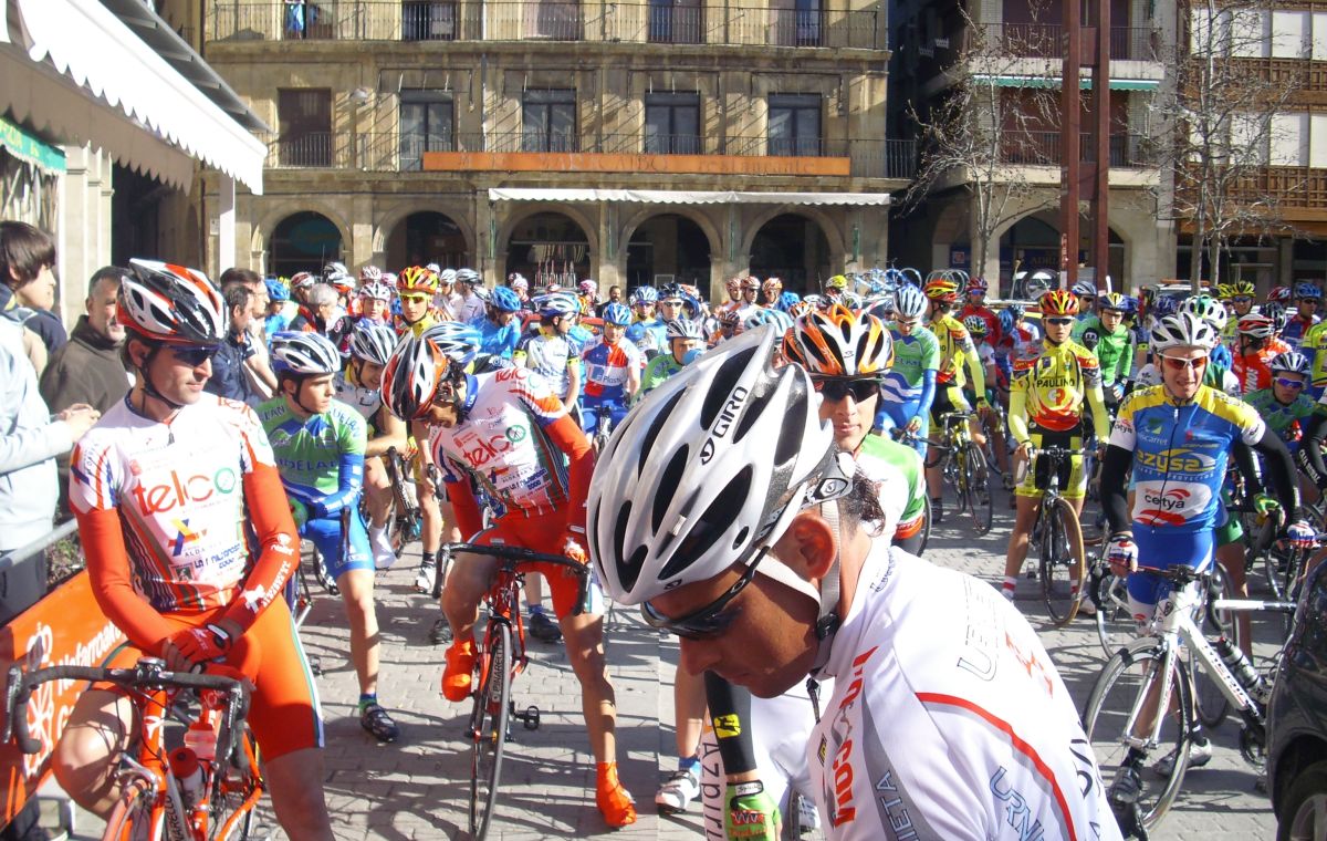Llegamos a Estella, yo pensaba que ya solo quedaba la subida al Muro de Puy pero que mazazo cuando nos dijeron que quedaba todavía otra vuelta, 15 kms mas, después de tanta remada, aunque se veia la segunda escapada muy cerca, era posible pillarles por que iban a ostias, yo dije- Ostias si estan ahí, les cogemos, y el Sarraga me dice , Pues claro joder, que te piensas que estoy aqui tirando para hacer el tonto!!
