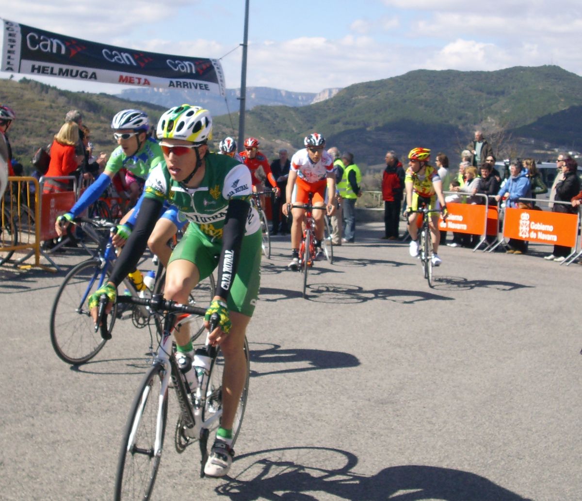 Con to el aire de cara nos acercamos a los coches de la caravana y ya bajando les trincamos rueda y cogimos al grupo, que iban a ostias, De Sarraga arrancó bien al cogerles y les pilló la vez marchandose con Mendikute del Azpiru, atrás nos quedamos parados mirandonos y arrancandonos, hasta que ya se fueron, al final me puse yo a tirar a una marcheta comoda para mi y pa que no arrancasen, y llegamos al Muro de Puy, el duro final de la carrera de Estella, el mismo que la de profesionales.