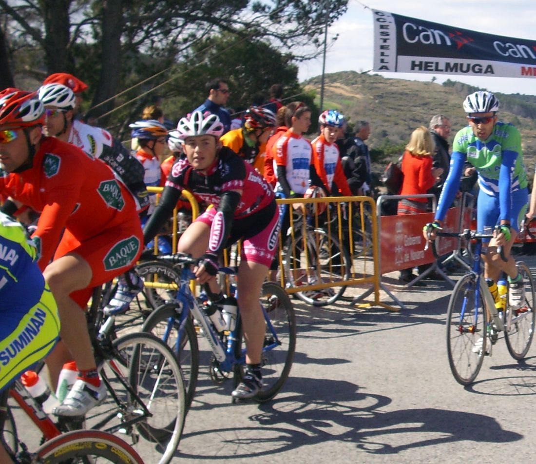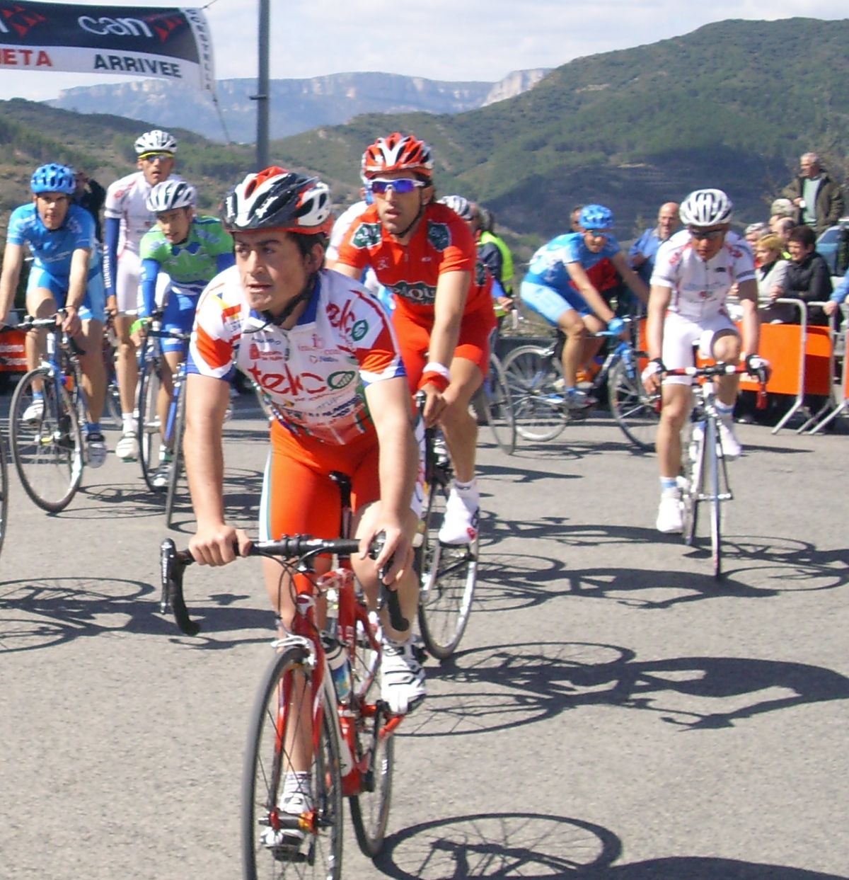 Puerto de carreterita estrecha, yo iba subiendo por la derecha, por el peralte de un canalillo, a medio puerto empezé a encontrarme bien y me puse a cantar el chikichiki, perreaa perreaaa,, y arranqué a ver pero venía todo el pelotón y me abrí desistiendo de mi ataque, que fue continuado por Abraham, pero también sin exito. Al final del puerto se endurecía la cosa y se tensó la carrera, coronamos un grupillo pero bajando entro mas gente.