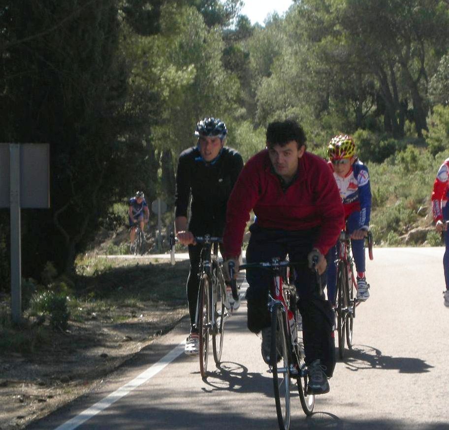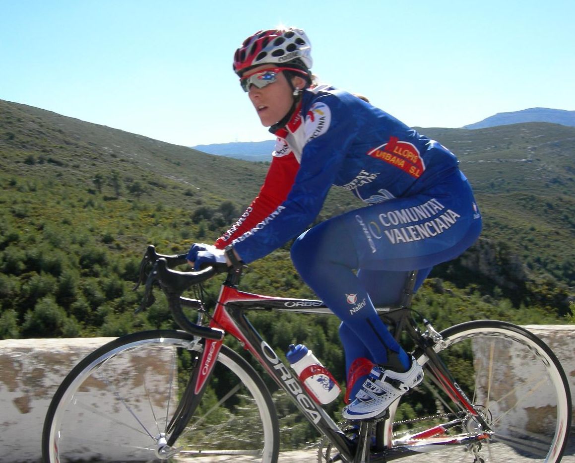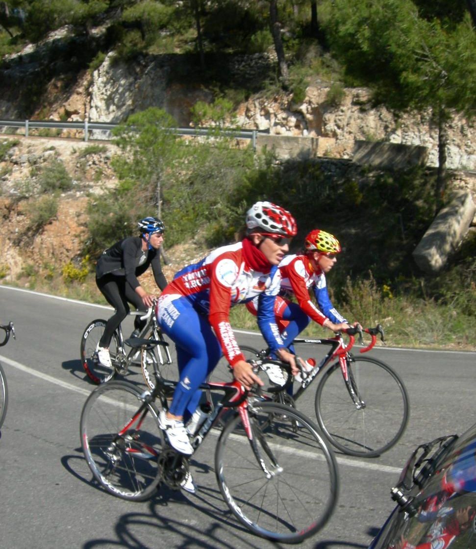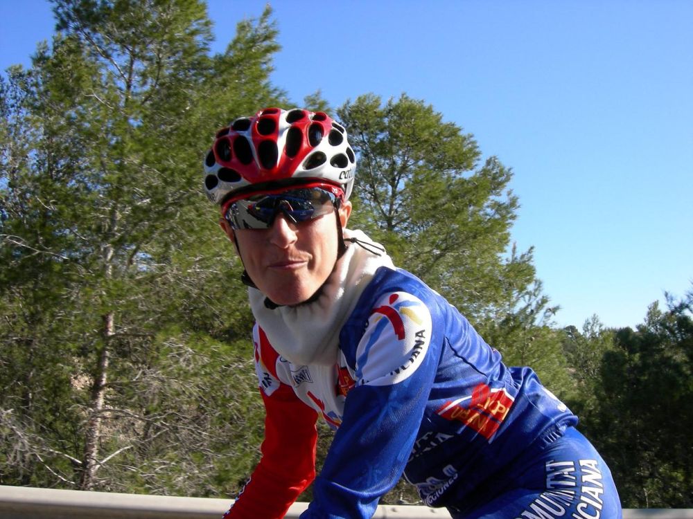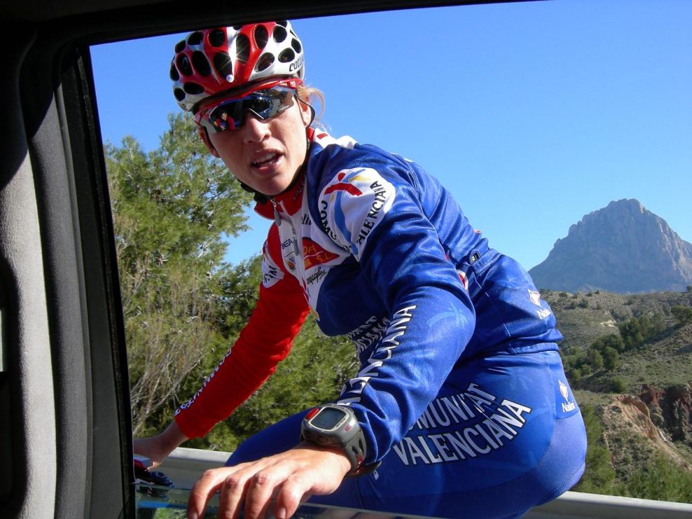 ![]() Ana Sanchis saludando y Maria subiendo uno de los míticos puertos de la sierra alicantina. |
