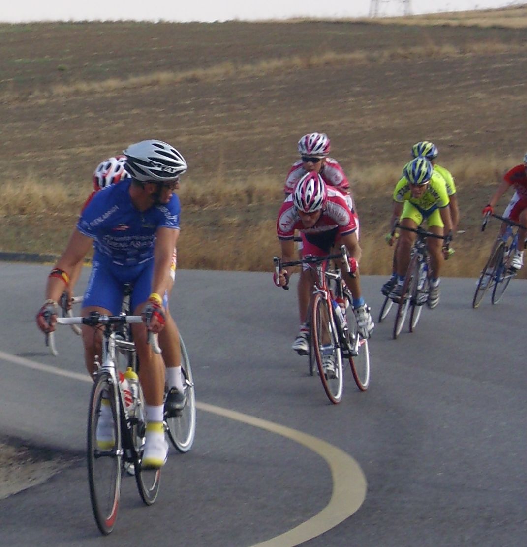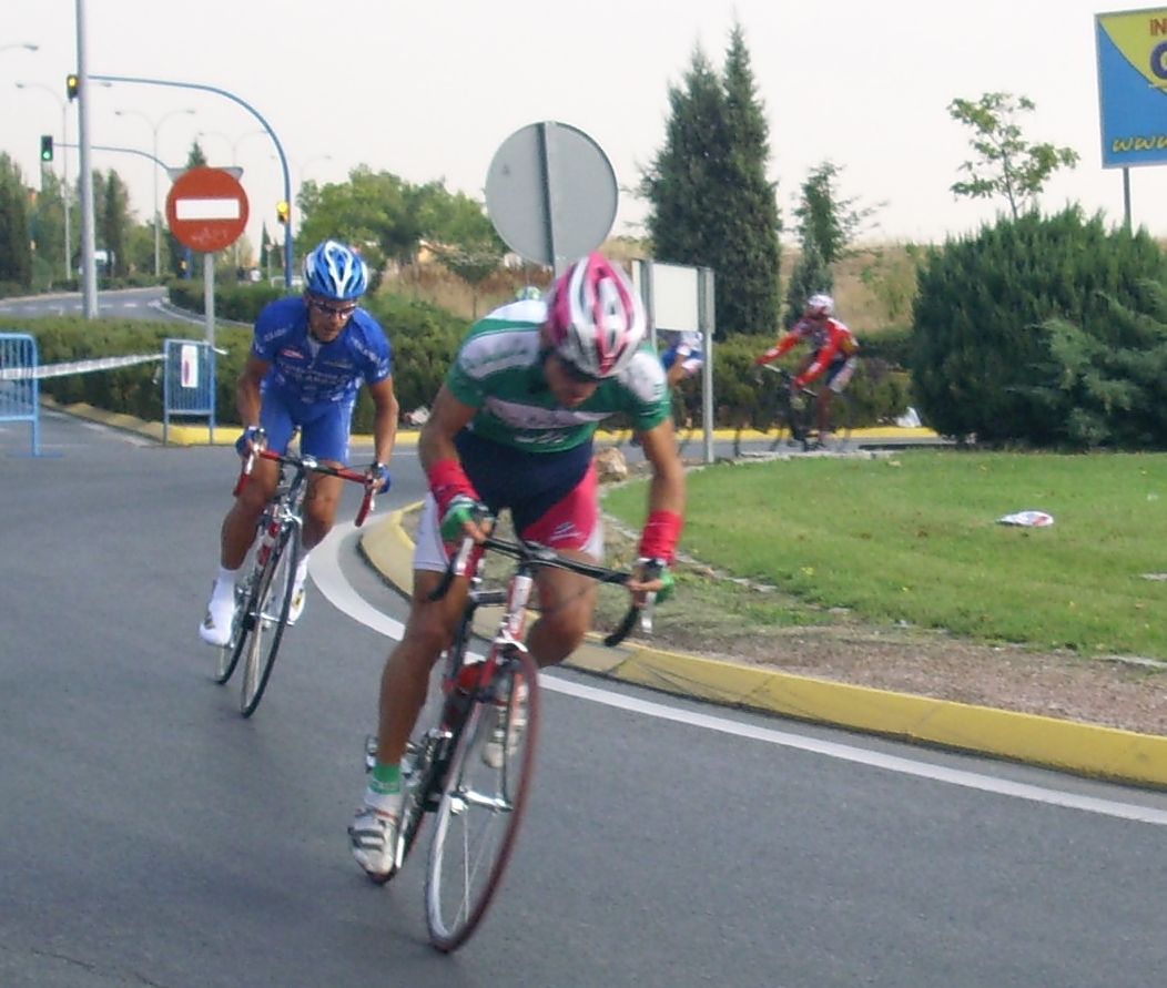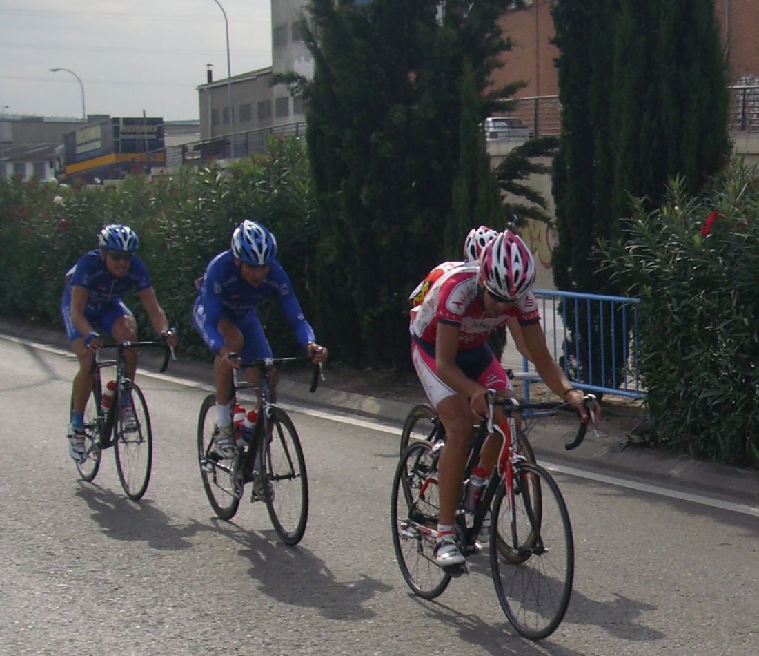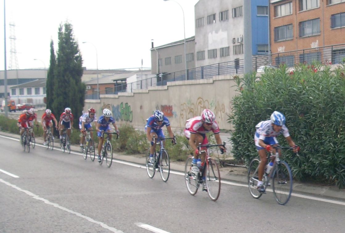 Maté se puso a tirar también para pillar el corte de alante, iba tirando el Mate fuerte, cortó el pelotón y enganchó el solo con el corte de alante, detrás hubo mas ataques y acabamos entrando bastante mas gente en el corte de delante, que se convertía ya en el nuevo pelotón. Esteban que había pinchado también estaba alante, pero por que cambió la rueda y acortó en una rotonda, pensando que al ser circuito podía acortar por pinchazo y que podía colar, pero esto no era una carrera de Pista precisamente y el circuito tenía repechos muy duros.