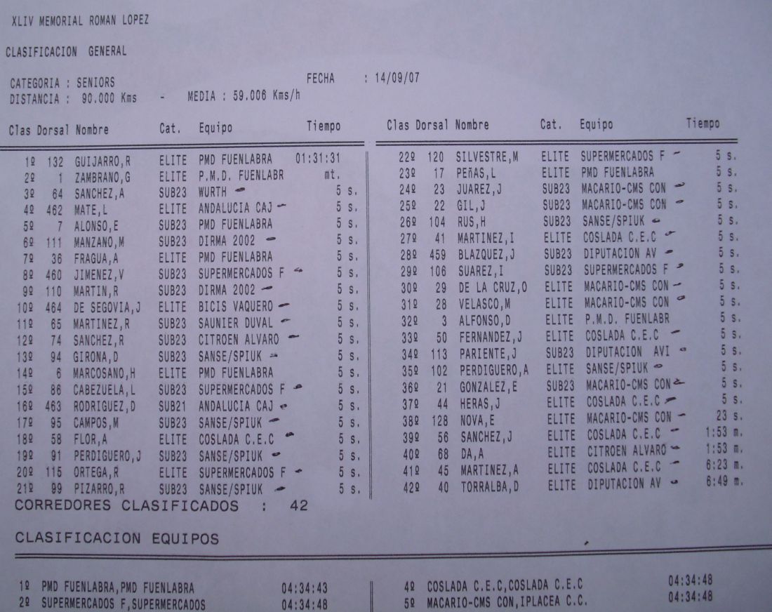 Por delante consiguieron llegar Taffi y Zambrano con 5 segundos de ventaja dando la victoria a los Fuenlabrada en Fuenlabrada, un sitio donde no podían fallar, detrás entraba Esteban haciendo tercero el solo, a punto de ser pillado por el pelotón, pero de nada le sirvió, de nada nos sirvió, por que fue descalificado por pinchar y atrochar en la glorieta. El de Wurth que hizo cuarto fue a protestar a los jueces para que así le dieran el tercero y pudiera subir a Podio. Asi que ni siquiera pudimos puntuar por equipos, nos jodió bien el pinchazo del tubular de las Neutron del Esteban, por que Esteban tenía fuerzas de sobra para hacer lo que hizo sin haber pinchado y atrochado, pero un pinchazo en circuito a la velocidad que se iba era palmarla, mala suerte y punto.