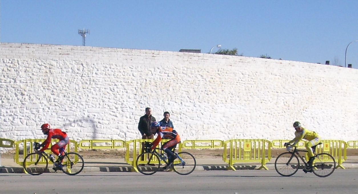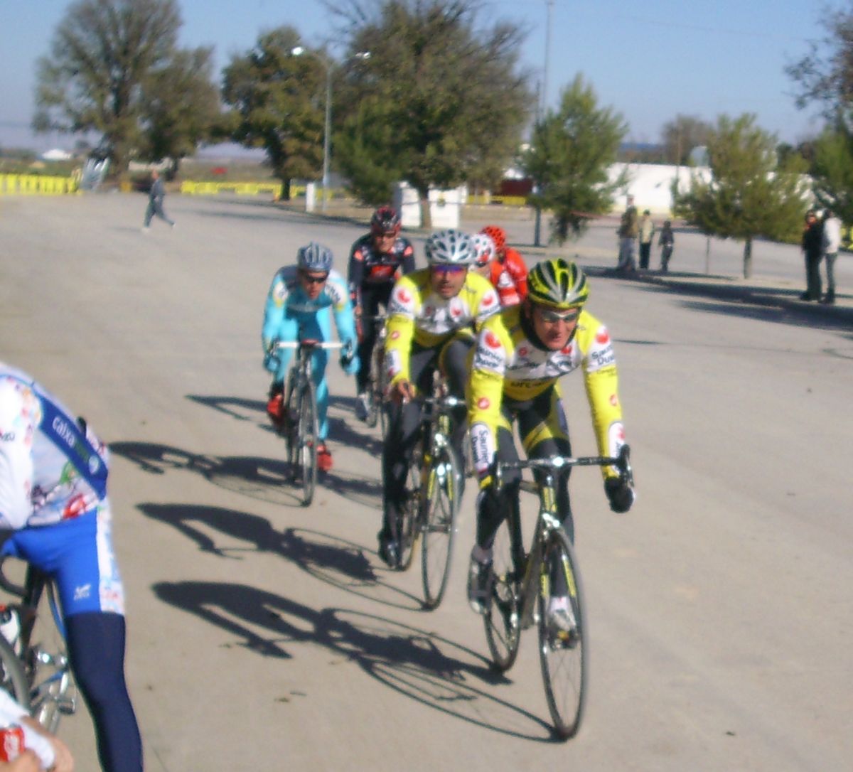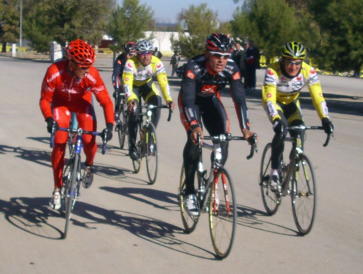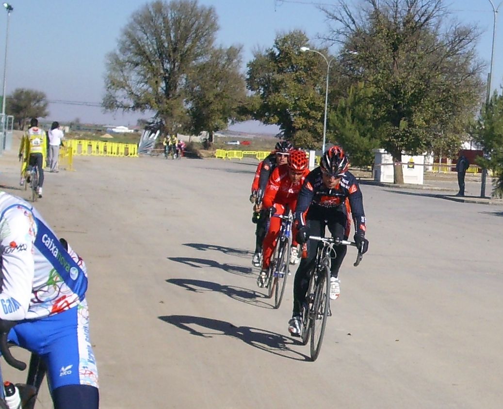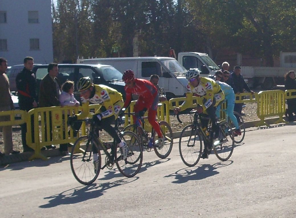 Iban tirando los dos Andalucía Cajasur y de verlo se me metió el chip que tendría que ponerme a tirar con ellos pero yo iba con la equipación Diegoweb.net asi que nada de nada, a rueda. Los Andalucía neutralizaron la fuga intermedia, que era bastante numerosa y solo queradon alante 4 corredores, que eran los que iban sacando los puntos de la puntuación.
