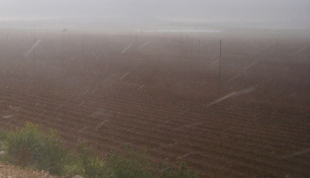 La lluvia se convirtió progresivamente en granizo y empezó a hacer mucho frio de repente, con el vendaval que teniamos de cara, pero lo peor que el granizo empezó a picar, y de picar a doler, la situación era muy lamentable, fueron momentos muy duros, ademas ibamos remando en medio del campo, no había nada para pararse y refugiarse, no había mas remedio que seguir y buscar refugio o rezar para que parase, todos los que corrimos sabemos que lo pasamos muy mal.