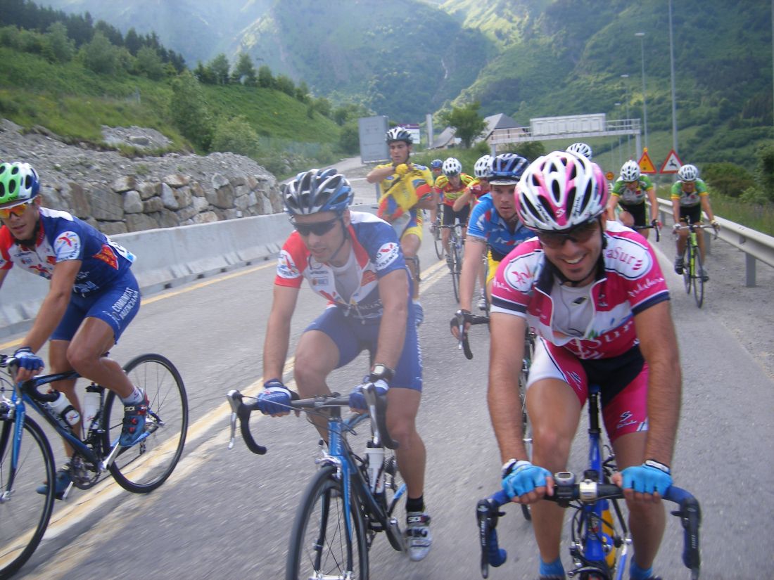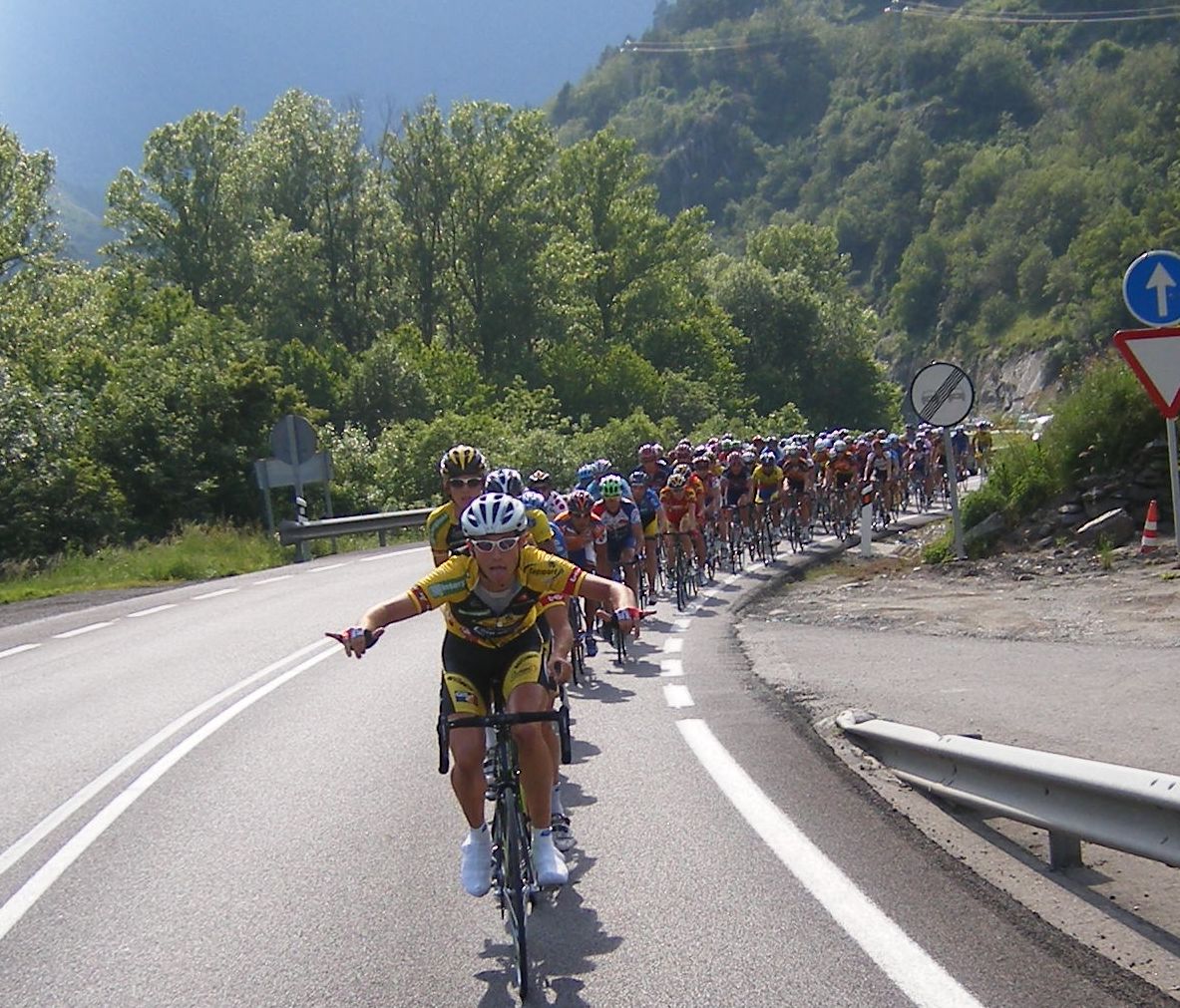Tenía yo ganas en la salida, arranqué muchas veces pero me salieron mal, por que la escapada se hizó justo pasando el sprint especial de Bossot, yo arranqué un km antes, me pasaron por encima, y cuando volví a arrancar no pude pillar, segui arrancando mas veces, haciendo fotos con la camara y tal pero no había pillado la fuga y encima gaste muchas balas mientras todo el mundo iba a rueda de los Davitamon con las garraas afiladas para el puerto del Tunel de Vielha.