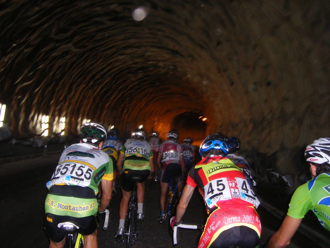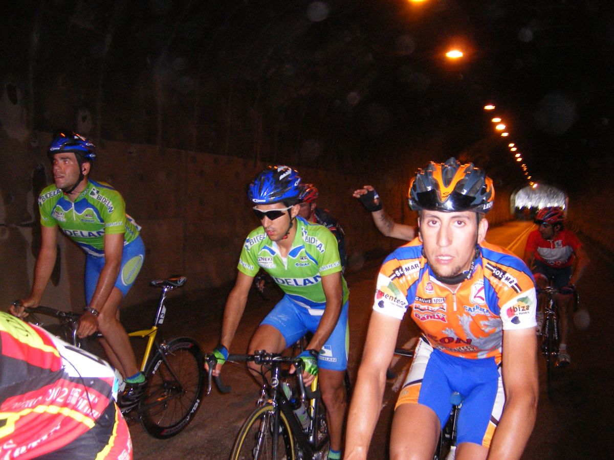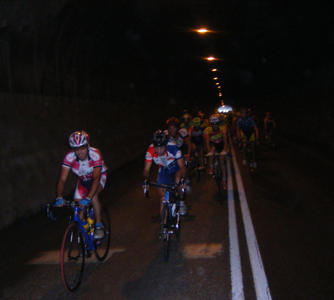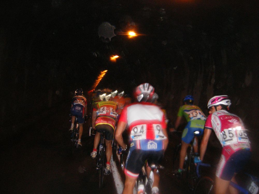 Iba pestoseando el Miguel Rios, Rockandrios, asi que arranqué para hacerle una foto y parara ya, entramos al tunel y allí ya aflojó la grupeta al ver la imposibilidad de enganchar con el pelotón, que iba rotisimo, se había subido muy deprisa y se había hecho añicos. Enganchó por detrás mucha gente en el Tunel con la grupeta, al principio haciendo fotos con el Flash, luego ya a pasar el tunel, que se hacía eterno, 5 kms picando para arriba sufriendo en la oscuridad, una agonía, pareciamos mineros.