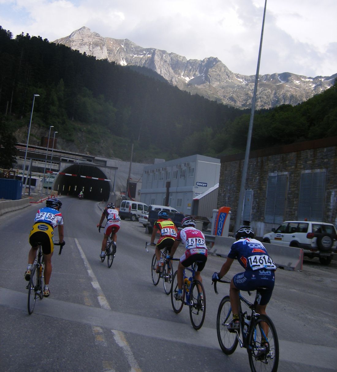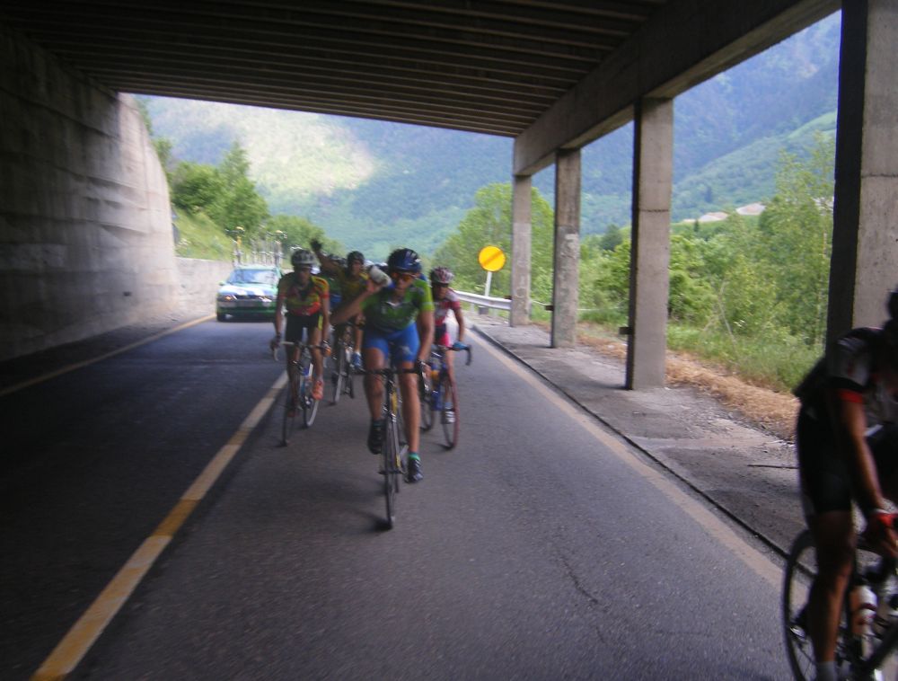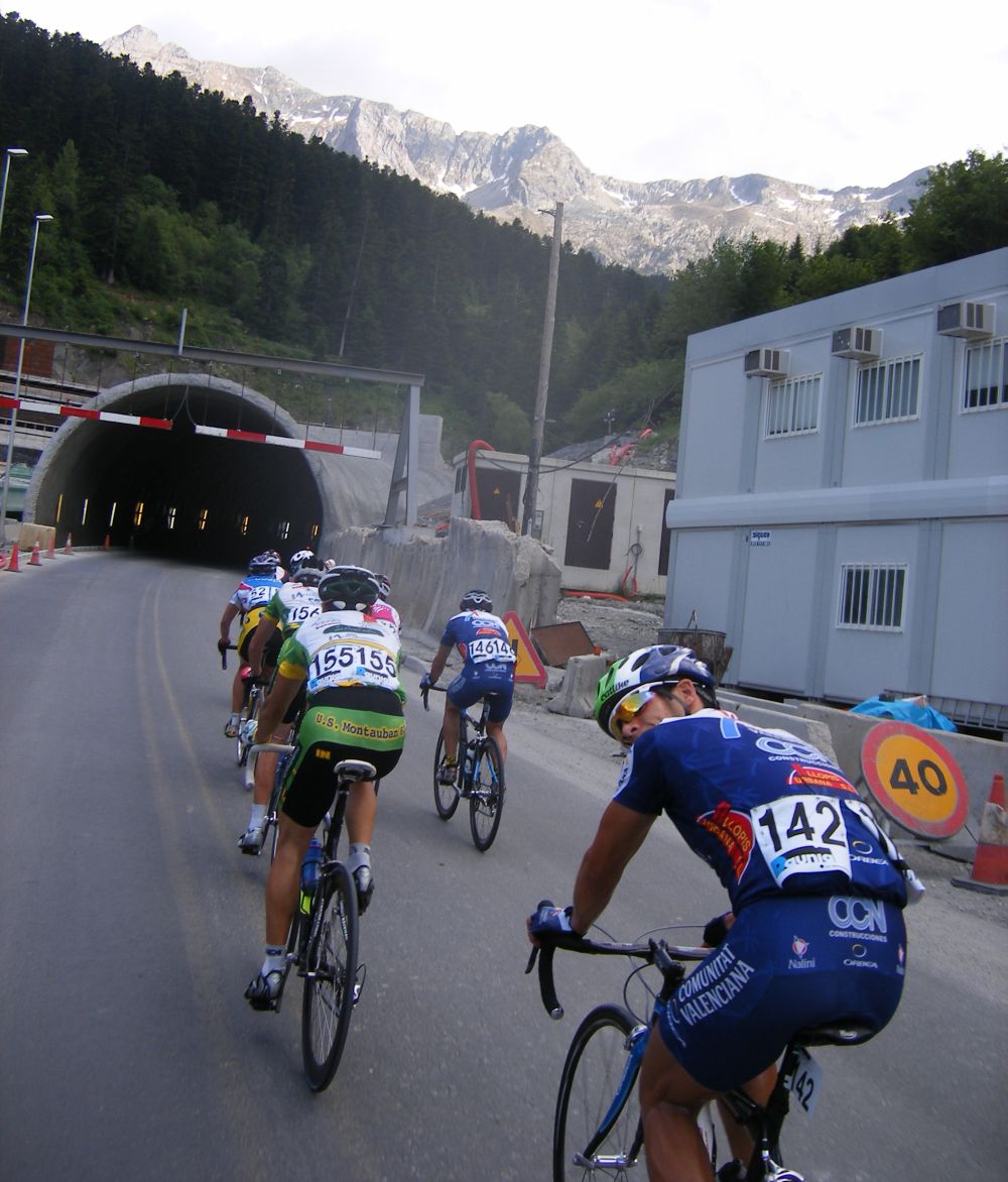 Iba pestoseando el Miguel Rios, Rockandrios, asi que arranqué para hacerle una foto y parara ya, entramos al tunel y allí ya aflojó la grupeta al ver la imposibilidad de enganchar con el pelotón, que iba rotisimo, se había subido muy deprisa y se había hecho añicos. Enganchó por detrás mucha gente en el Tunel con la grupeta, al principio haciendo fotos con el Flash, luego ya a pasar el tunel, que se hacía eterno, 5 kms picando para arriba sufriendo en la oscuridad, una agonía, pareciamos mineros.