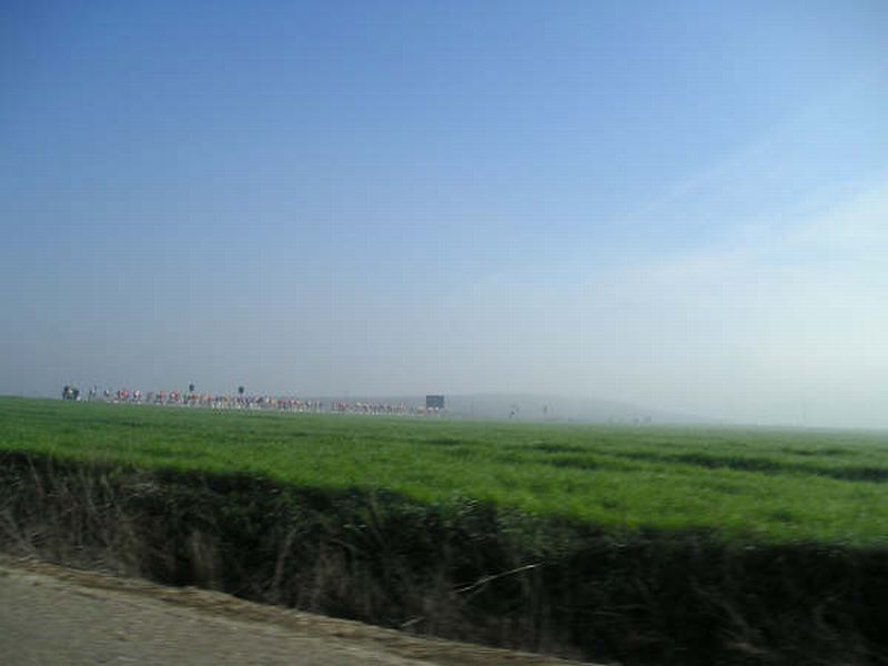 Con una participación de casi 100 corredores salimos en una mañana soleada con el fresquito propio, 5 grados, de Toledo, aunque pronto subiría y bastante la temperatura. Los primeros kms en Olias pican para abajo, con lo que se salió a mil por hora, yo iba tranquilo en la oficina, a unas velocidades de 70 por hora es dificil que se vaya nadie, aunque a esas velocidades tampoco se iba comodo en la oficina, ahi engatillado esprintando, pero por alante no se iba nadie, nadie.
