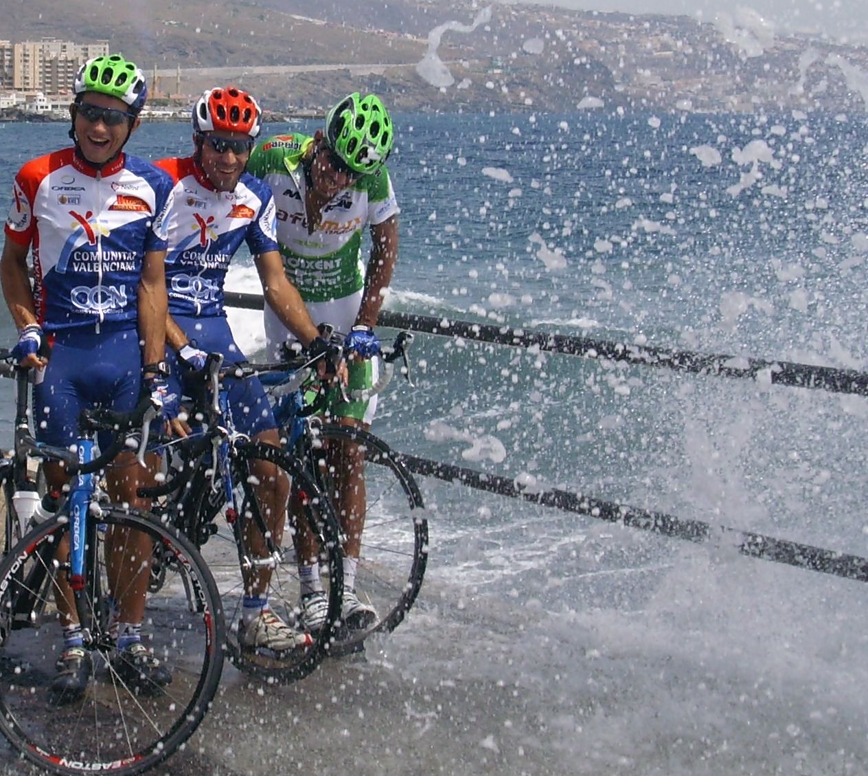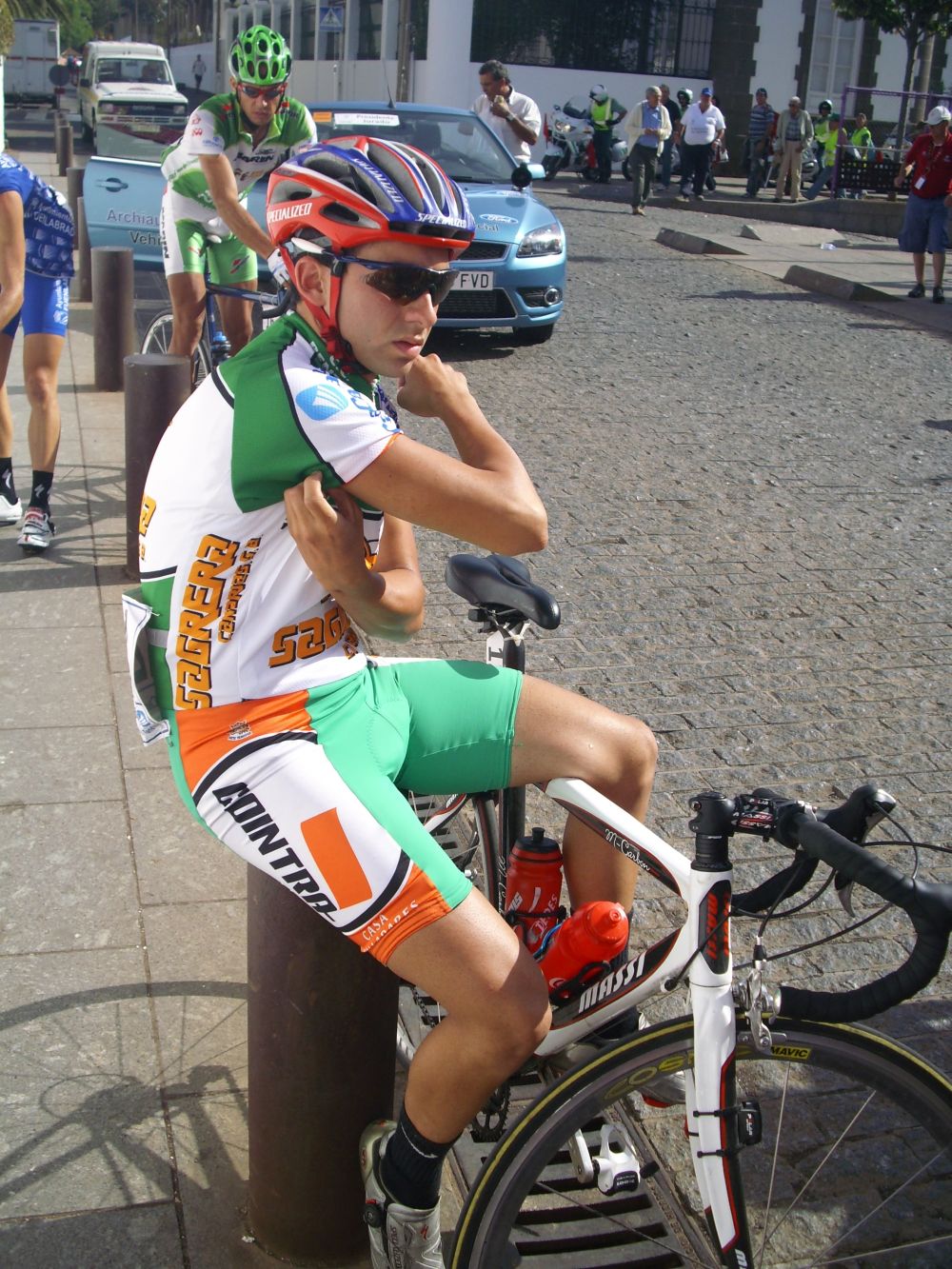 Nos cogieron girando a la derecha cogiendo la carretera de Guía de Isora, la cara Oeste del Teide, que es de un asfalto muy botoso, allí arranco el segundo de la General, Diego Tamayo, con sus calcetines Diegoweb, enfiló a todo el paquete y tuvo que salir el lider a por el, Belda, fue un ataque durisimo, ademas pegaba aire de costado, metieron cuneta y se enfiló aquello pero empezamos la bajada y ya se tranquilizó la cosa, Willy seguía controlando, menuda etapa se marcó el colombiano de Cosaor.