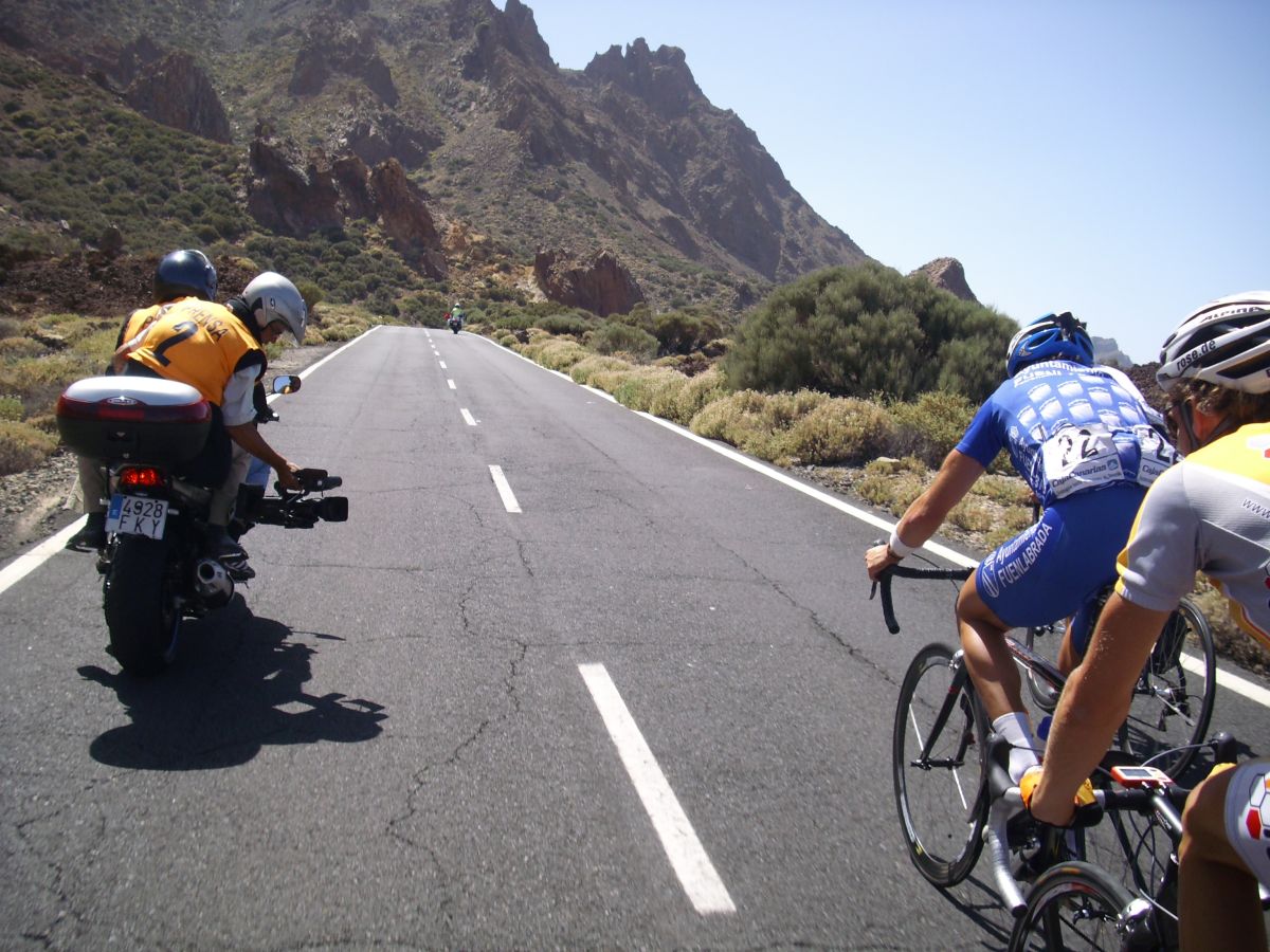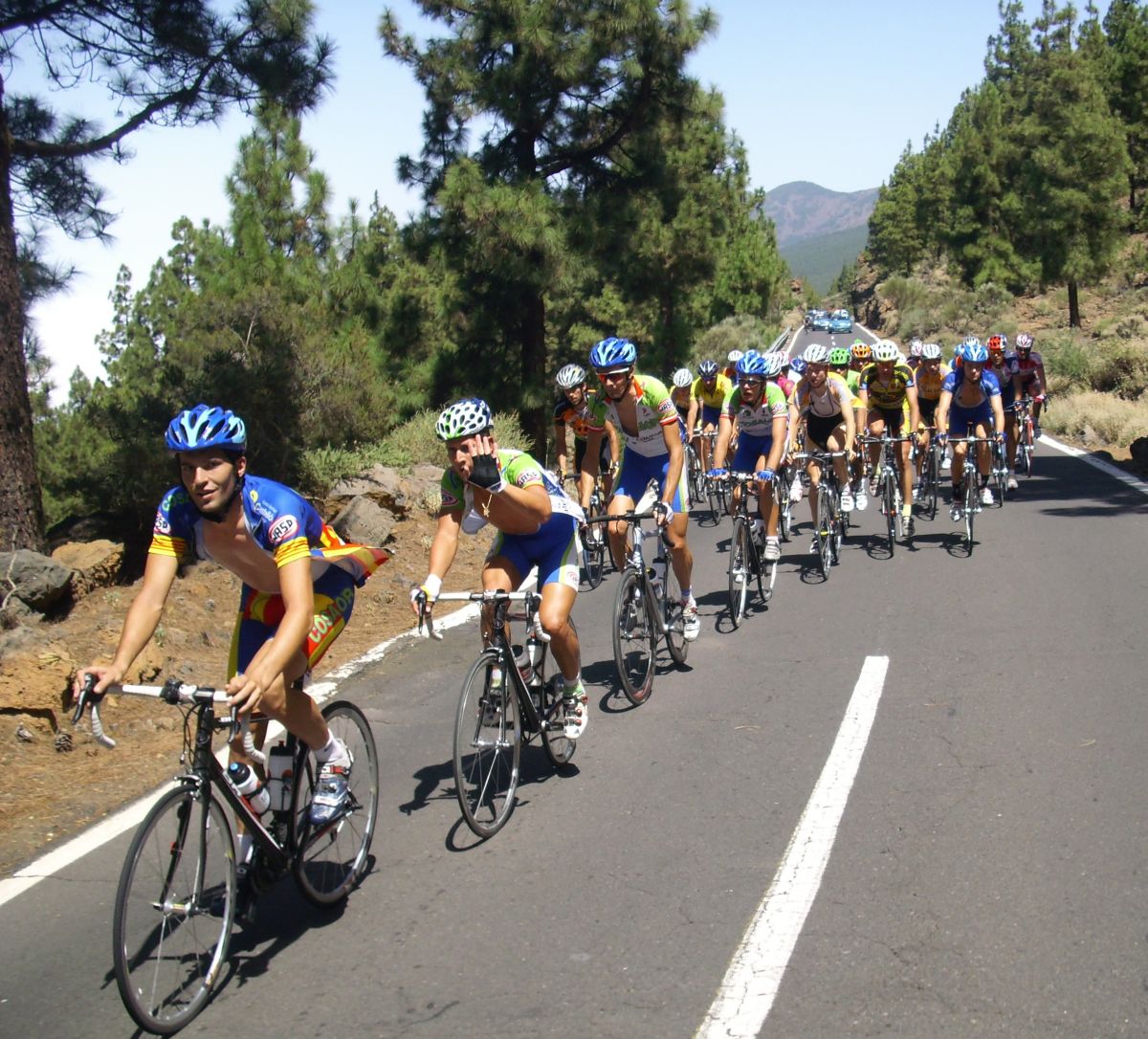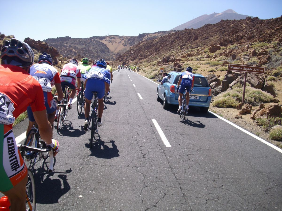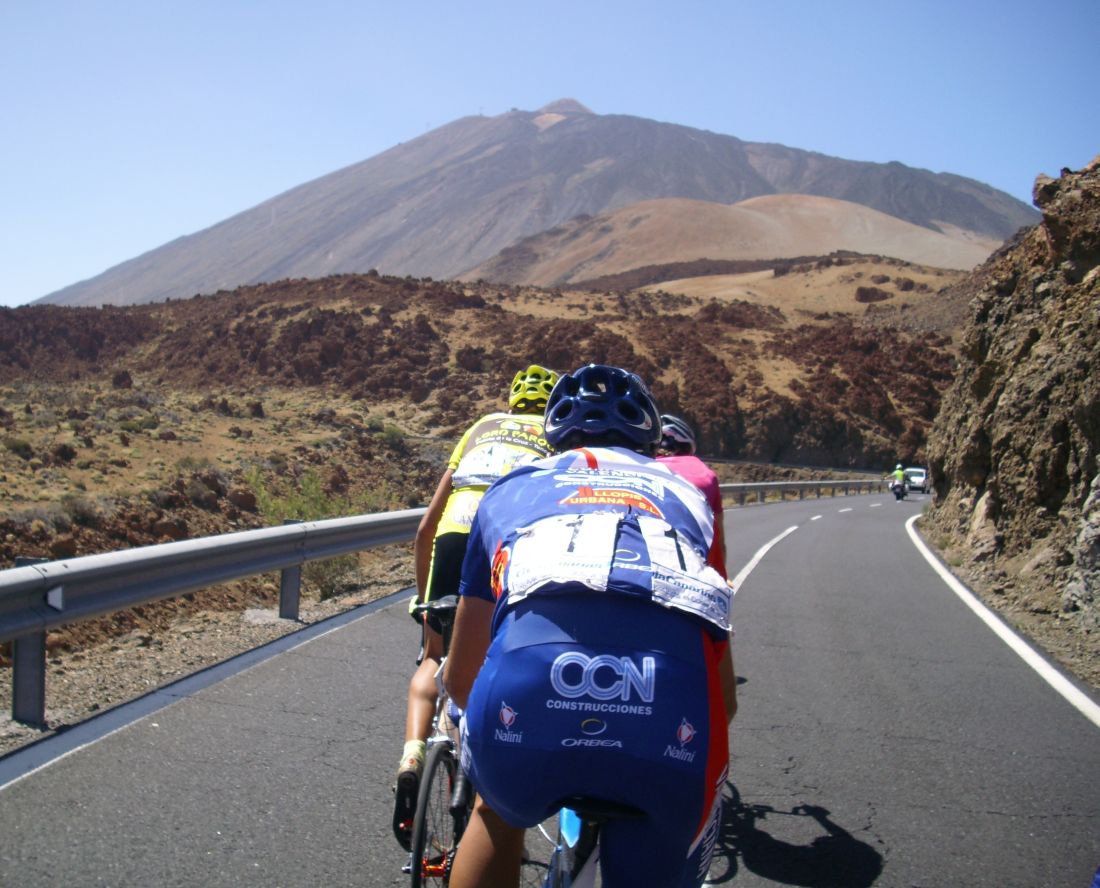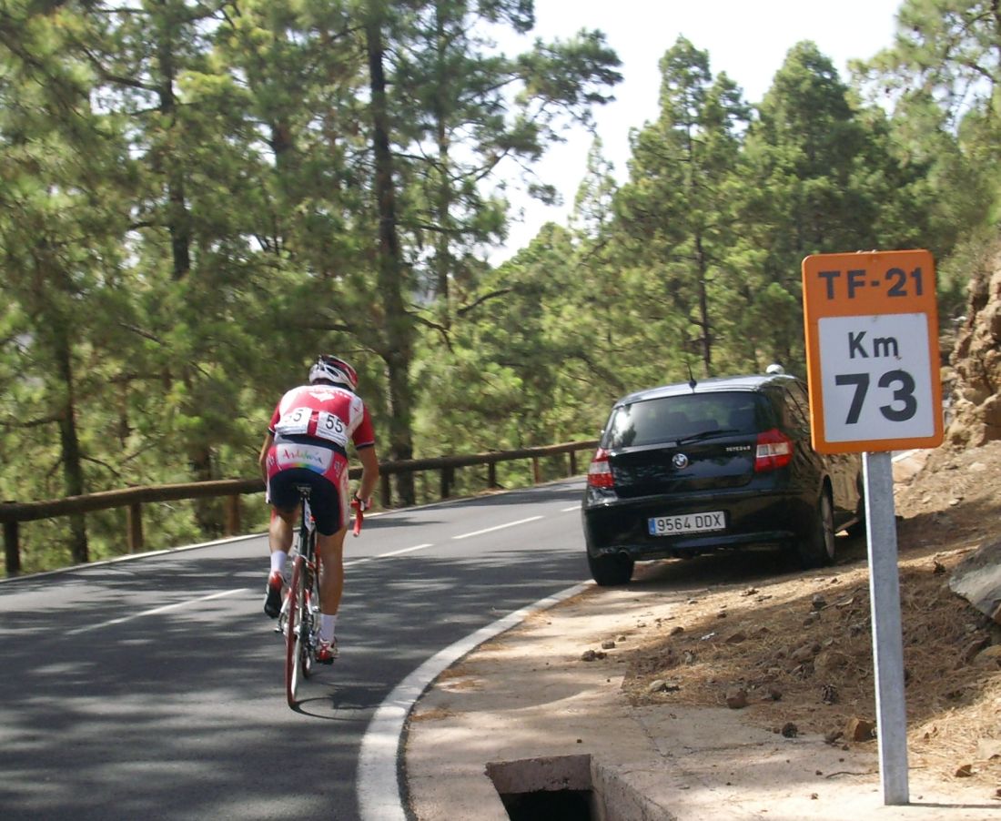 Ya habíamos coronado el puerto, pero quedaban muchos repechos, donde pegaba mucho aire de cara, salí a un ataque del Cubano que me reventó, luego salí a por otro, llego el Carras, nos fuimos un poco los tres, pero nos cogieron, ibamos a ostias hasta que Willy del Cosaor puso un poco de orden, era el único hombre del Cosaor que quedaba ya para tirar, con Soto y Belda. Yo recuperé un poco, hice algunas fotos del Teide en el grupo del lider donde solo aguantabamos 15 tios, y arranqué para meterme en un corte peligroso donde iban los Canarios Mendez, Zamora y Jacob Reyes, también iba Taffi, un alemán del Akud y 2 Ditec, pero los canarios no tiraban porque se estaban vigilando, yo tampoco podía tirar por que llevaba a Mate y a Comino delante, asi que el corte fue cazado saliendo de la Base del Teide.
