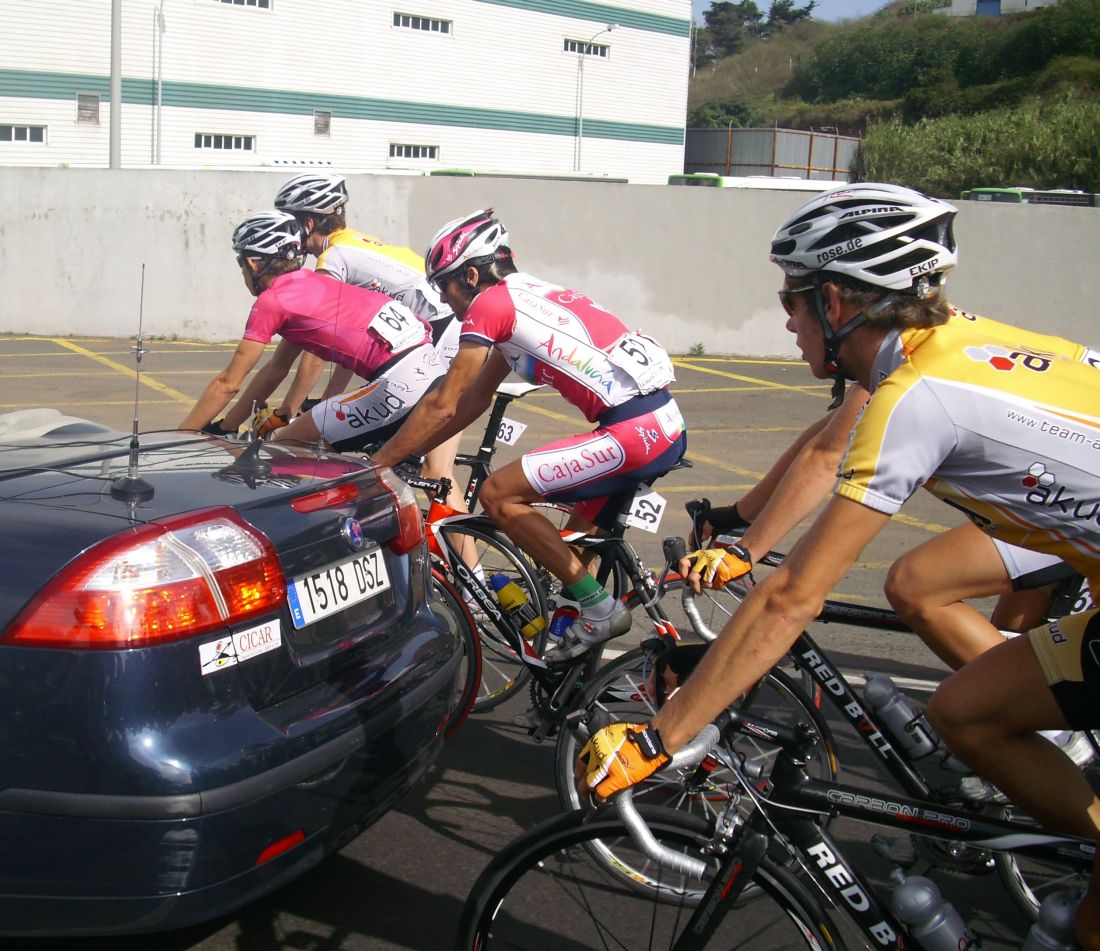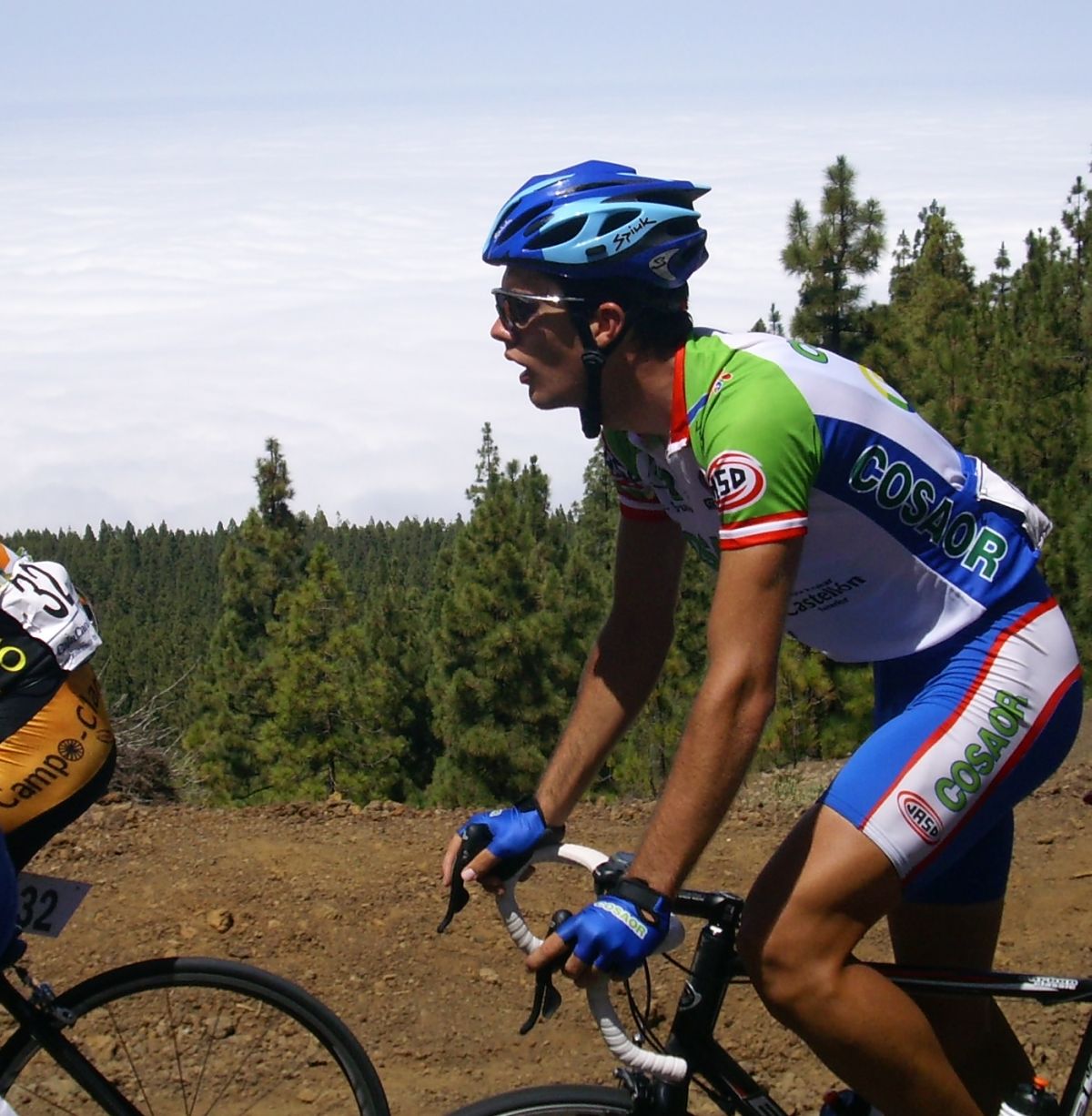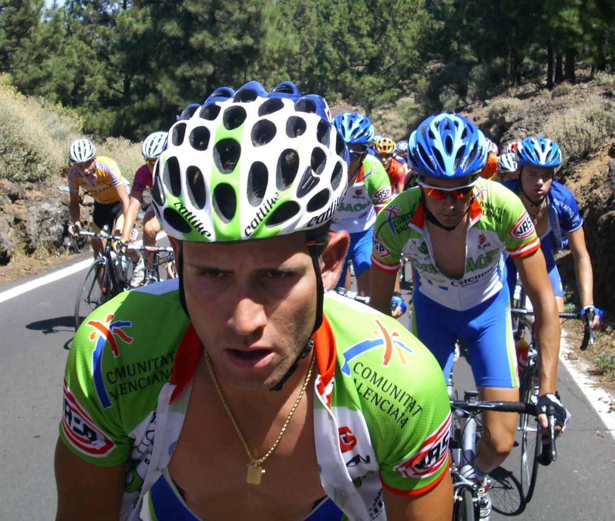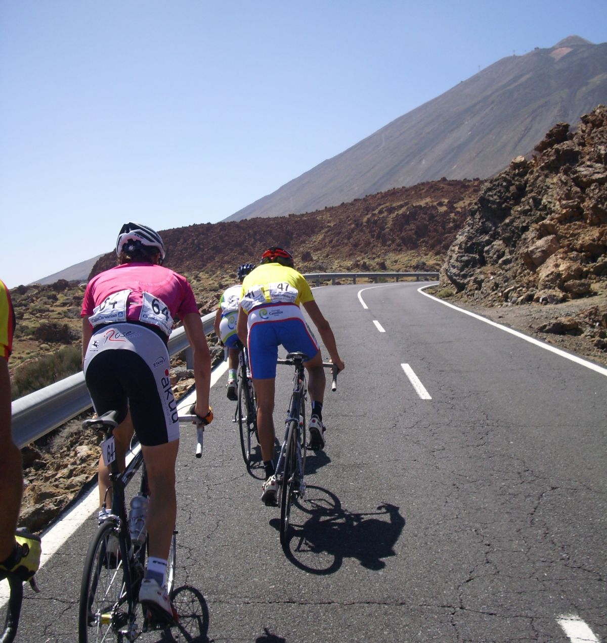 Ya habíamos coronado el puerto, pero quedaban muchos repechos, donde pegaba mucho aire de cara, salí a un ataque del Cubano que me reventó, luego salí a por otro, llego el Carras, nos fuimos un poco los tres, pero nos cogieron, ibamos a ostias hasta que Willy del Cosaor puso un poco de orden, era el único hombre del Cosaor que quedaba ya para tirar, con Soto y Belda. Yo recuperé un poco, hice algunas fotos del Teide en el grupo del lider donde solo aguantabamos 15 tios, y arranqué para meterme en un corte peligroso donde iban los Canarios Mendez, Zamora y Jacob Reyes, también iba Taffi, un alemán del Akud y 2 Ditec, pero los canarios no tiraban porque se estaban vigilando, yo tampoco podía tirar por que llevaba a Mate y a Comino delante, asi que el corte fue cazado saliendo de la Base del Teide.