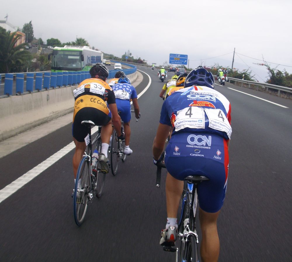 El Maté ya cogió el primer tren para alante, yo esperé al segundo, saltó un grupito poco después y salté por ellos y ahí me metí, cogieron rapidamente al grupo de Maté y ya se consolidó la escapada buena, bajando por la Autopista del Norte, camino de Santa Ursula. Por autopista bajando se rueda muy bien, 70-80 por hora, hasta 86 por hora que ibamos en la fuga, nos plantamos en Puerto de la Cruz rápidamente, yo sacando alguna foto y tal, teníamos ya un minuto de ventaja y la cosa iba creciendo, ibamos 8 tios dando relevos a tope, atrás tiraba el Cosaor para Belda.