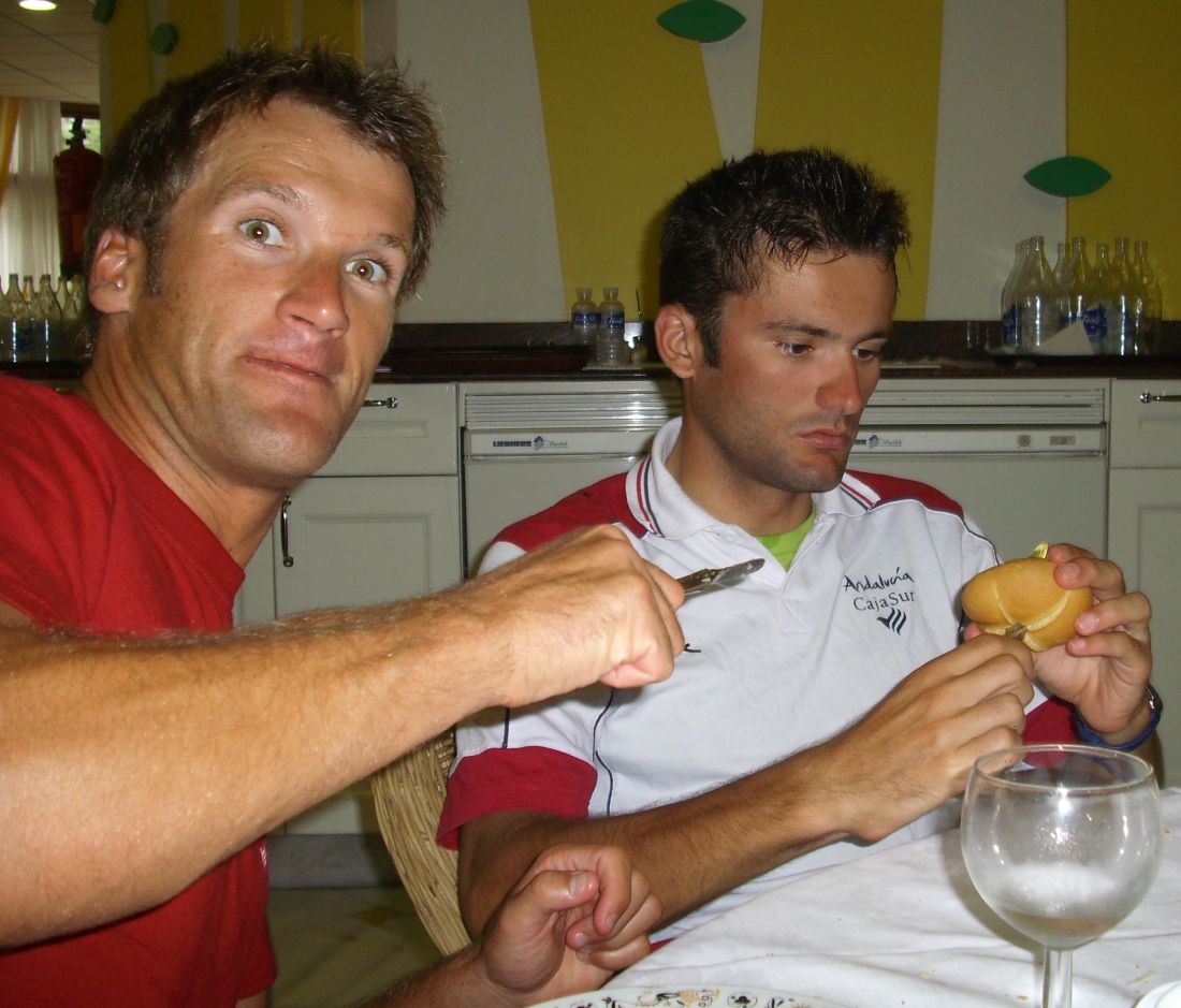 Subi el puerto todo atrancado, pero iba a una marcheta buena, no era demasiado duro el puerto, empezé a coger gente y gente, iba todo el mundo clavado, el grupo que iba conmigo les cogi rapido, solo me siguió un Triple Coronita, que iba con su director metiendole presión para que me aguantara porque era el que mejor iba de su equipo, le fui esperando un poco hasta que ya me aburrí y seguí para alante solo cogiendo a mas gente sin forzar demasiado, solo hacía que arrastrar el 17, al final ya me entró el 19 sin que se me saliera la cadena asi que ya iba perita, jeje, eso si, como metiera el 21 se salía fijo, cogí al lider de los Canarios y al final vi al Maté, el hombre que dió el Saque de honor.-Mate!! que haces esperandome o que?? .-Vengo malisimo, buff, luego paro a potar bajando, se puso malisimo el Maté en la primera etapa, decía que las imprudencias se pagaban pero el decía que era tan borrico que al dia siguiente iba a volver a arrancar de salida.