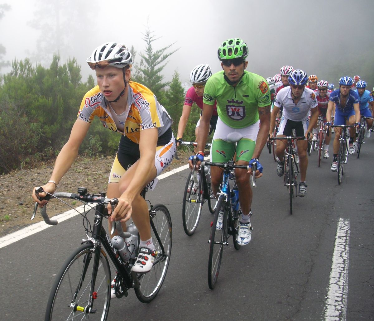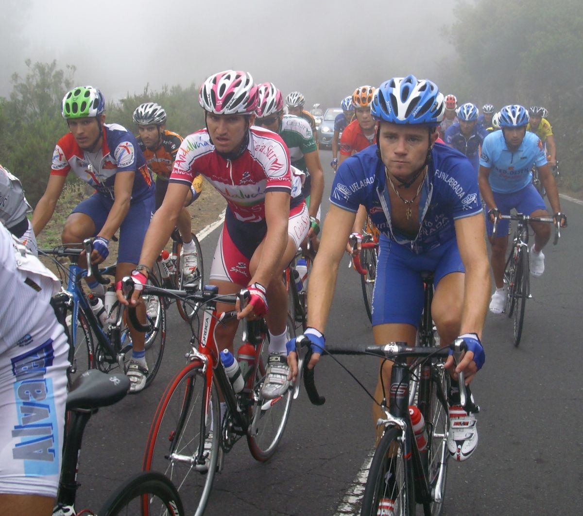 Este año se subía el Teide por la Orotava, tenía algunas emboscadas al principio, rampas duras con adoquines, o de carretera rota, pero se subía bien, los Cosaor iban tirando al paso, poco a poco nos ibamos adentrando en las nubes, en la niebla, pero había que subir hasta los 2400 metros, mucho mas arriba que las nubes, se iba bien en el pelotón subiendo a rueda hasta que Torrella inició las hostilidades, ibamos subiendo a 19-20 y Torrella enfiló el paquete a 30 por hora, buff que látigo, que dolor, yo sufriendo ahí a rueda del Maté, cerrando ya el grupo, menudo clareo hizo el Torrella, ademas había una bajada en medio de la subida con algunas curvas peligrosas, que menos mal que ya me cambiaron las cubiertas, sino me habría quedado fijo, aun asi lo pasé mal pero se tranquilizo un poco la cosa y ya recuperé, aunque ya el pelotón perdió muchas unidades.