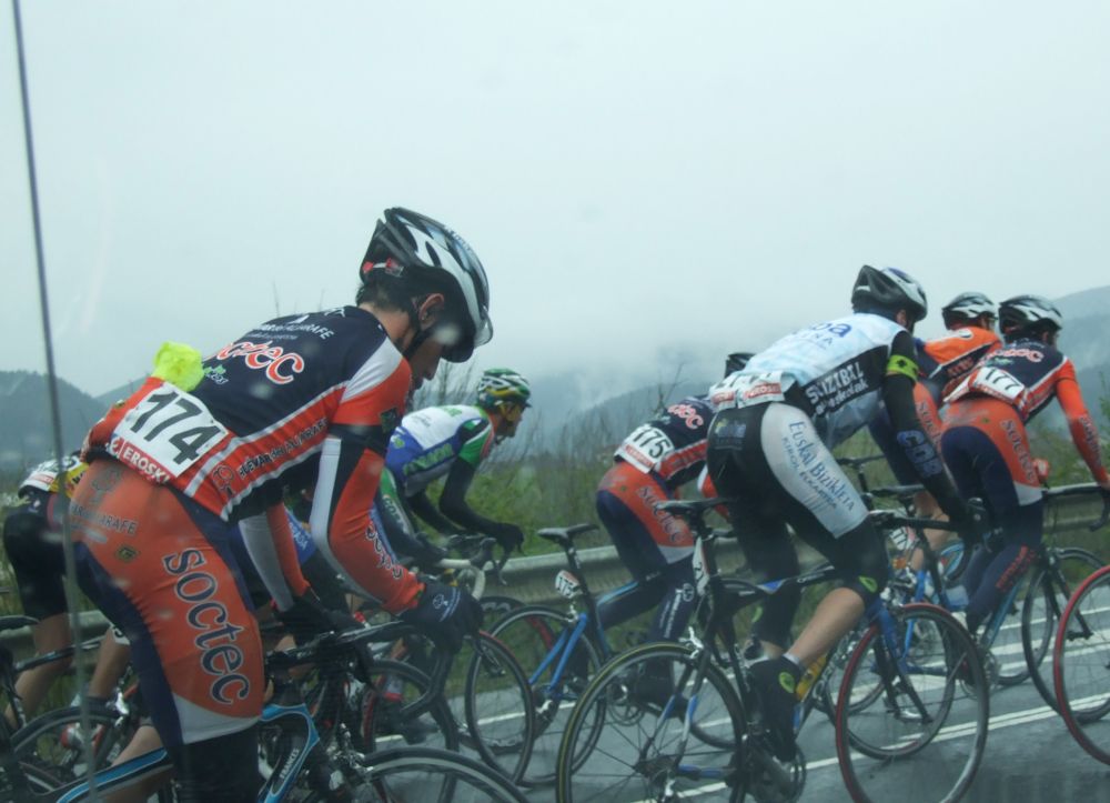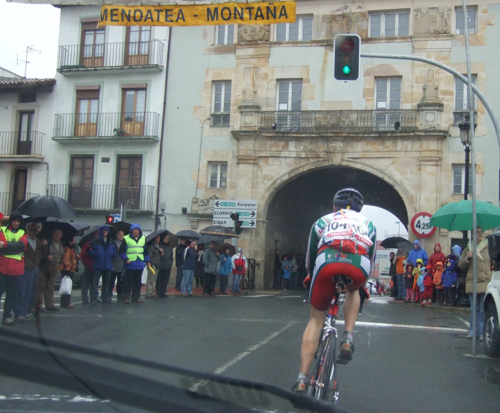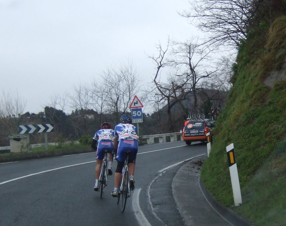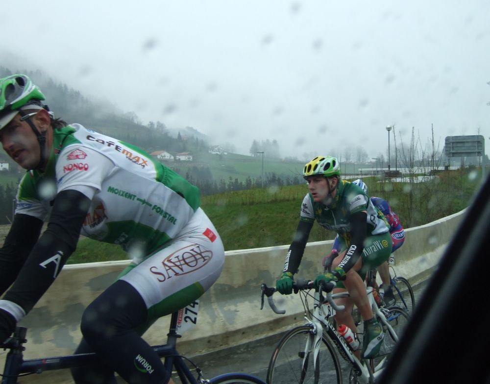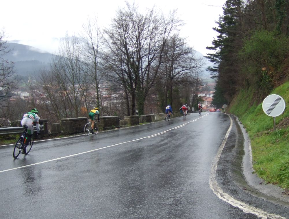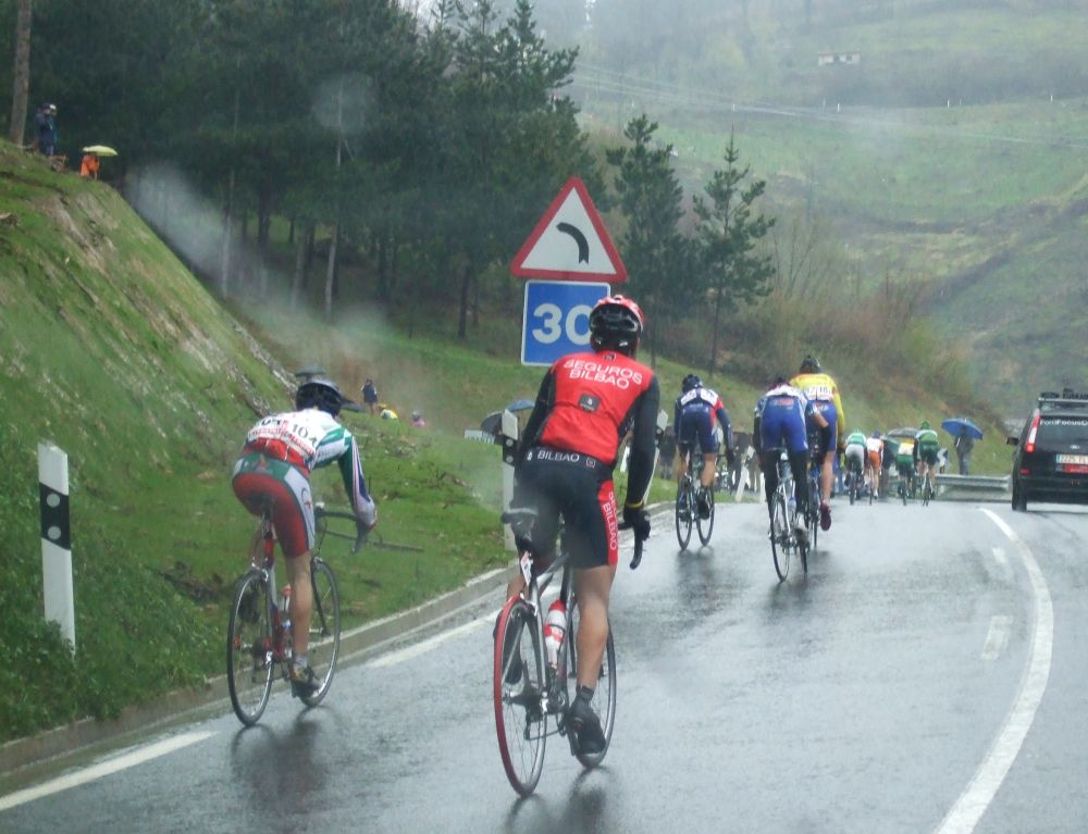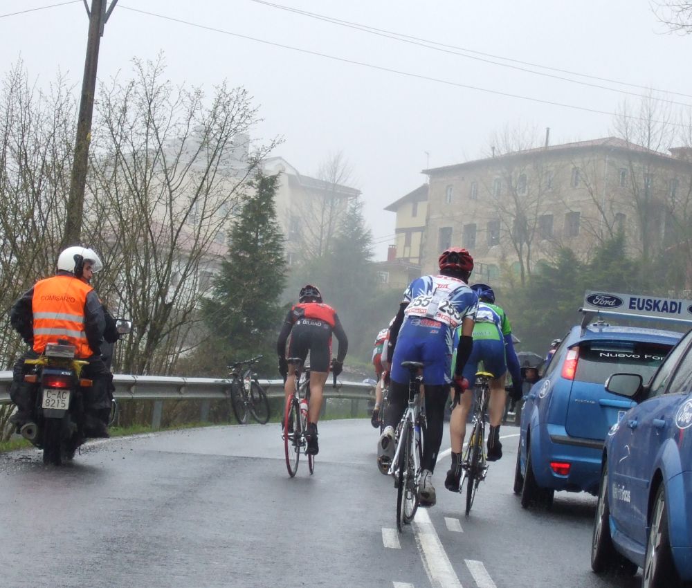 Al principio uno va bien, no es un frio excesivo, lluvia, tampoco pasa nada, primeros kms picando para abajo hacia Elgoibar, carretera muy mojada y resbaladiza, terreno donde se va muy deprisa. En ese terreno favorable pinchó Esteban y de lo rápido que se va por allí no pudo enganchar ni entre coches.
