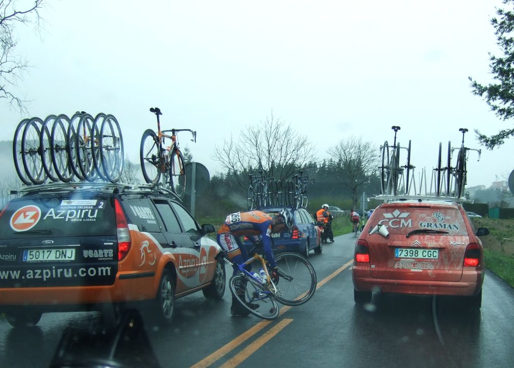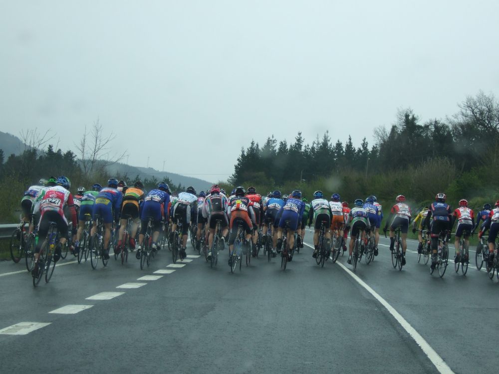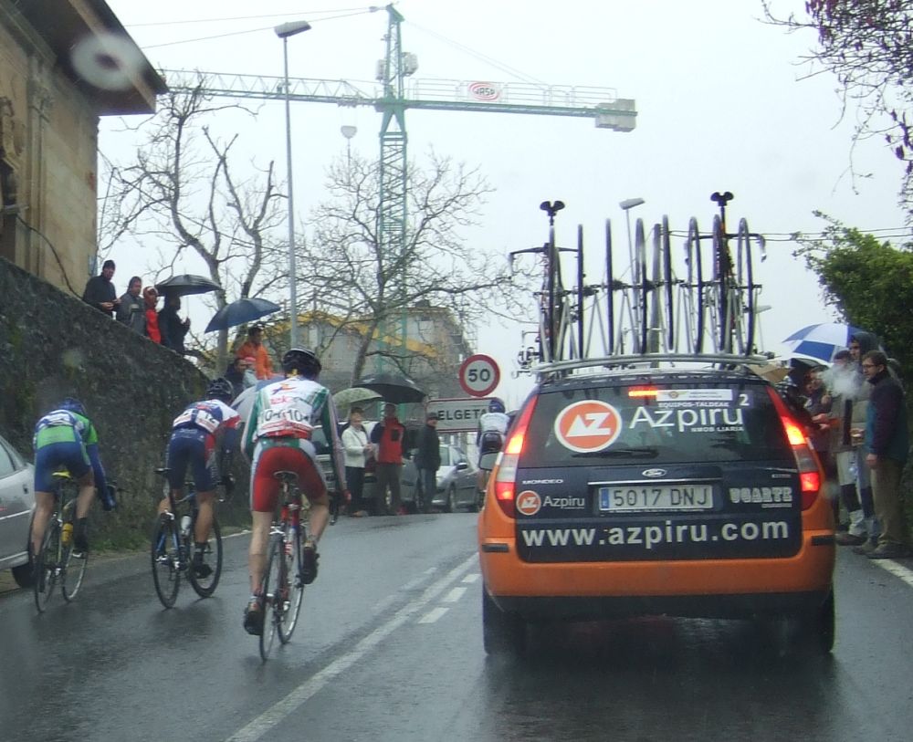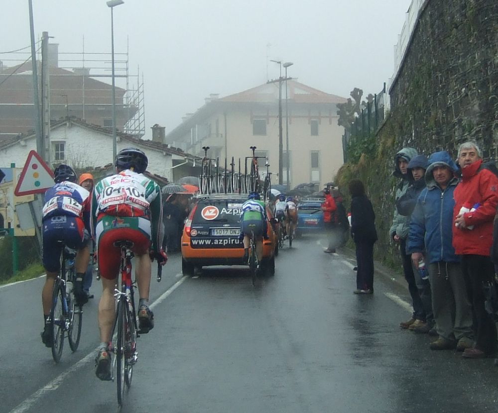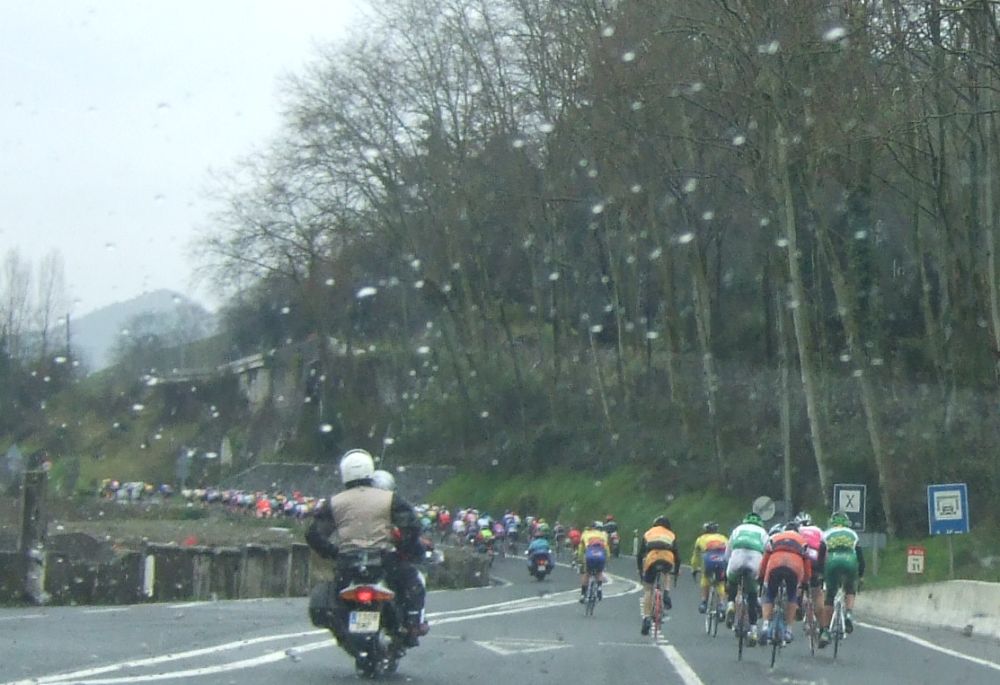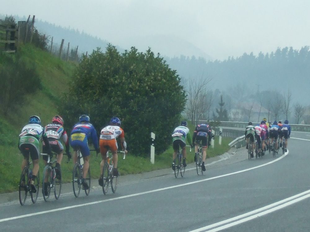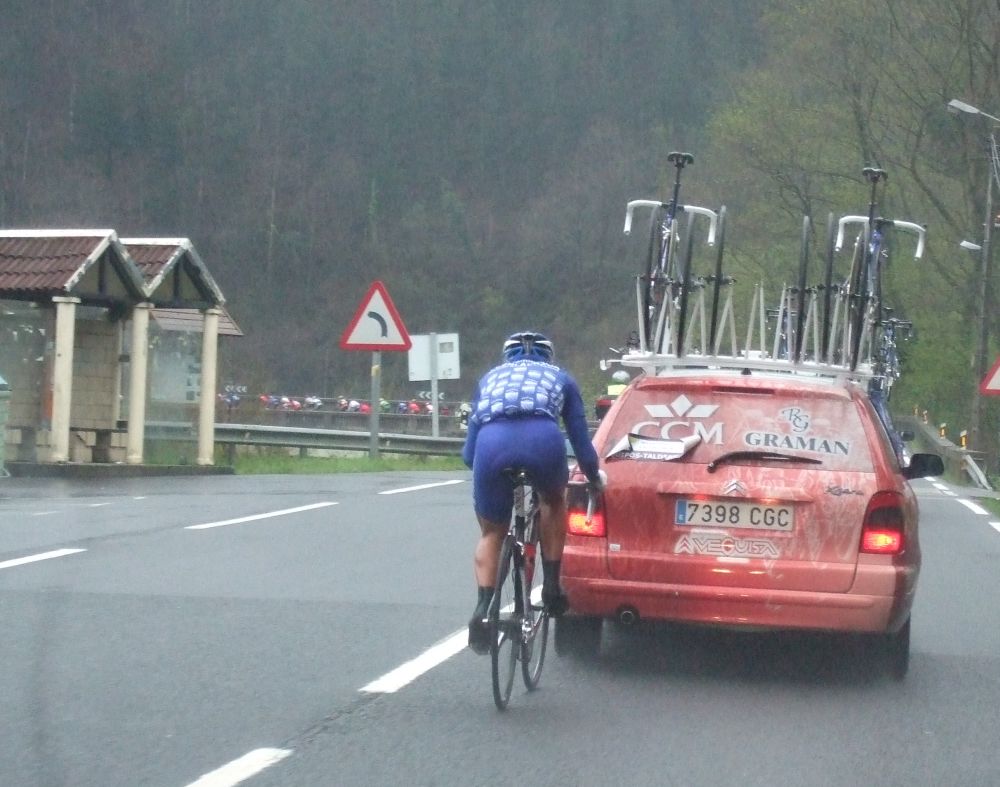 Al principio uno va bien, no es un frio excesivo, lluvia, tampoco pasa nada, primeros kms picando para abajo hacia Elgoibar, carretera muy mojada y resbaladiza, terreno donde se va muy deprisa. En ese terreno favorable pinchó Esteban y de lo rápido que se va por allí no pudo enganchar ni entre coches.