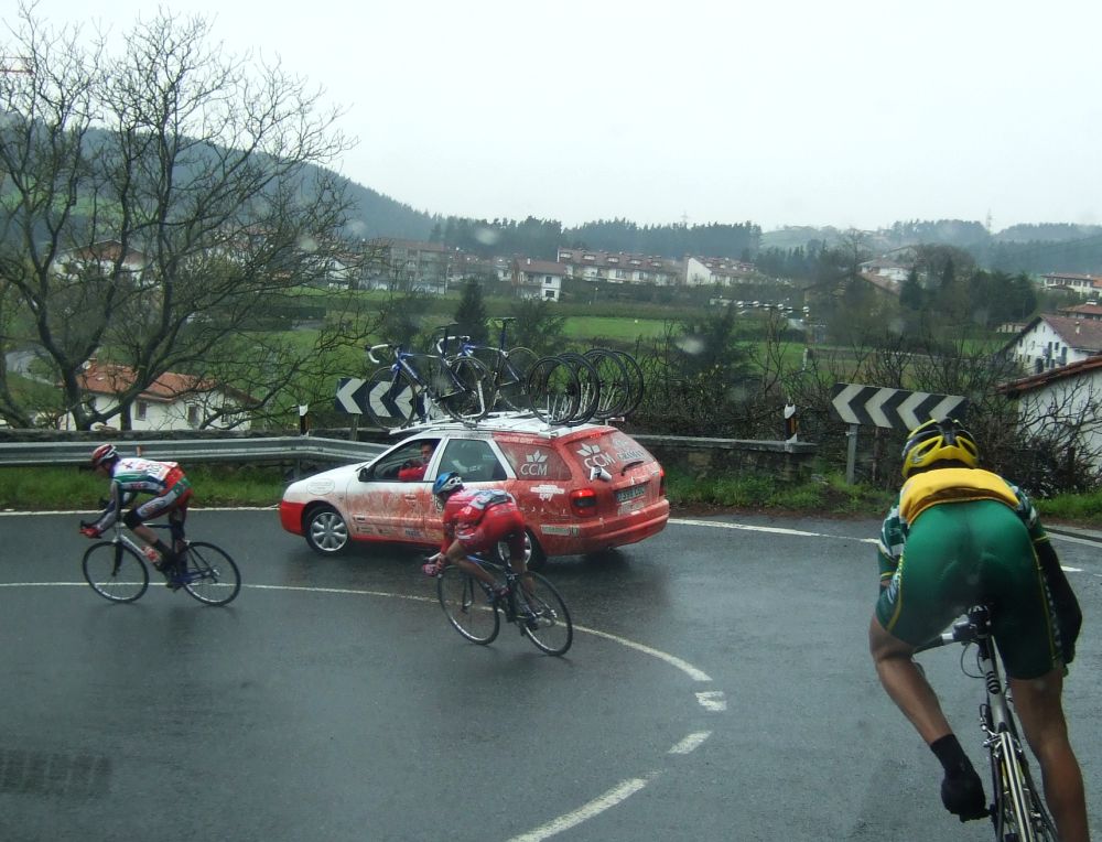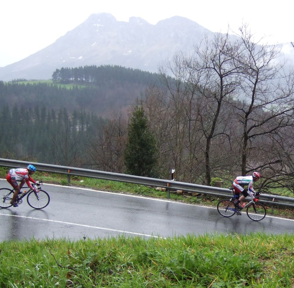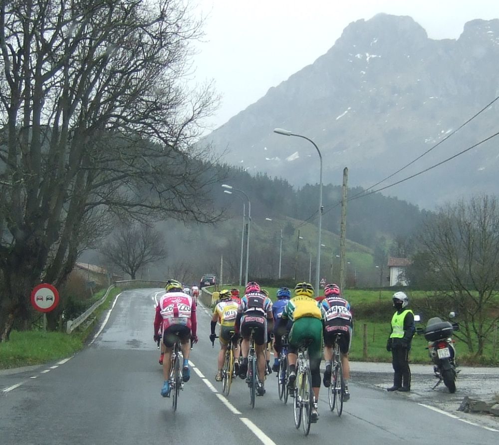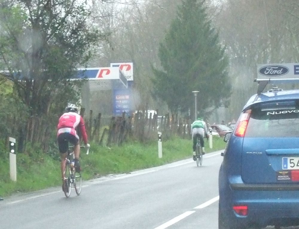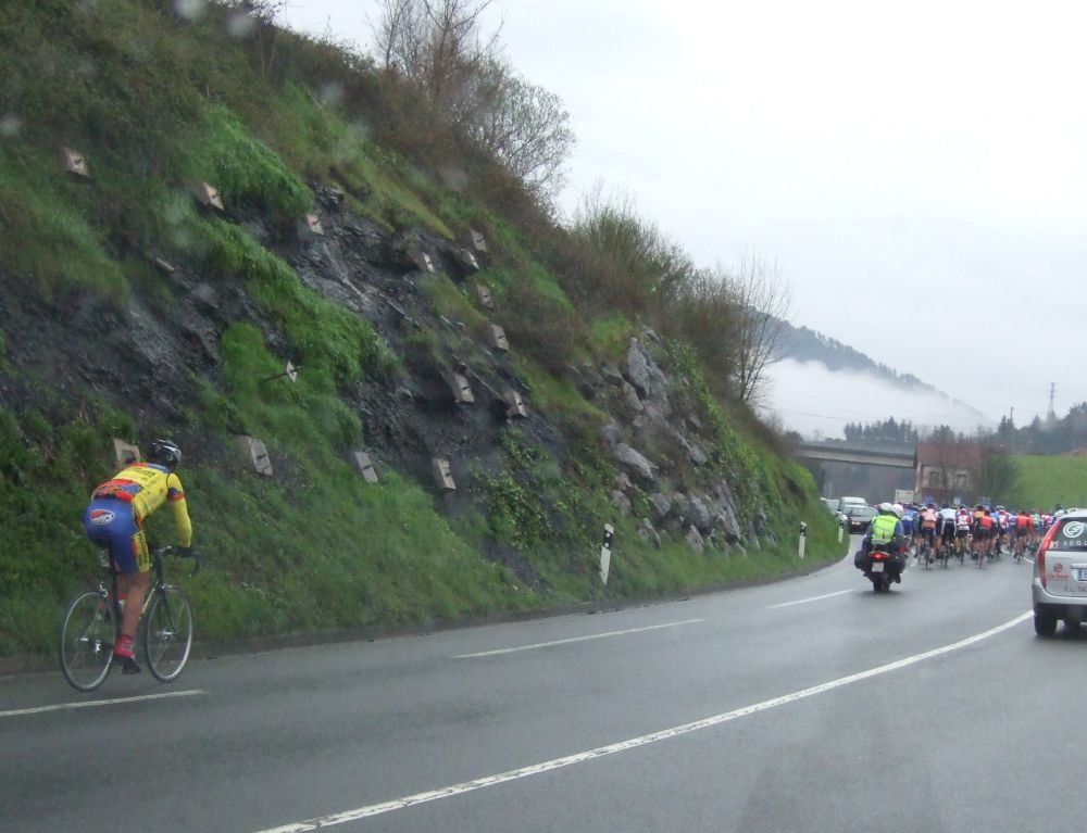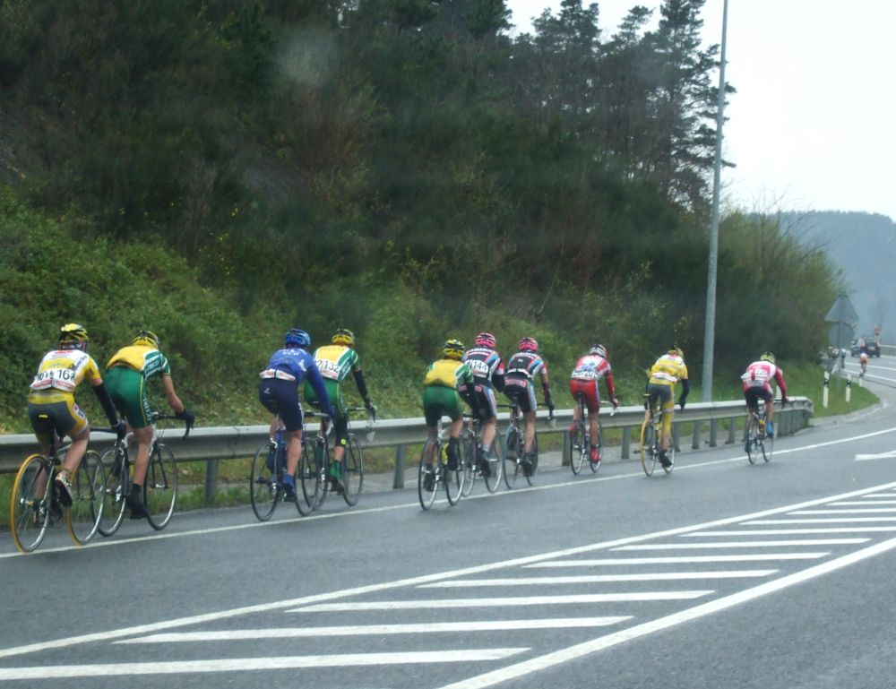 Al principio uno va bien, no es un frio excesivo, lluvia, tampoco pasa nada, primeros kms picando para abajo hacia Elgoibar, carretera muy mojada y resbaladiza, terreno donde se va muy deprisa. En ese terreno favorable pinchó Esteban y de lo rápido que se va por allí no pudo enganchar ni entre coches.