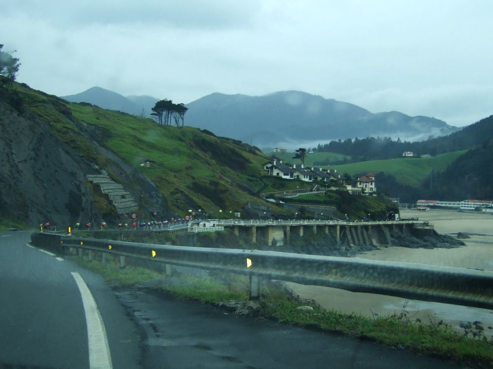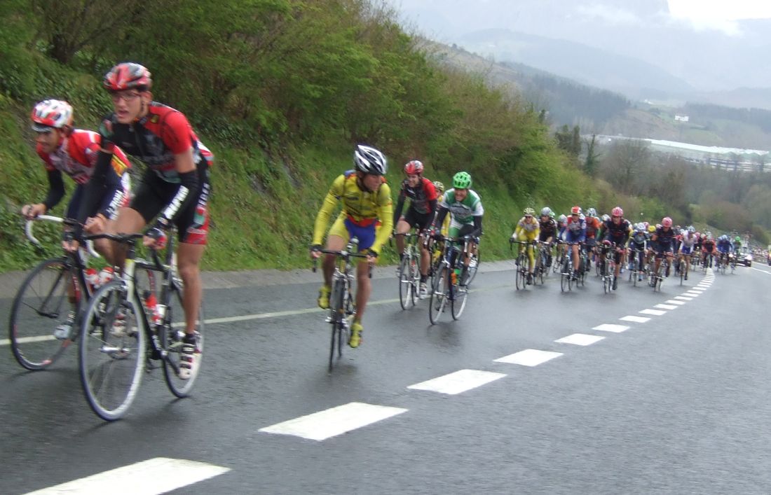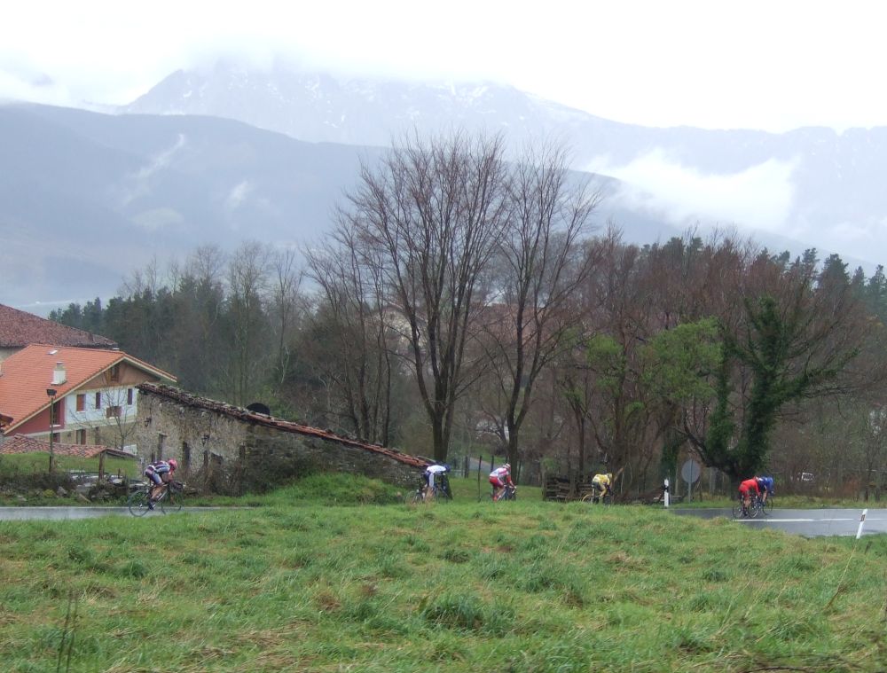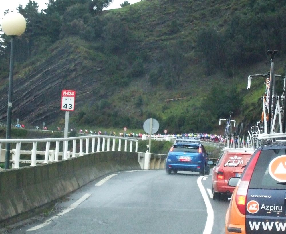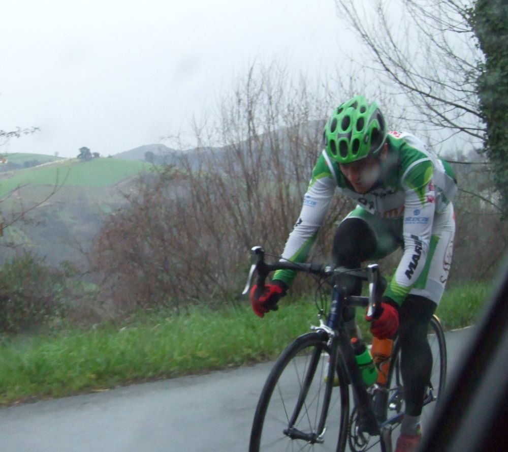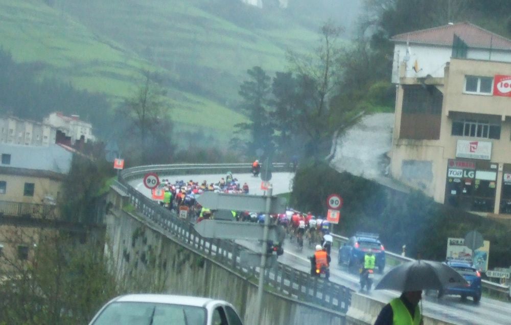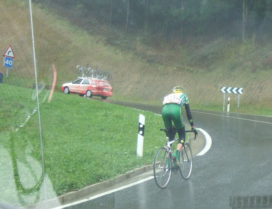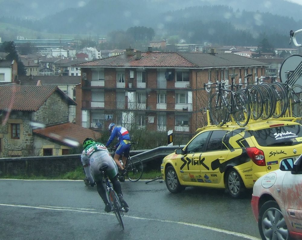 Al principio uno va bien, no es un frio excesivo, lluvia, tampoco pasa nada, primeros kms picando para abajo hacia Elgoibar, carretera muy mojada y resbaladiza, terreno donde se va muy deprisa. En ese terreno favorable pinchó Esteban y de lo rápido que se va por allí no pudo enganchar ni entre coches.
