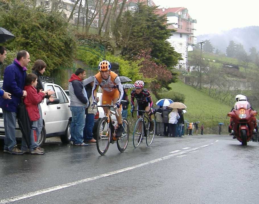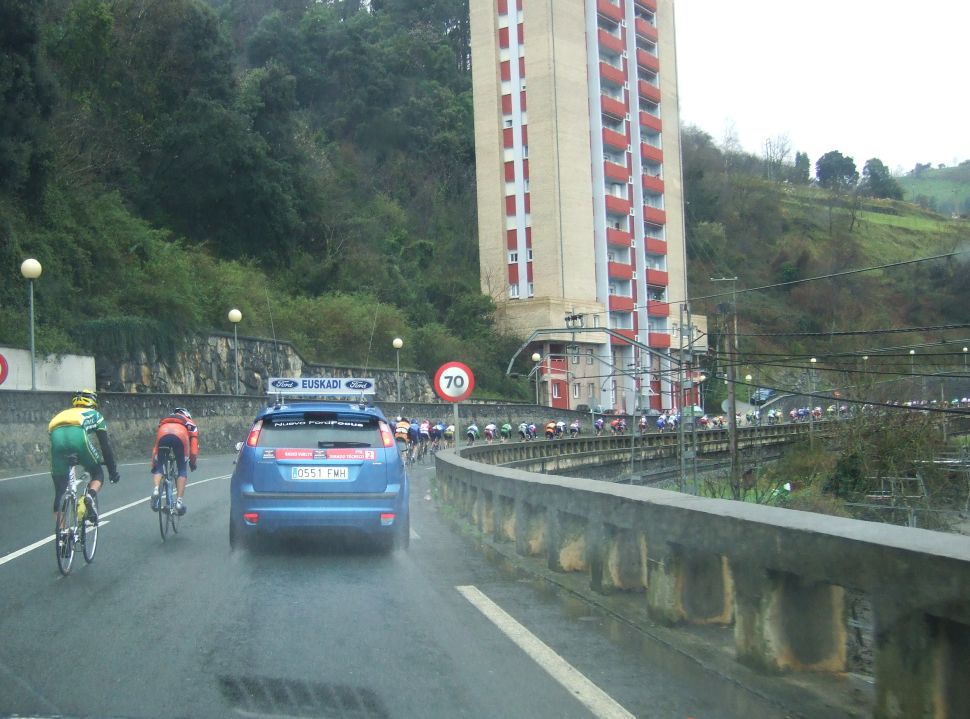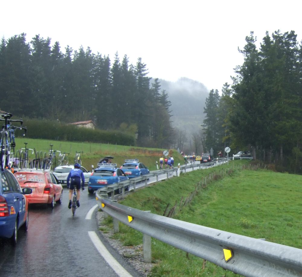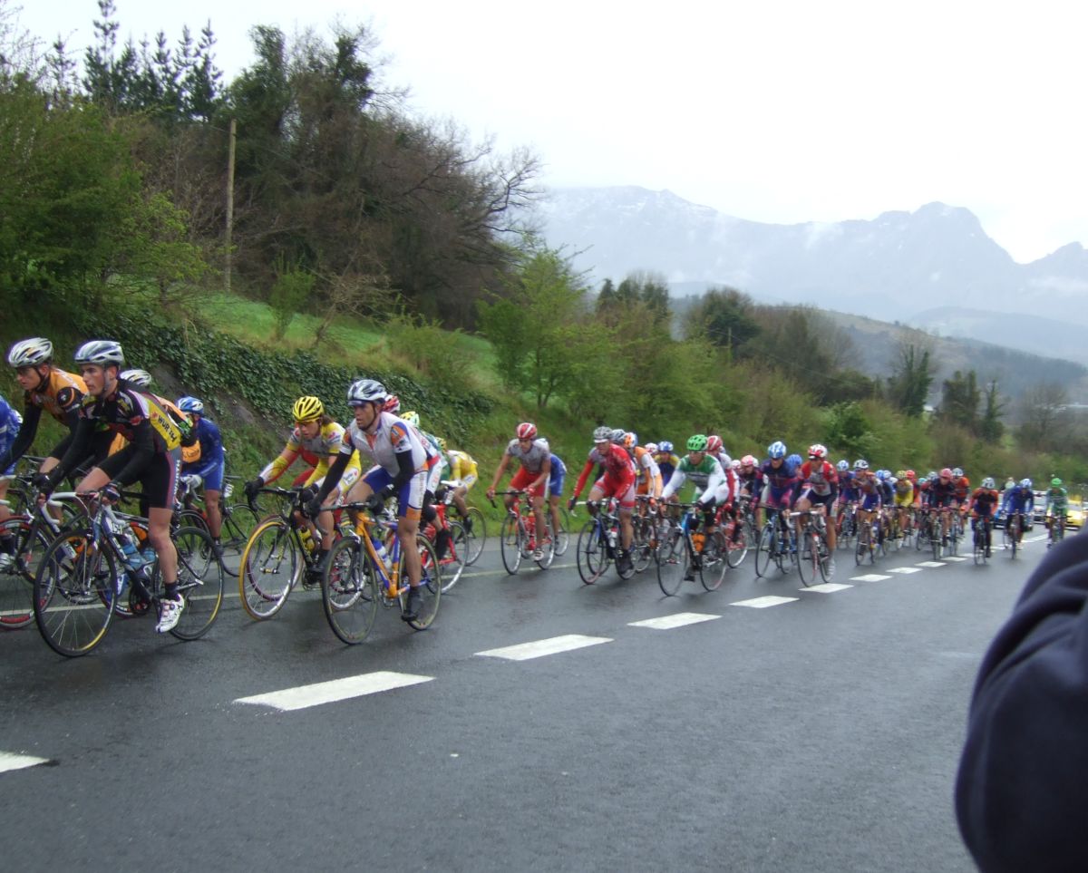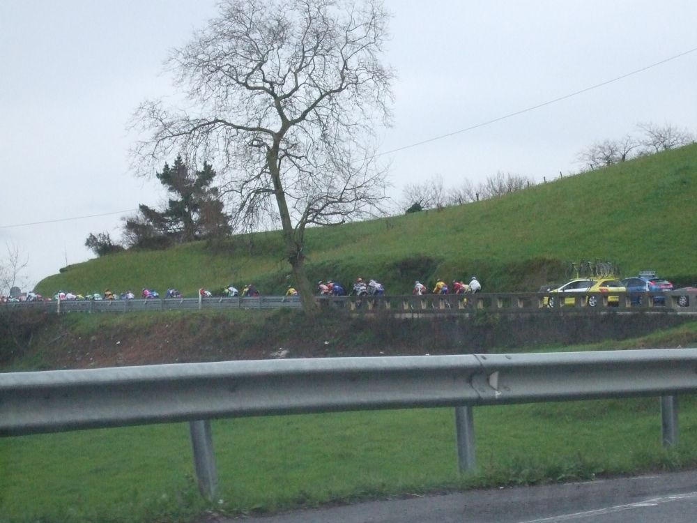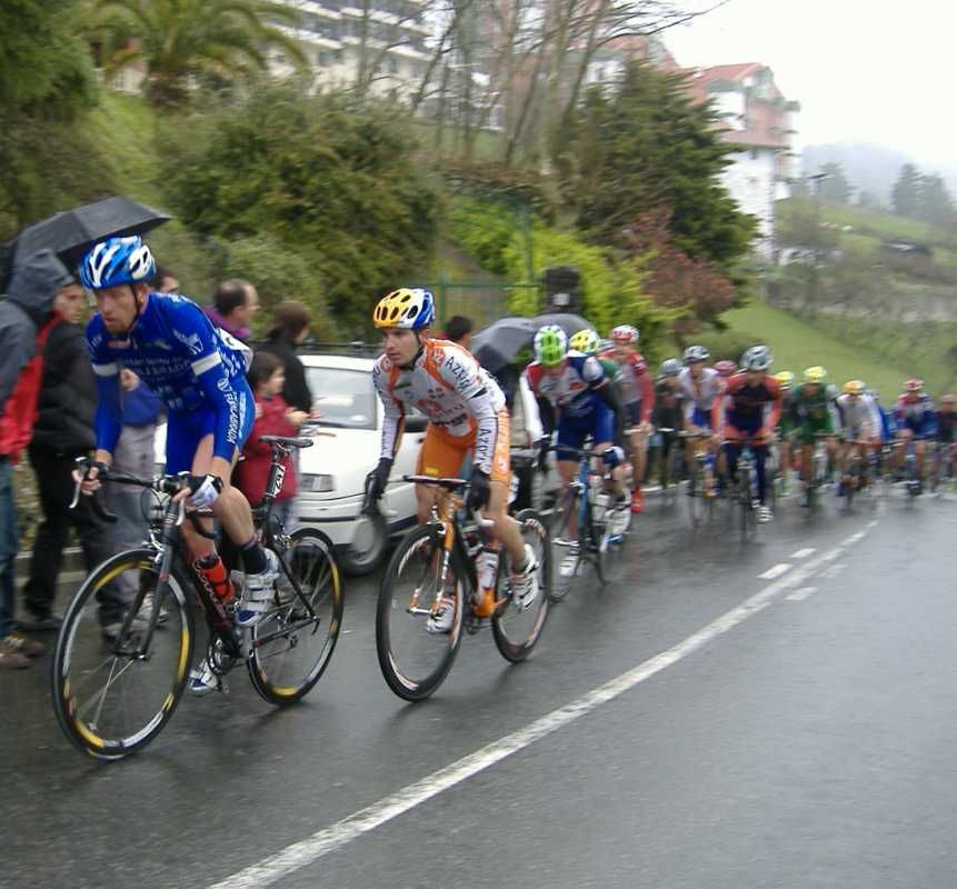Al principio uno va bien, no es un frio excesivo, lluvia, tampoco pasa nada, primeros kms picando para abajo hacia Elgoibar, carretera muy mojada y resbaladiza, terreno donde se va muy deprisa. En ese terreno favorable pinchó Esteban y de lo rápido que se va por allí no pudo enganchar ni entre coches.