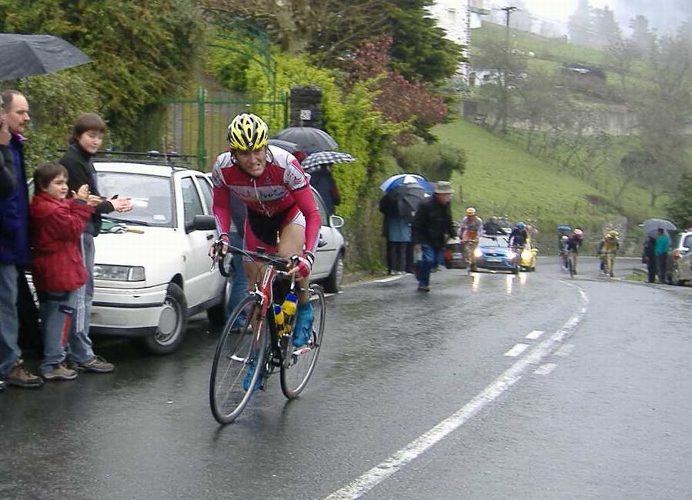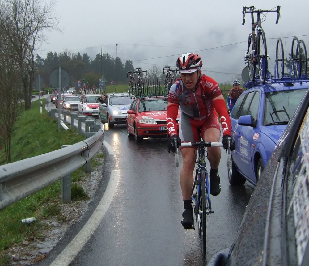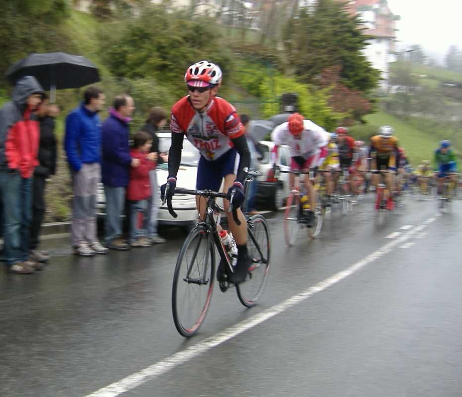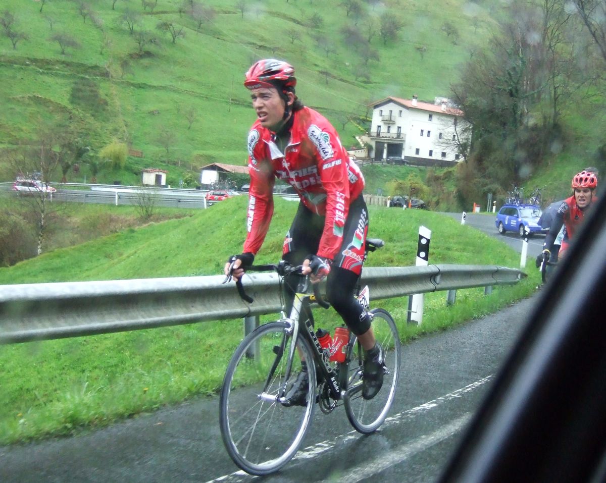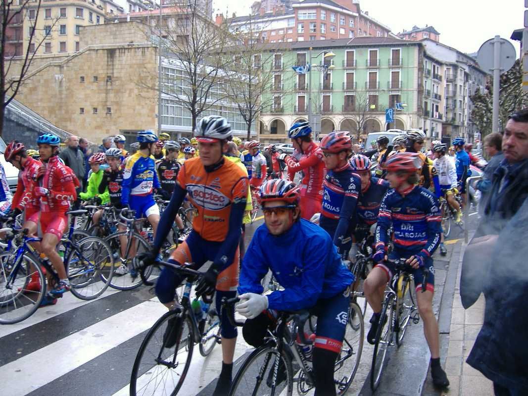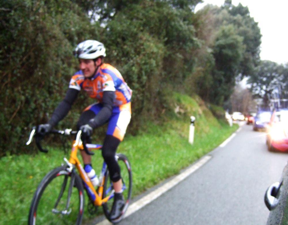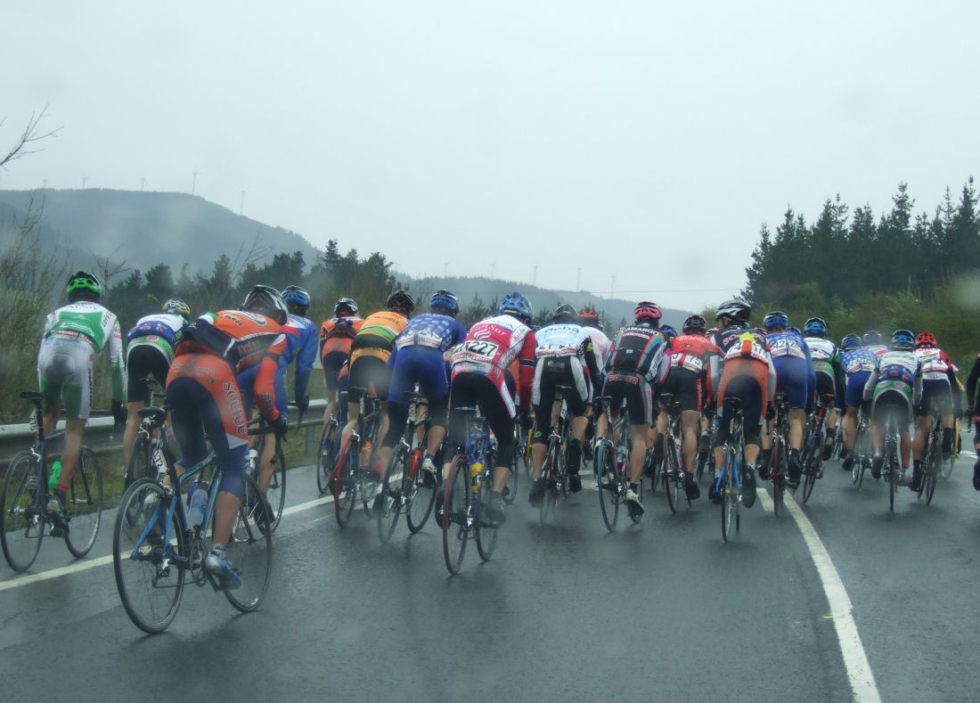 Al principio uno va bien, no es un frio excesivo, lluvia, tampoco pasa nada, primeros kms picando para abajo hacia Elgoibar, carretera muy mojada y resbaladiza, terreno donde se va muy deprisa. En ese terreno favorable pinchó Esteban y de lo rápido que se va por allí no pudo enganchar ni entre coches.