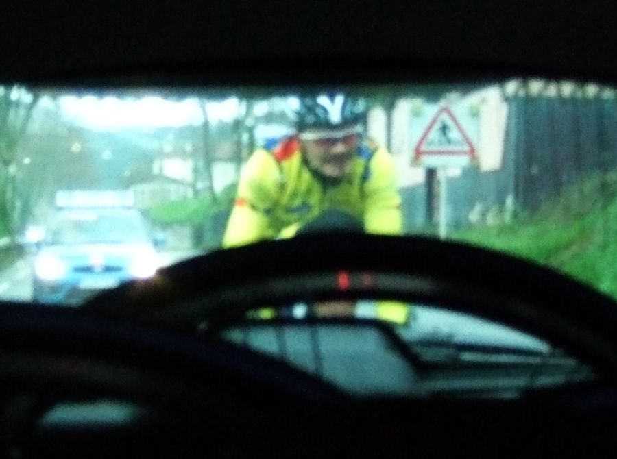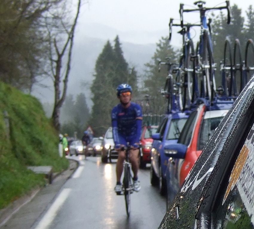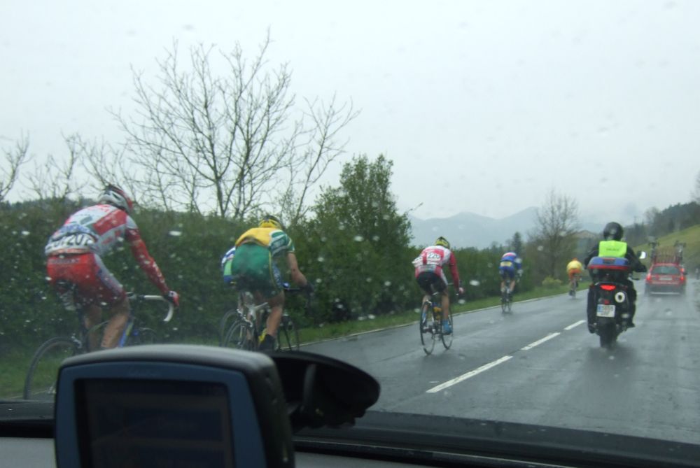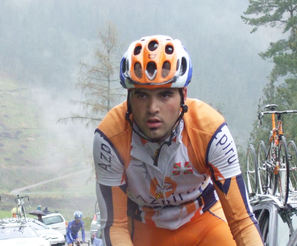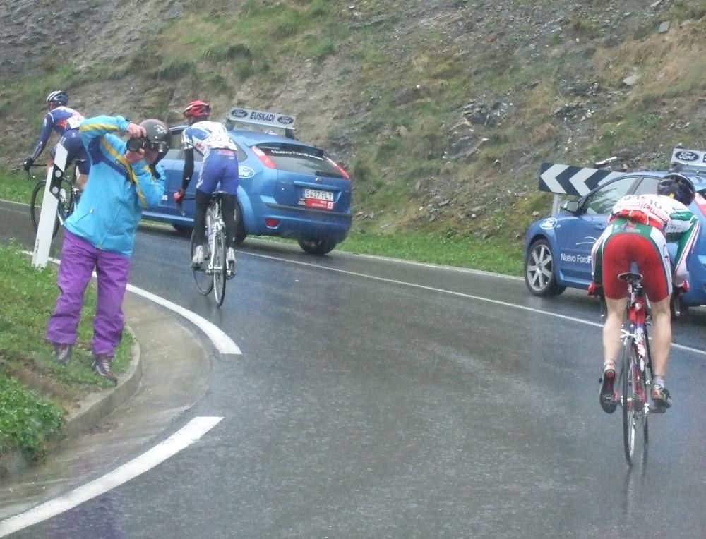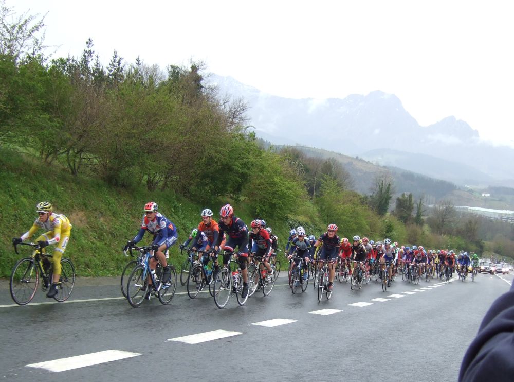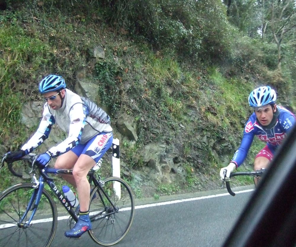 Al principio uno va bien, no es un frio excesivo, lluvia, tampoco pasa nada, primeros kms picando para abajo hacia Elgoibar, carretera muy mojada y resbaladiza, terreno donde se va muy deprisa. En ese terreno favorable pinchó Esteban y de lo rápido que se va por allí no pudo enganchar ni entre coches.