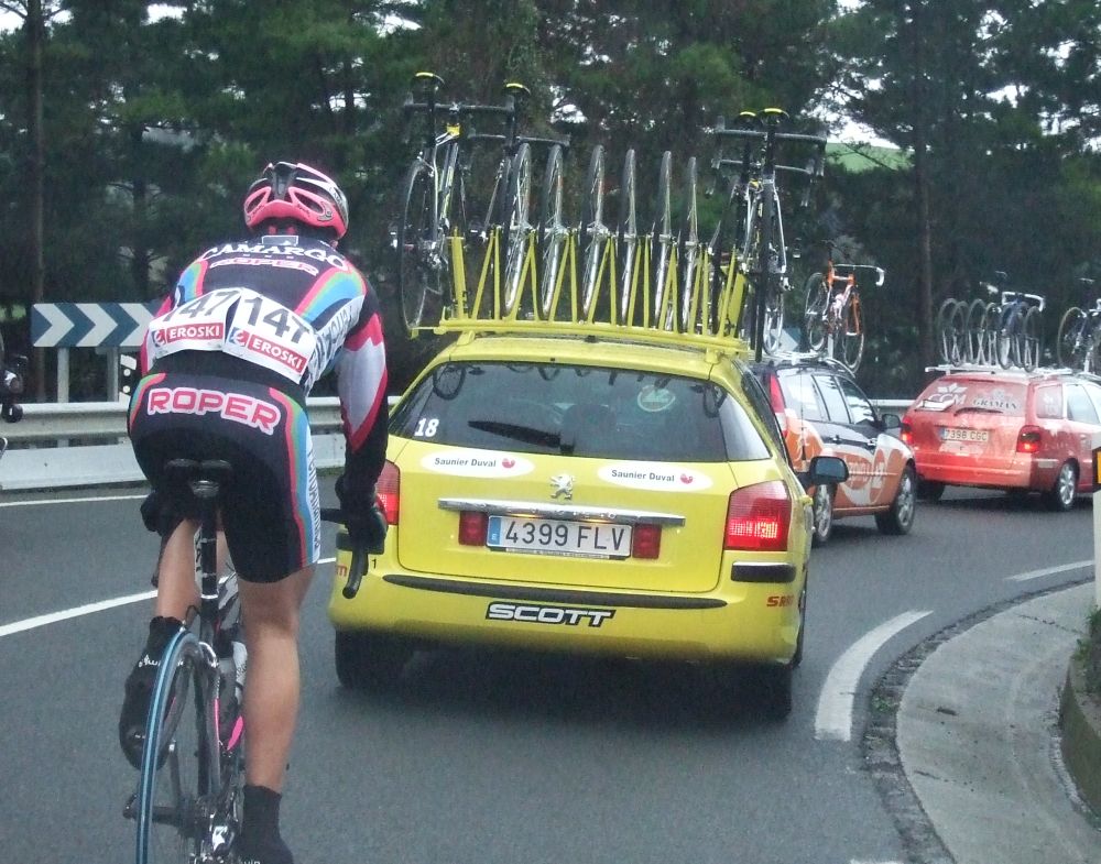 Nosotros nos quedamos a 200 metros de entrar con el pelotón en el inicio de Osma, fue una lástima porque subiendo Osma si que iba bastante bien, estuve ahi apunto de entrar en la fila de coches pero tensaron y ya no pude contactar, acabe subiendo con Andujar y un Azysa, cogimos al francés coronando, que iba ya tranquilo, en el siguiente repecho ya nos dijeron que estabamos fuera de tiempo, allí estaban ya el Mokete y el Laguna parados, -Moquete!! Me jodiste la apuesta!!.