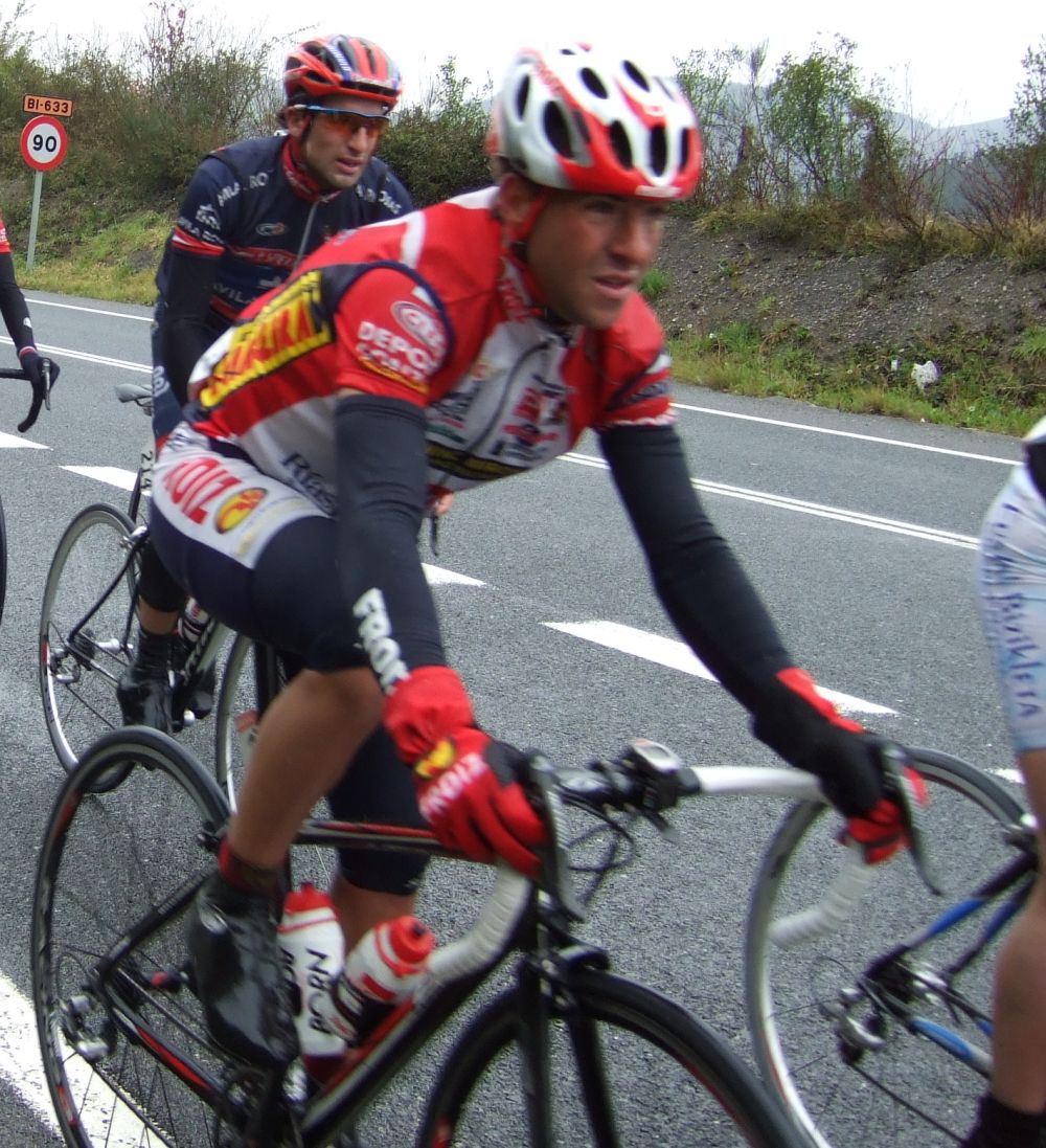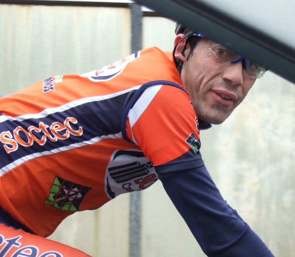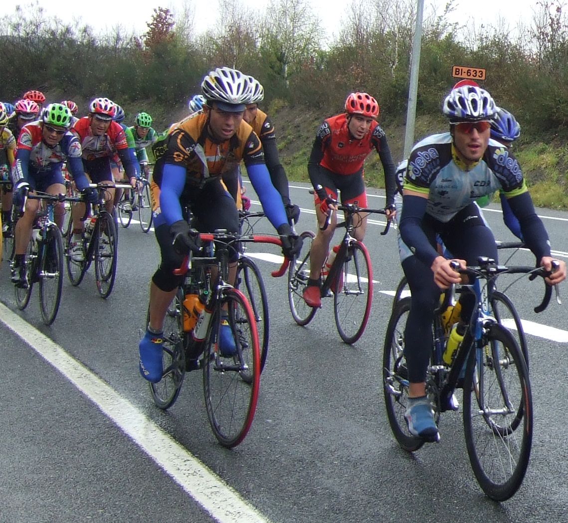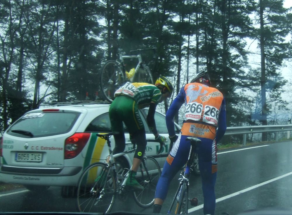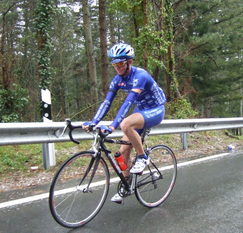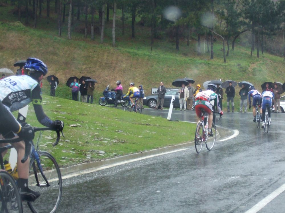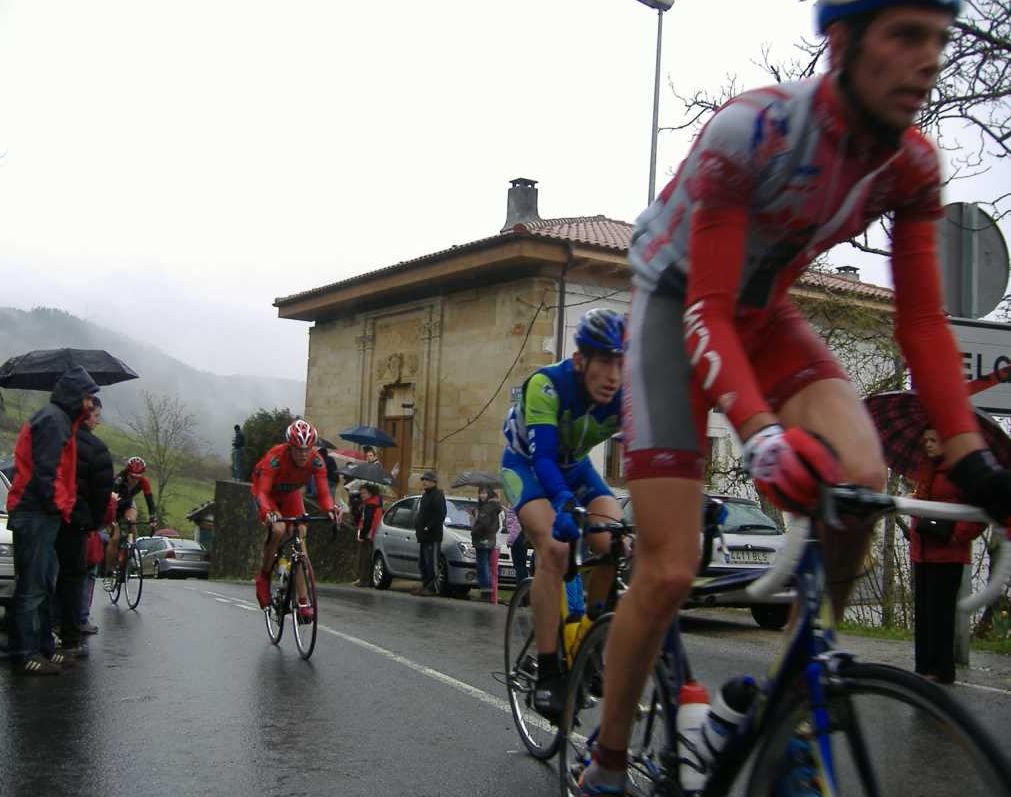 Pero Diego iba el hombre tiritando que no controlaba sin chubasquero, sin guantes largos, como si esto fuera una bulería de las que te llueven y no pasa nada, pero aqui si pasaba, aunque uno del Telcom salió el tio en culote corto y mallot corto, decía que estaba acostumbrado, eso cada uno y su aguante. Por fin acabé Elgueta después de perder muchos puestos y hueco con el pelotón, ibamos remando alli un grupillo cuando nos pasa el Puertas a una ostia, donde iba??, enganchó con el grupo que iba delante de nosotros que si entró en el pelotón.