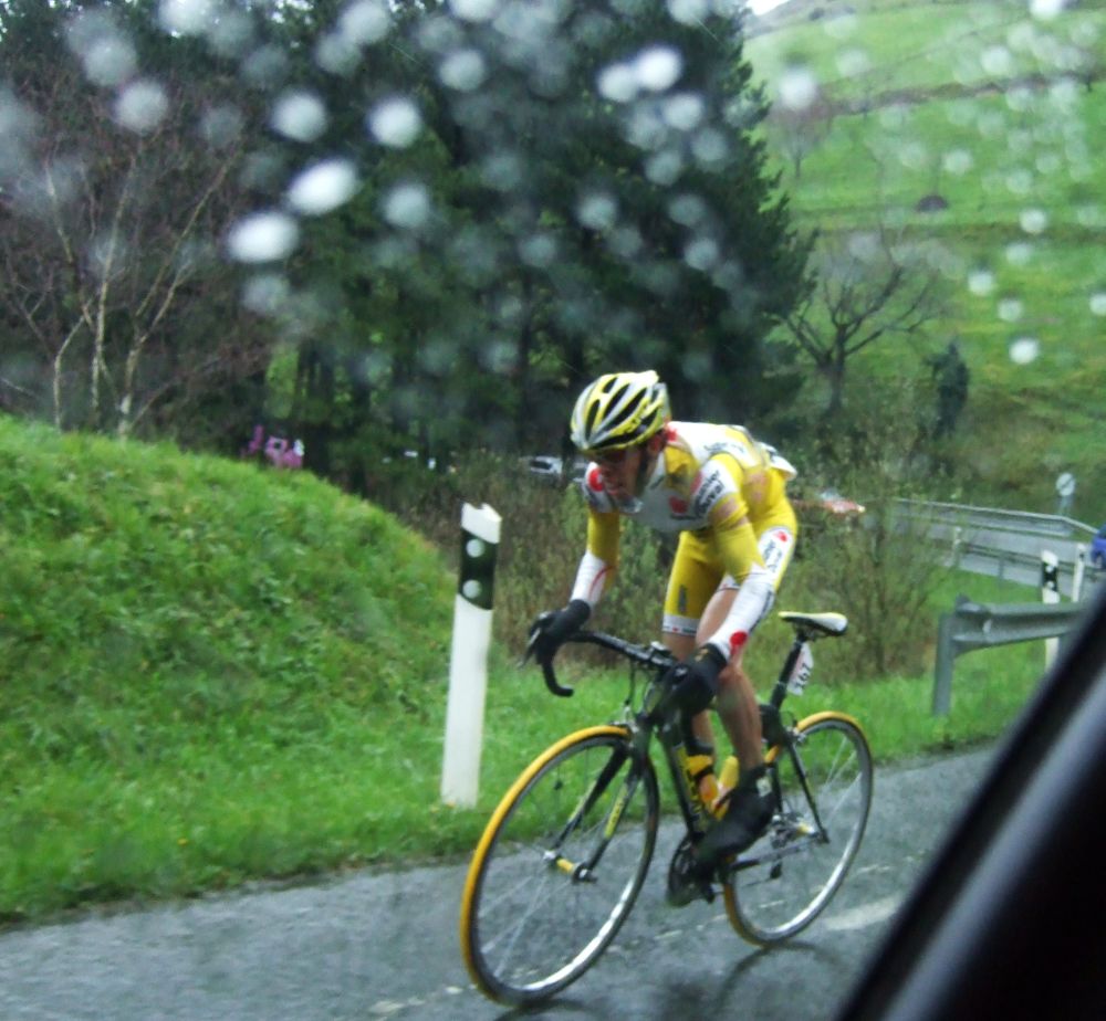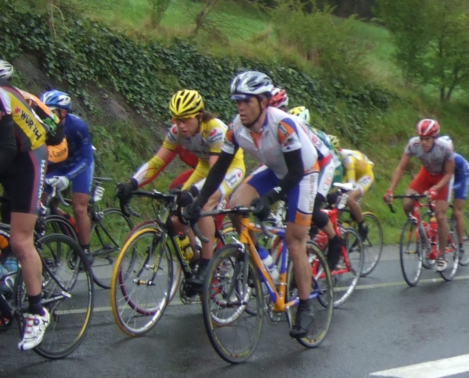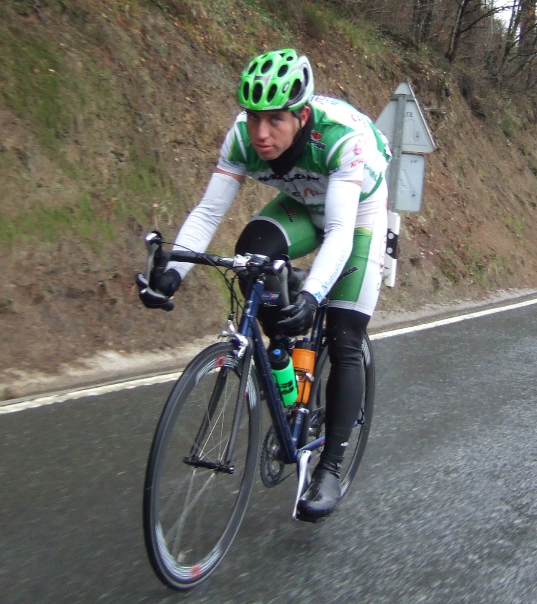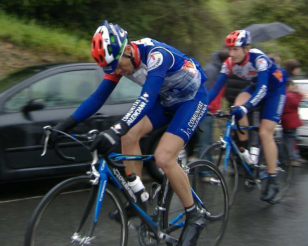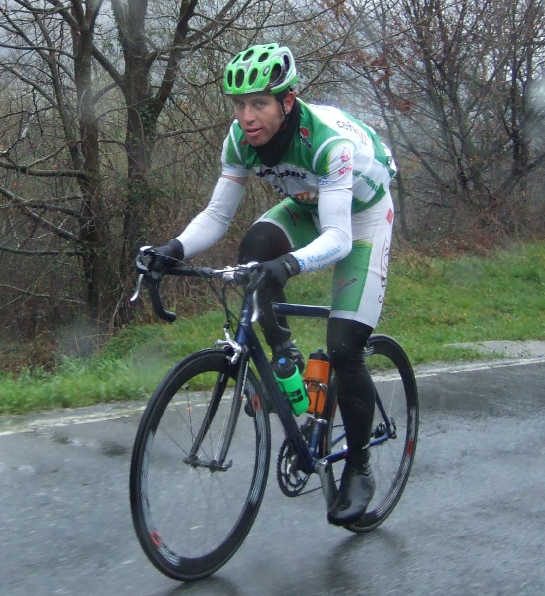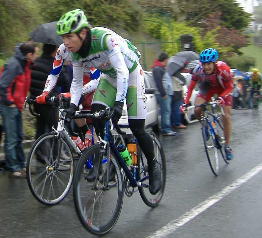 Pero Diego iba el hombre tiritando que no controlaba sin chubasquero, sin guantes largos, como si esto fuera una bulería de las que te llueven y no pasa nada, pero aqui si pasaba, aunque uno del Telcom salió el tio en culote corto y mallot corto, decía que estaba acostumbrado, eso cada uno y su aguante. Por fin acabé Elgueta después de perder muchos puestos y hueco con el pelotón, ibamos remando alli un grupillo cuando nos pasa el Puertas a una ostia, donde iba??, enganchó con el grupo que iba delante de nosotros que si entró en el pelotón.