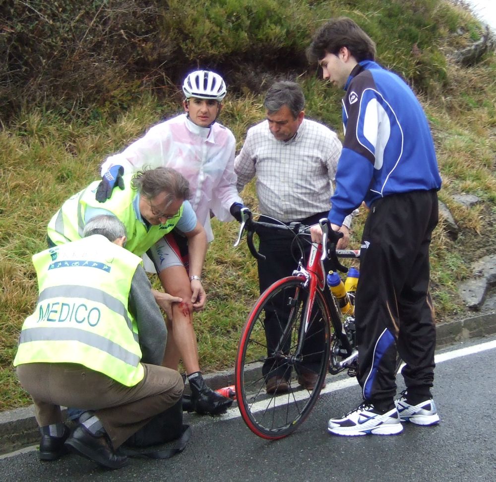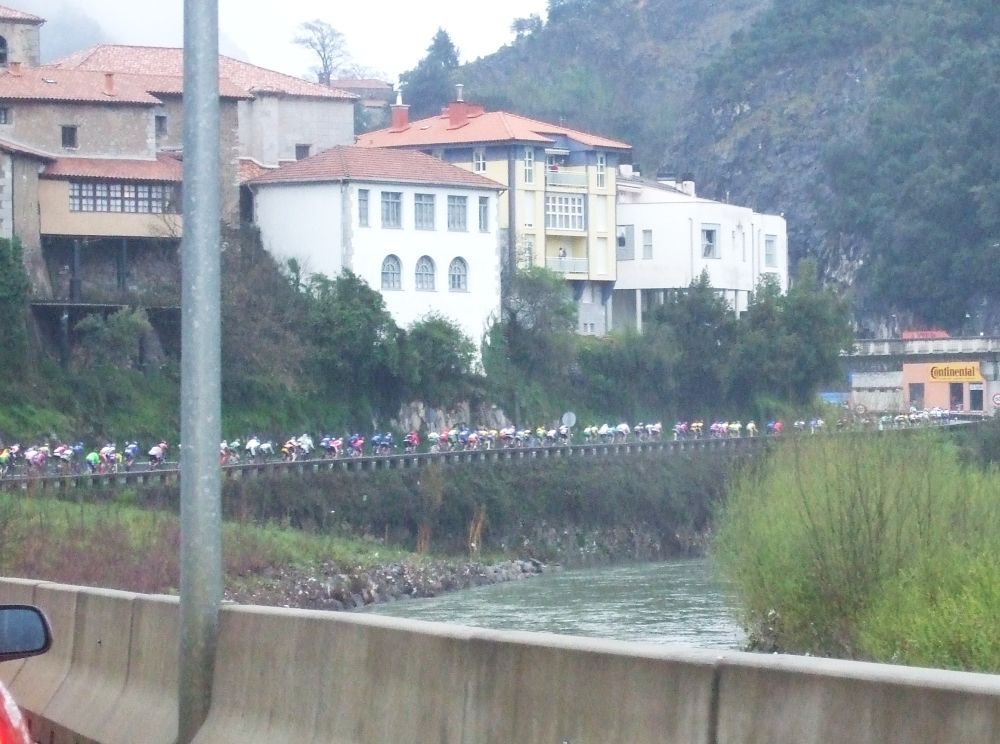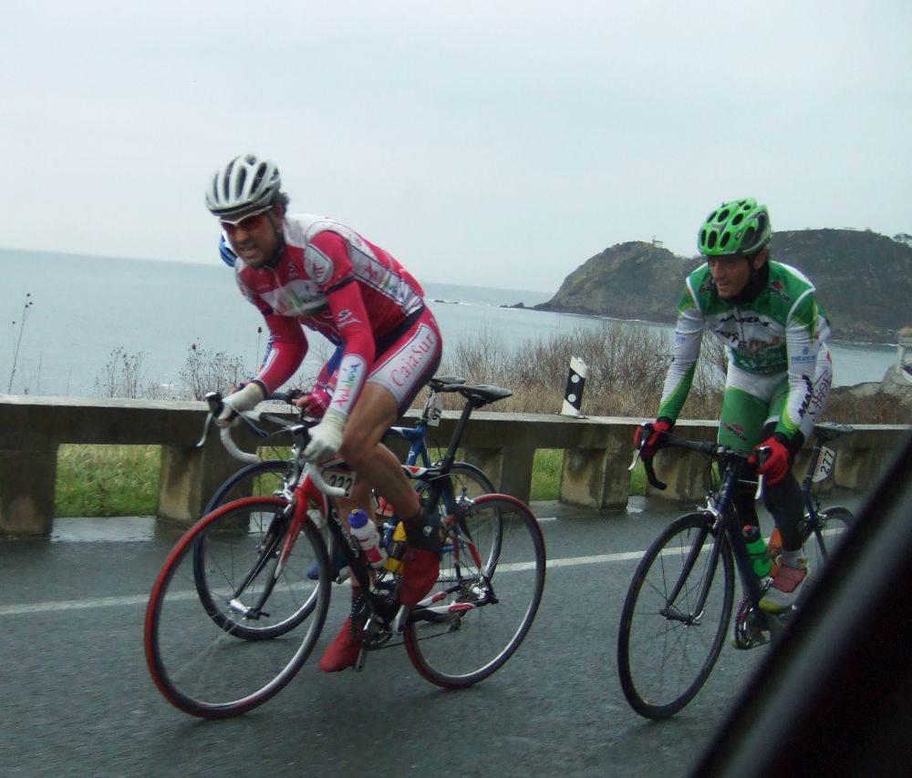 Meagas se bajó rapidillo con la carretera mojada y llegamos a la zona de las playas y acantilados, un látigo inicial por alli después de descender y me puse a buscar mas escapadas, que esta era una zona donde podía hacerse, iban 3 o 4 delante, pero eso no era la escapada, eso eran los que si aguantaban por delante les pillaría la escapada. Subiendo un repecho de los de la playa hubo una caida justo al lado mía, no la pillé de milagro, el Fleki fue uno de los afectados, no fue nada pero ya tuvo que abandonar.
