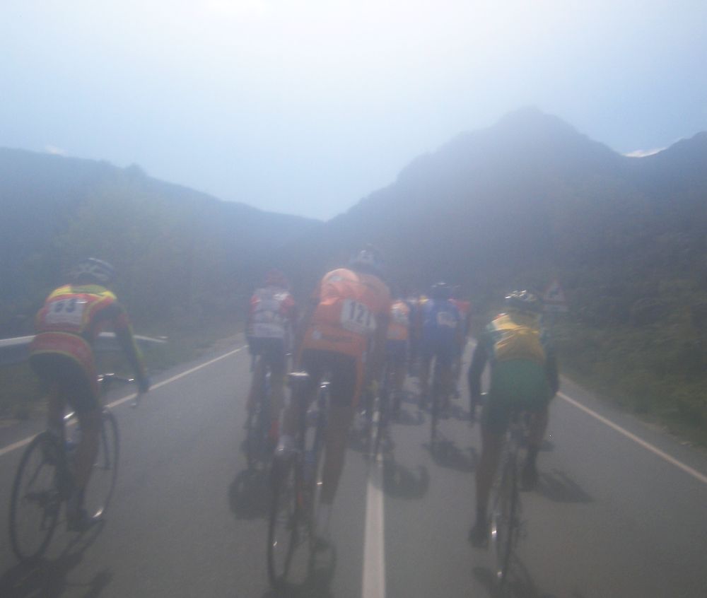 Primeros compases de la carrera, no ataca nadie, todos con miedo, un puerto por delante, cierta tranquilidad, curva a la izquierda y primeras rampas del puerto, se aviva el ritmo, pero a rueda se va bien, nubes de tormenta al fondo, negrisimas, vamos camino de ellas, camino de la boca del lobo, daban tanta impresión que me tomé el lujo de sacarlas una foto desde mi posición dentro del pelotón.