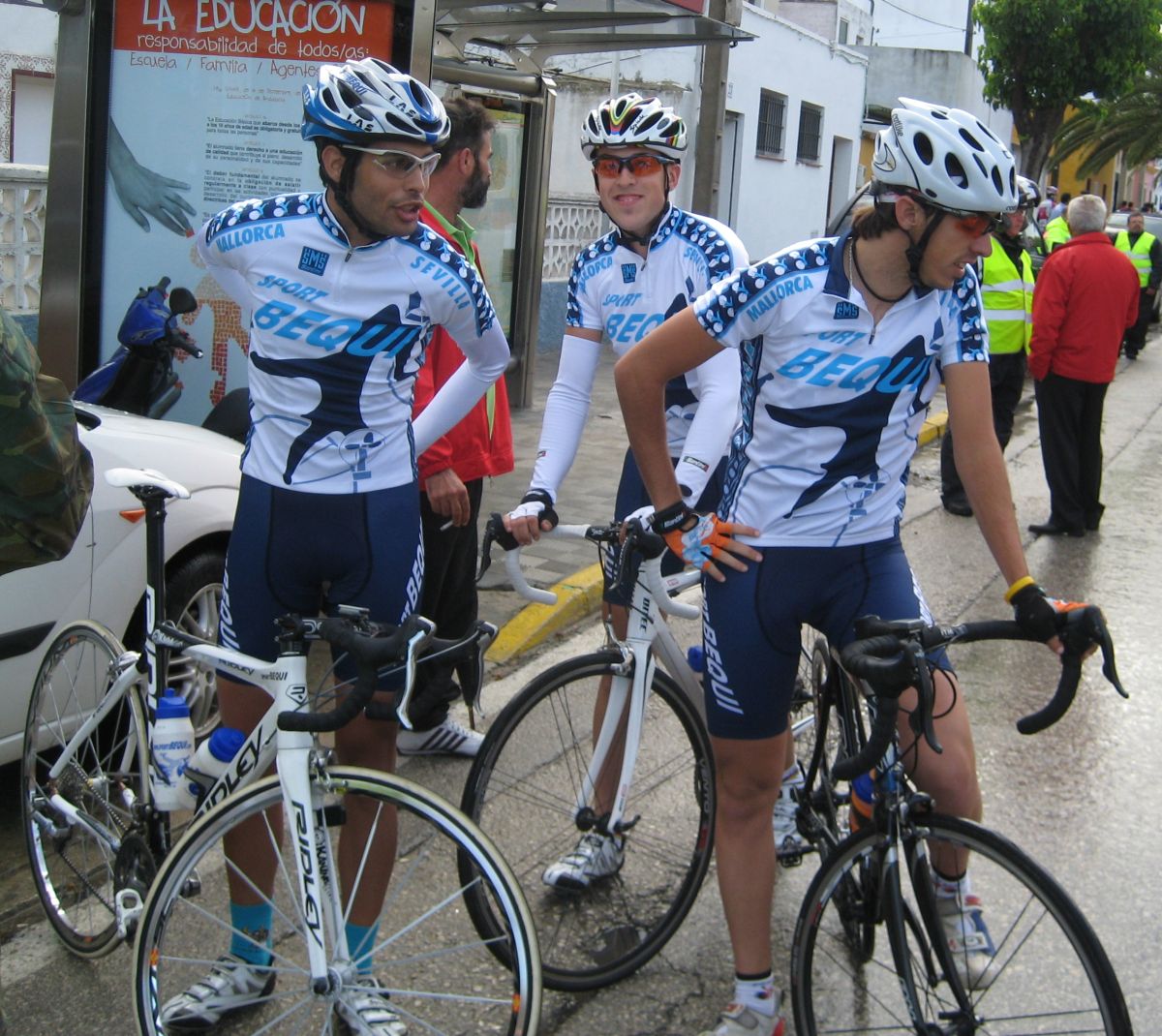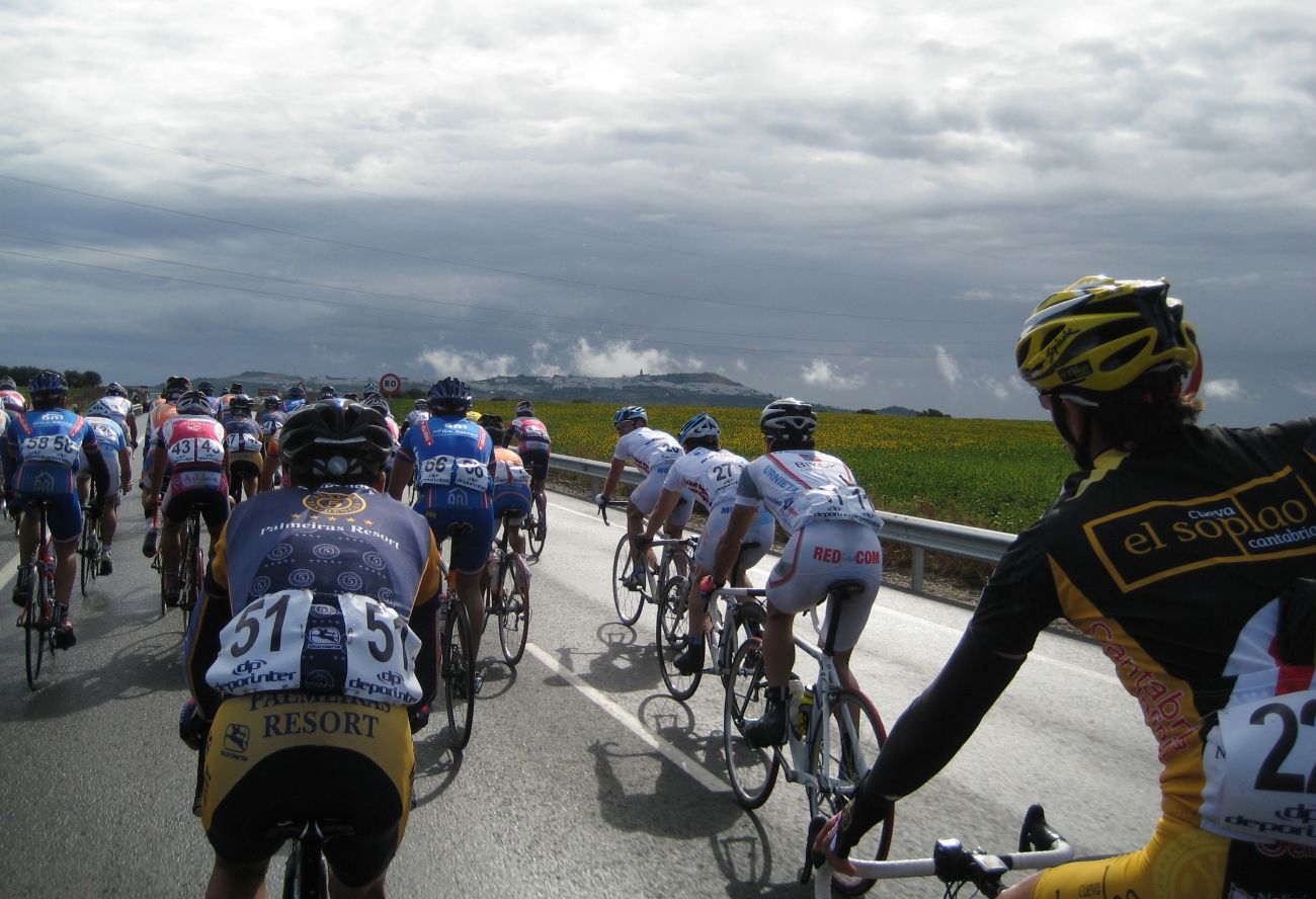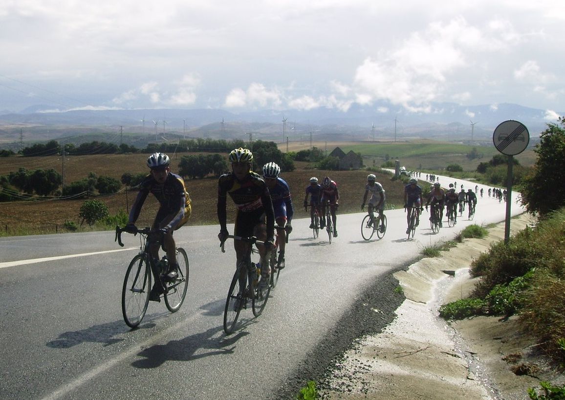 Salida lluviosa en Chiclana, había estado cayendo por la mañana para que salieramos deprimidos, pero poco a poco fue aclarando y tuvimos cierta suerte. Primeros kms camino de Medina Sidonia, el primer puerto del día, que este año estaba bastante pronto, sienta bastante mal en el km 30 subir el tarugon ese, yo salí a muchos cortes y vi que no llevaba el gas del día anterior, iba perjudicadillo de la remada con el Ruzafa, que me había sacado mucho de punto.