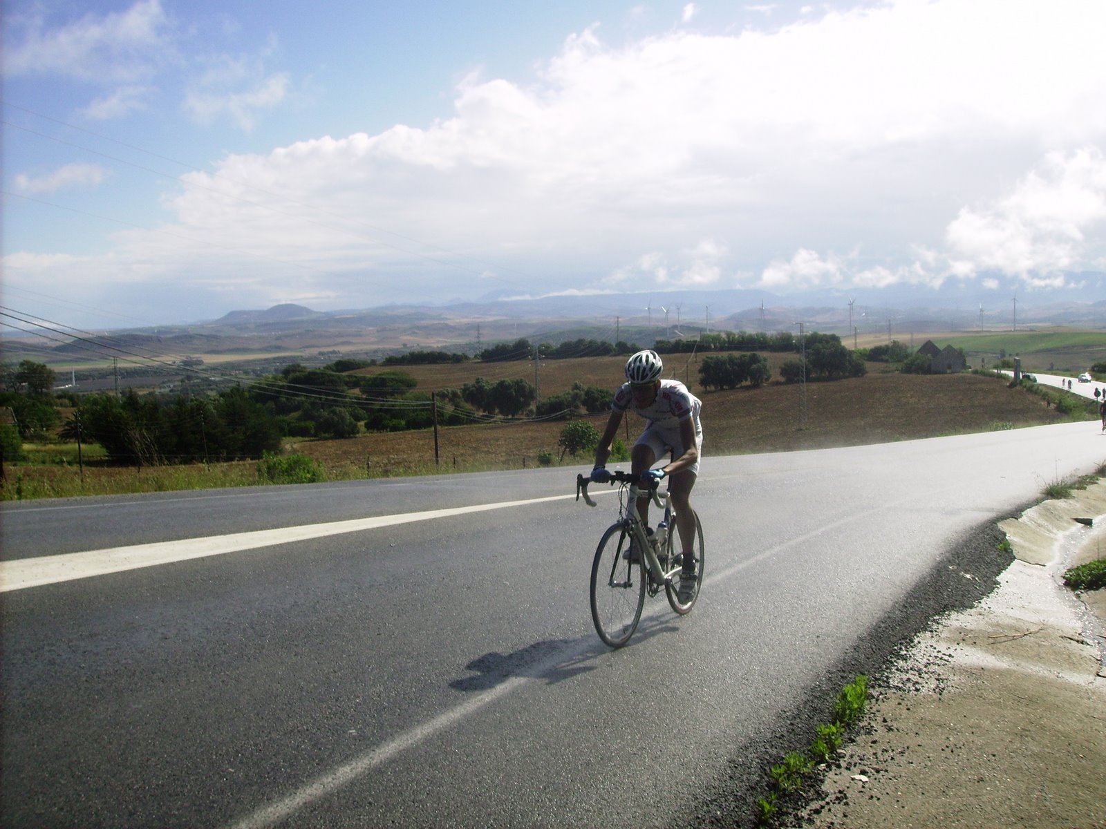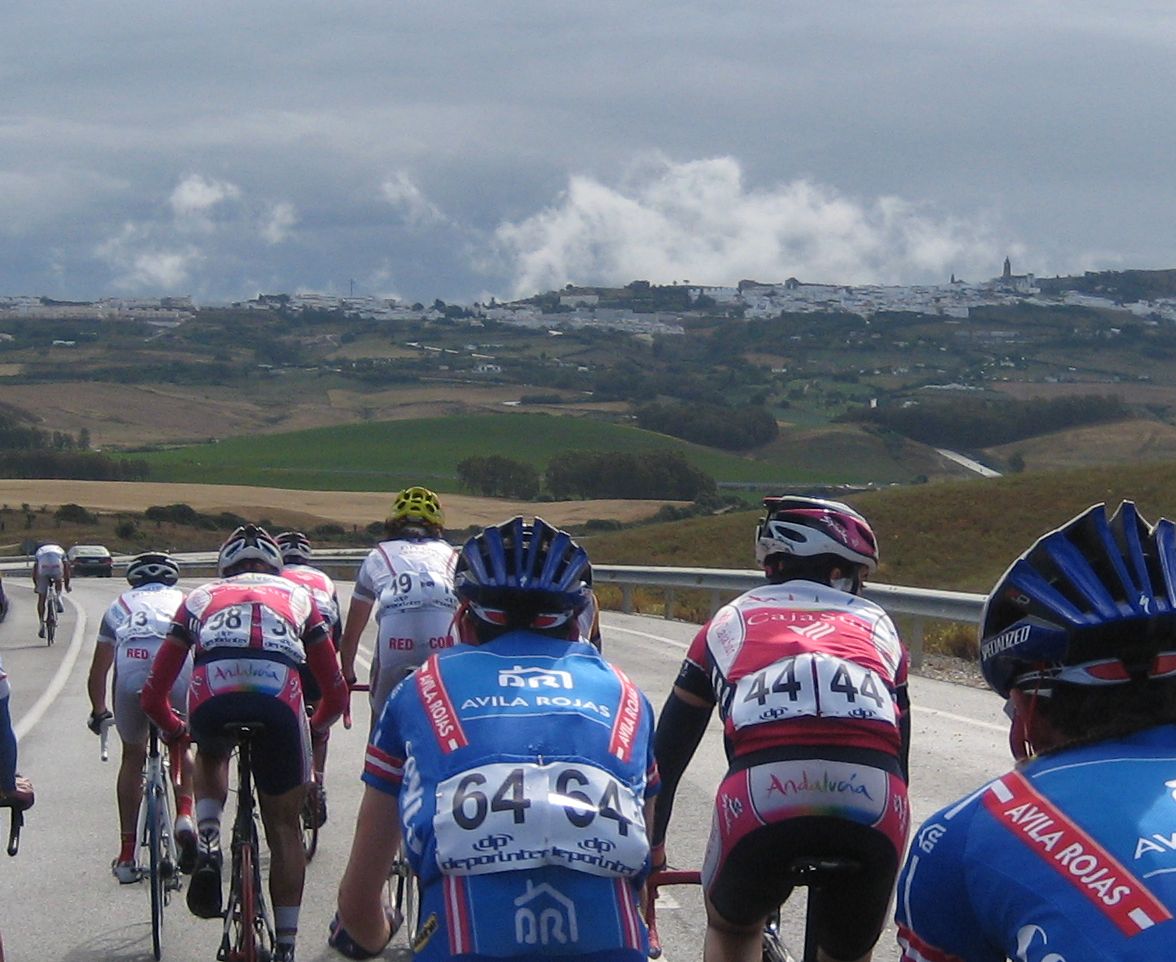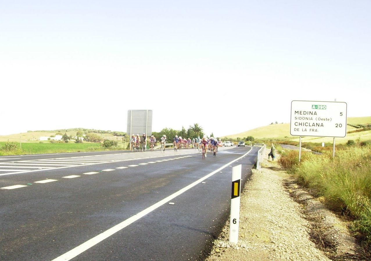 En un repecho de cierta envergadura el Abeja arranco fortisimo y formó un corte, yo acojonado salí tarde y tuve que pegarme una serie para entrar, que buff,, ya entró todo el pelotón pero menudo calentón mas malo, nos seguiamos acercando al puerto de Medina Sidonia y yo tenía muy malas sensaciones. Bordeamos Medina y subimos por detrás, como se iba en los repechos anteriores al puerto, rápidisimo, los portugueses andaban bastante, empezamos el puerto, el muro.. alli salvese quien pueda, se rompió todo, yo sufriendo bastante, coroné con un grupillo, pasé al Francés, que iba pinchado, pinchó en el peor momento.